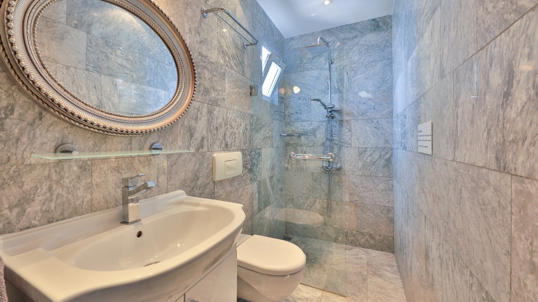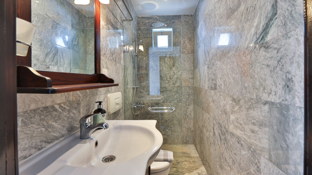 There is a second room with a single bed on the lower level, half a floor height from the ground floor. There is also a bathroom and toilet in this room.