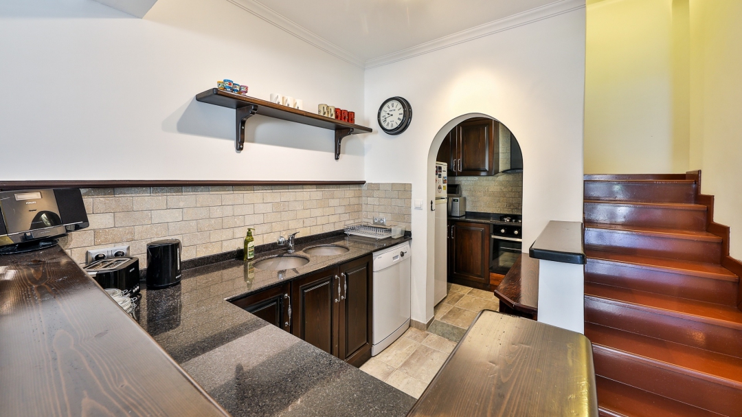 The kitchen, where delicious meals will be prepared at home, is located on the lowest floor of the building. From the kitchen there is an exit to a terrace where you can spend time under the sky and enjoy your meal.