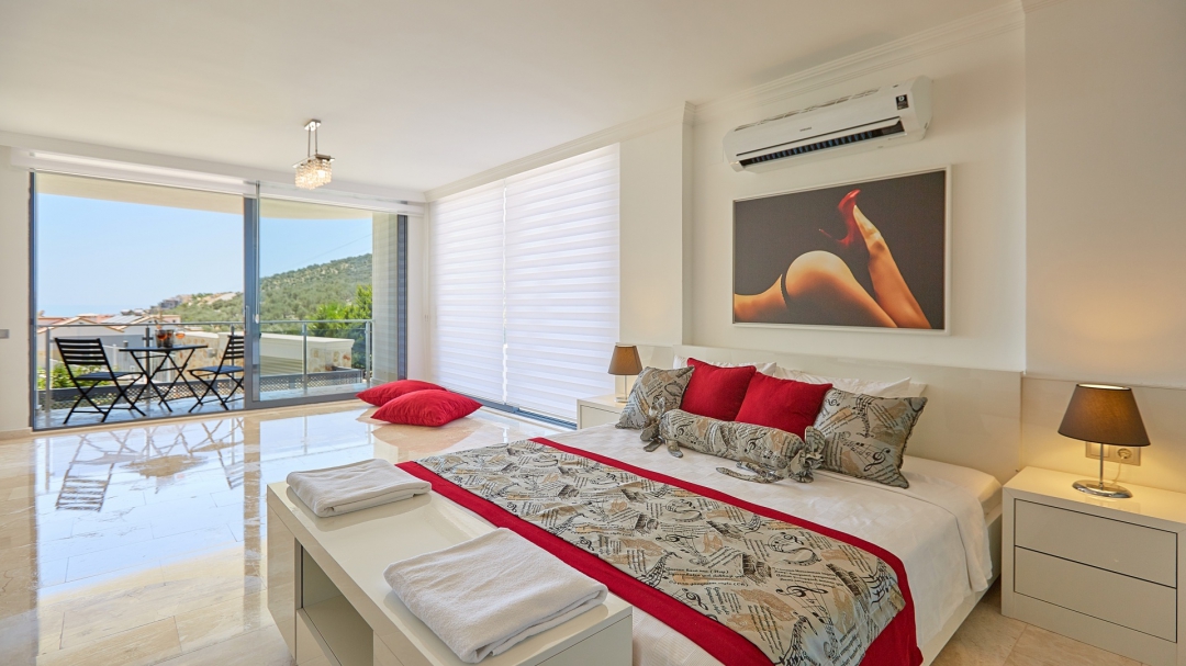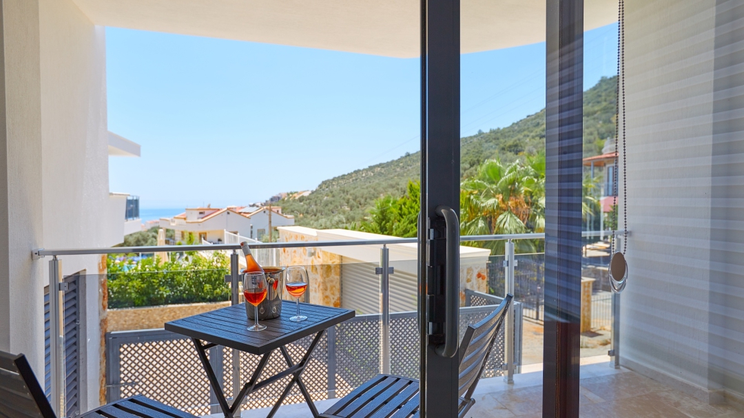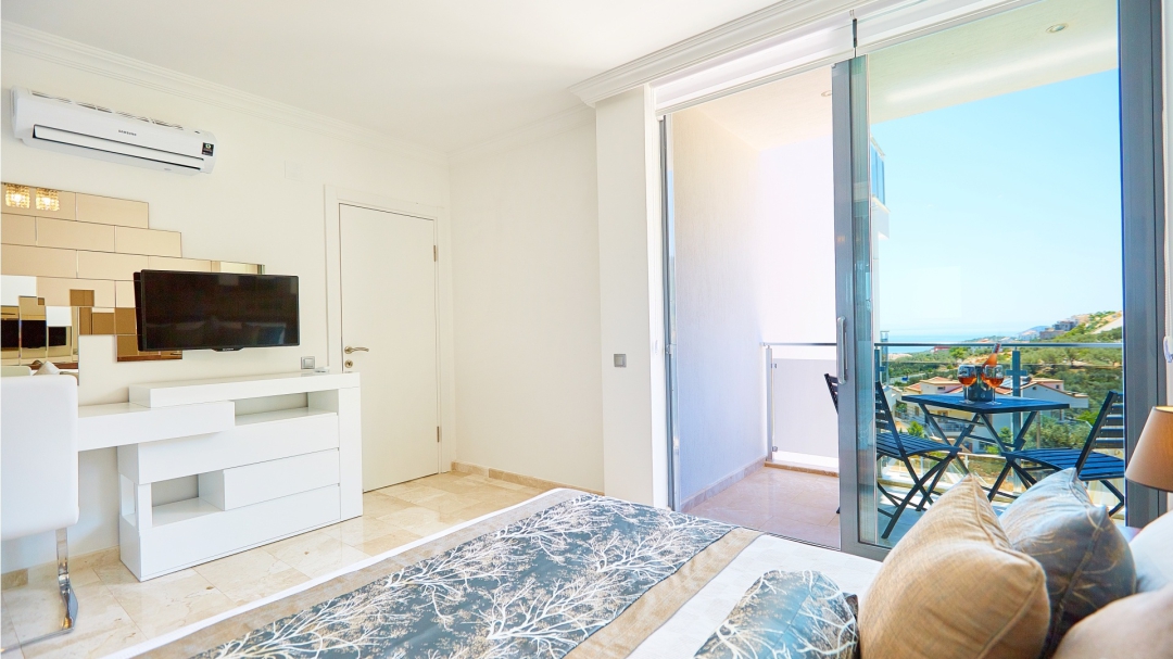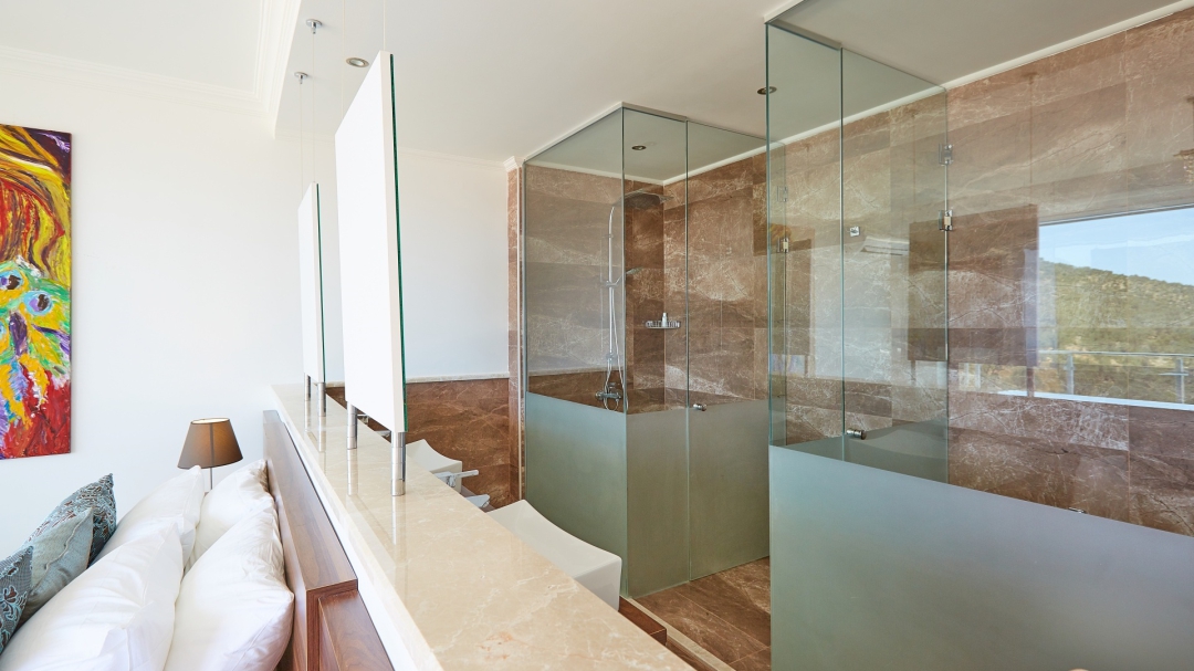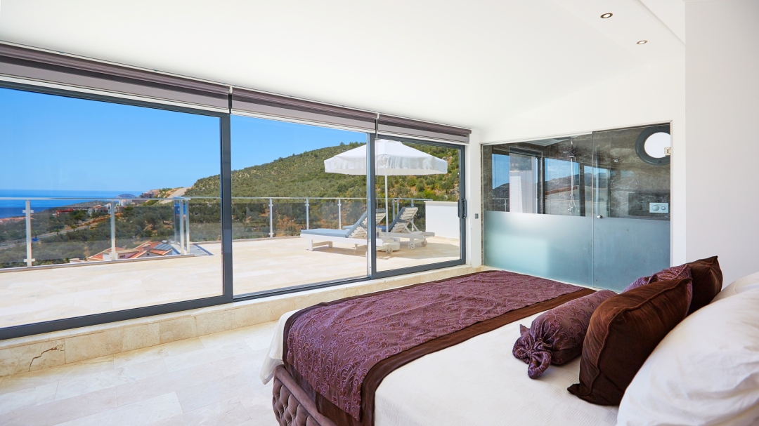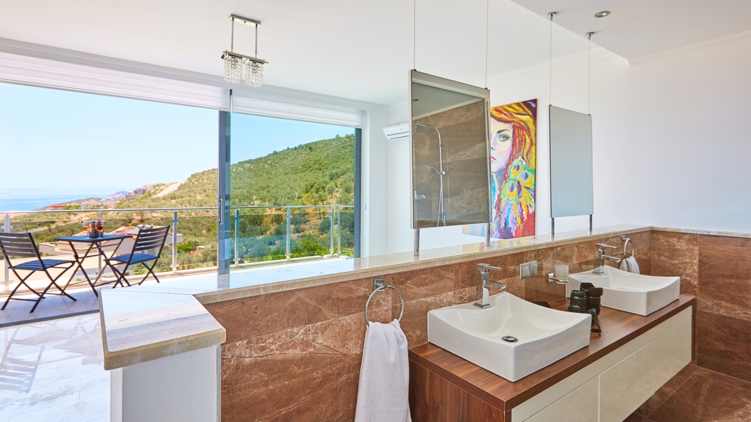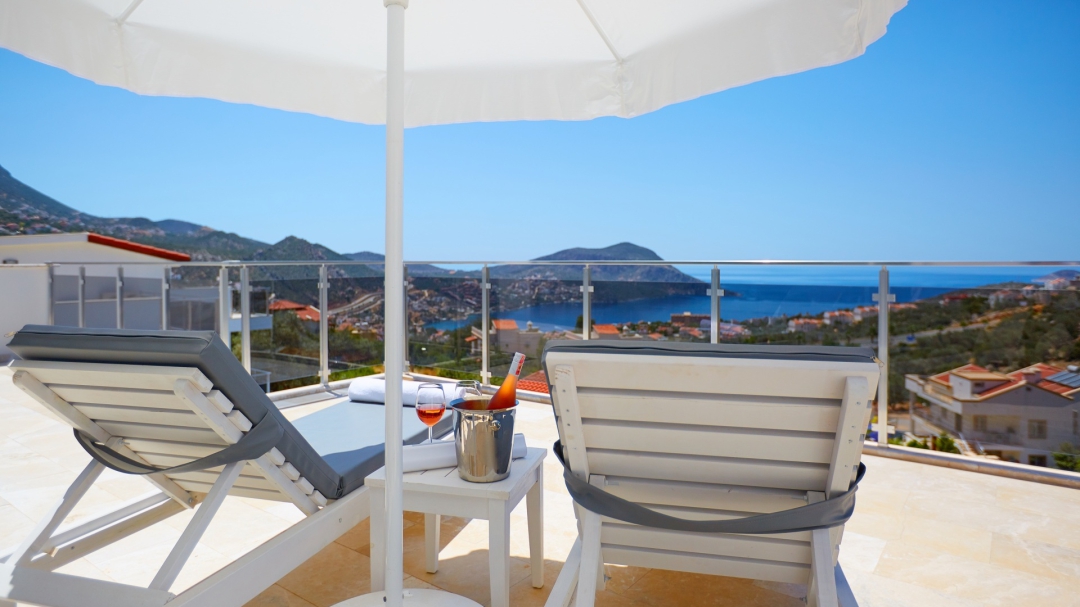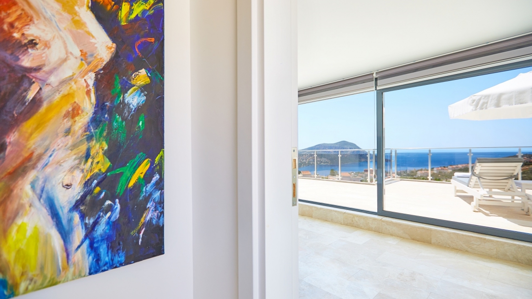 The loft consists of the last two bedrooms and a terrace. The bathroom of this room also has a bathtub. On the terrace in front of it, there are two sun loungers, chairs and a coffee table. It is the best place the villa has to offer to watch Kalkan and the sea.