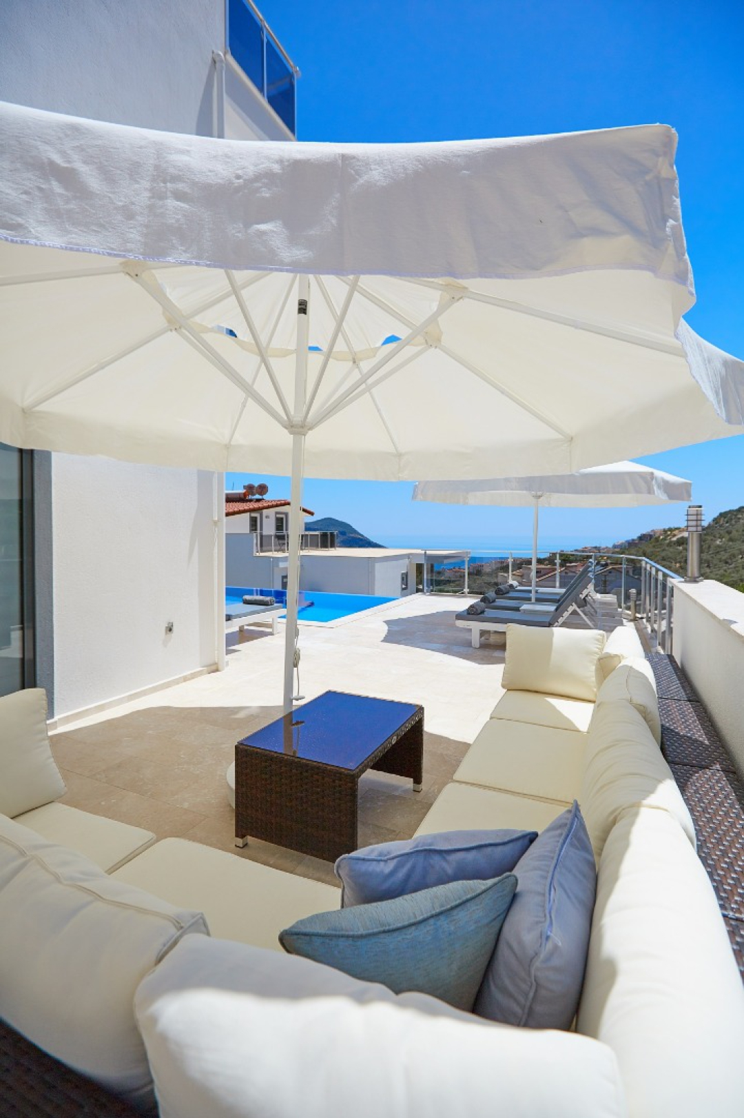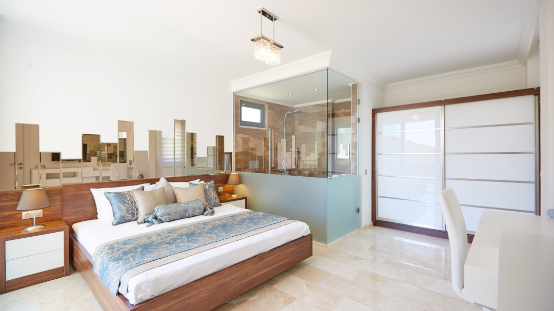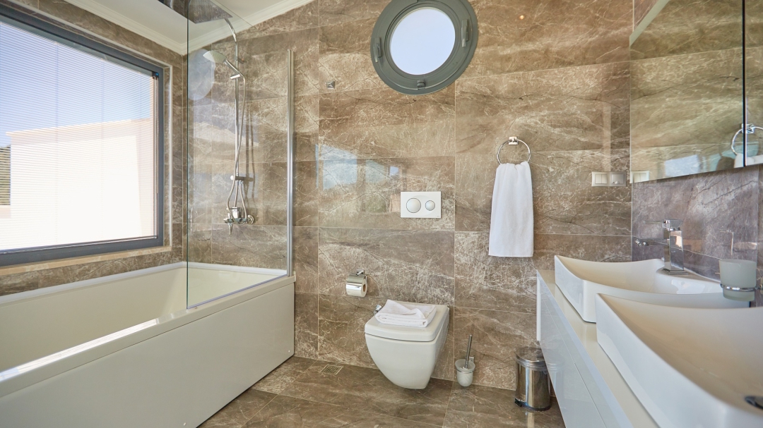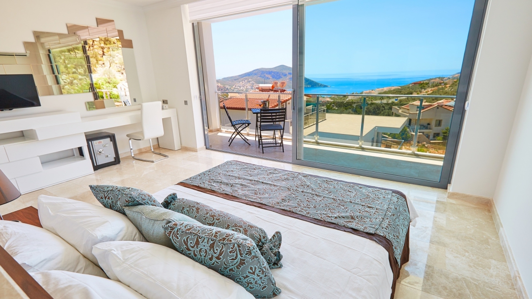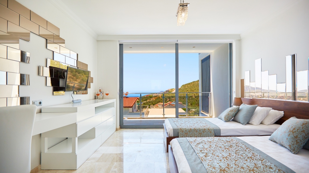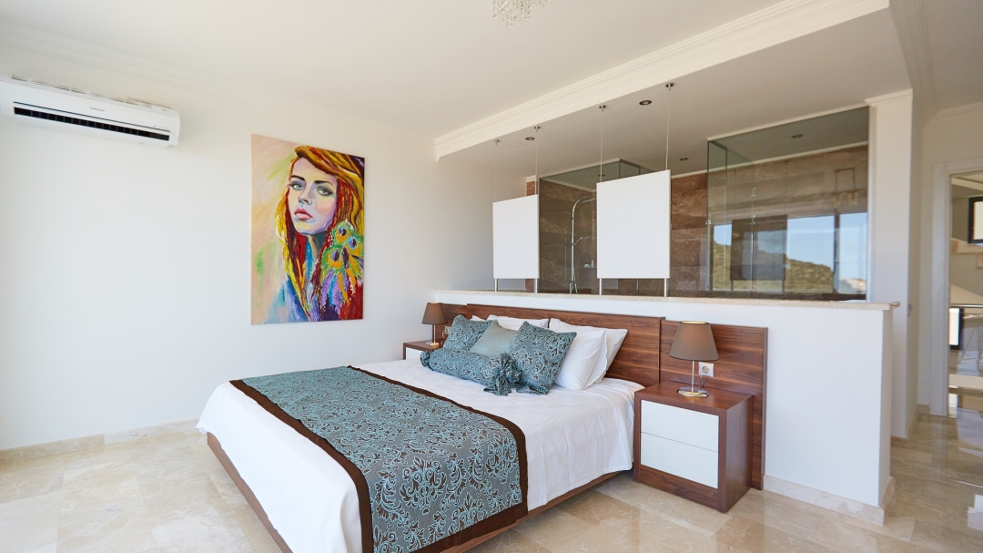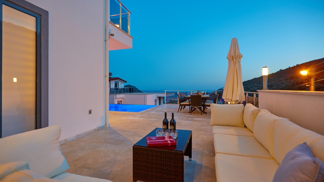 The loft consists of the last two bedrooms and a terrace. The bathroom of this room also has a bathtub. On the terrace in front of it, there are two sun loungers, chairs and a coffee table. It is the best place the villa has to offer to watch Kalkan and the sea.