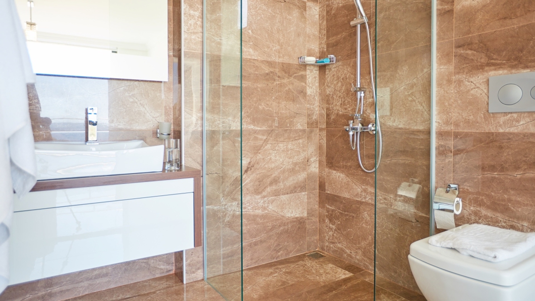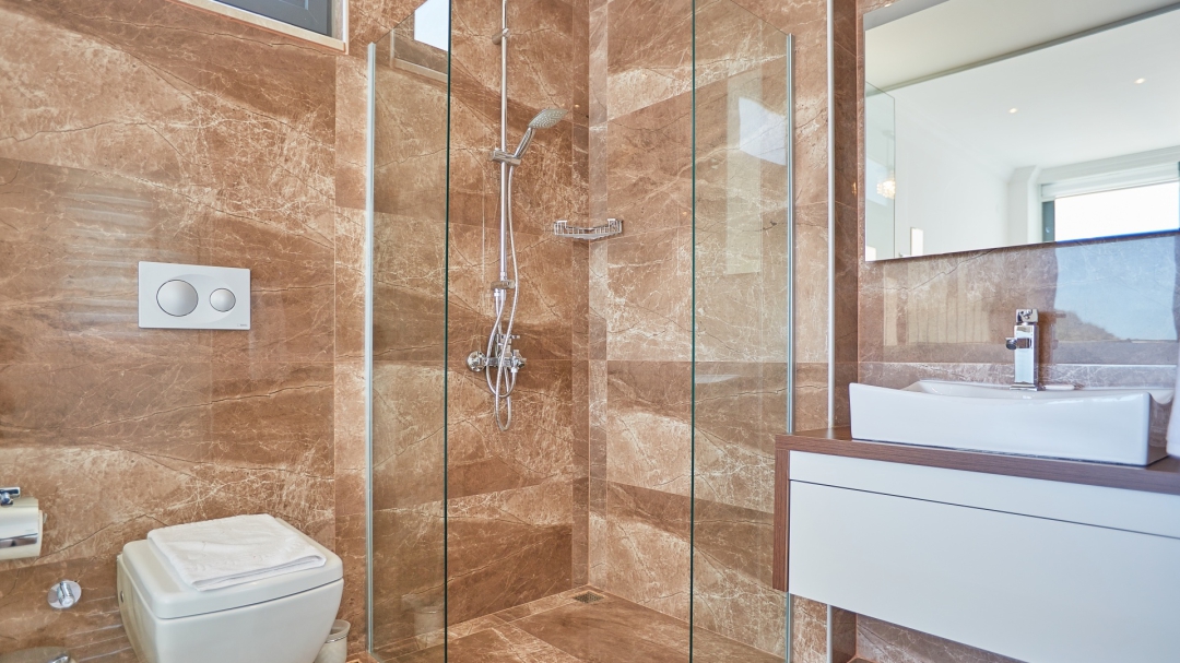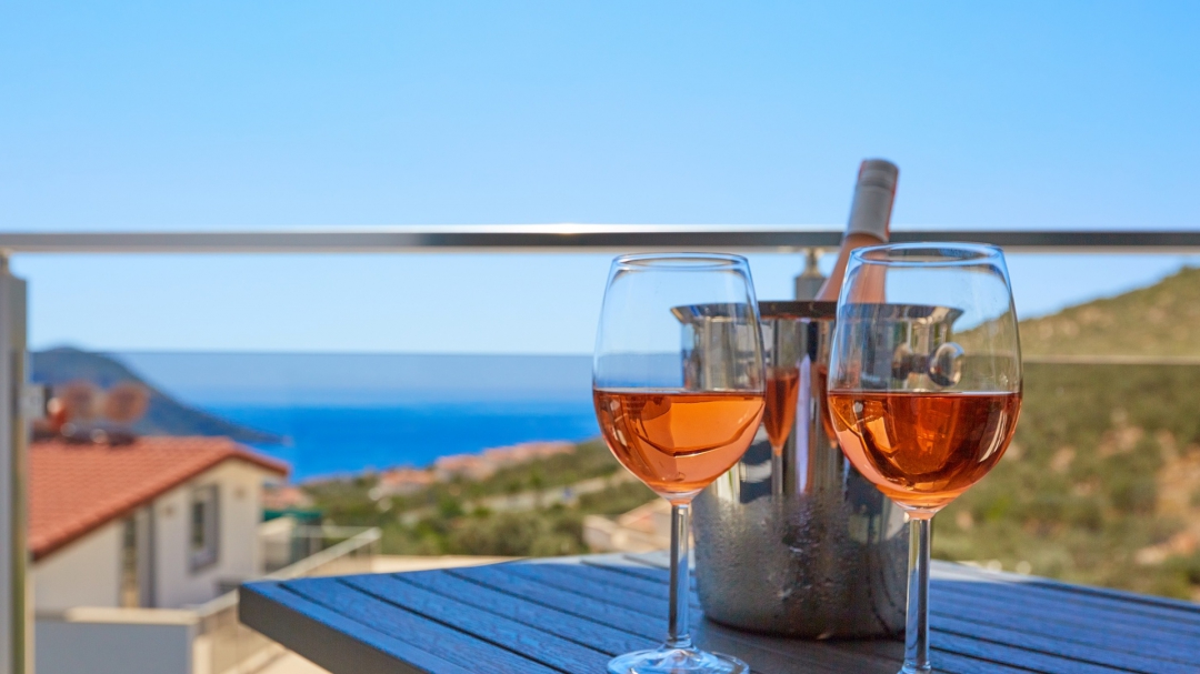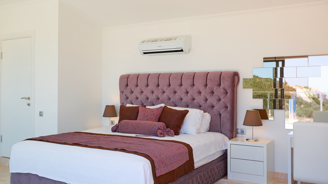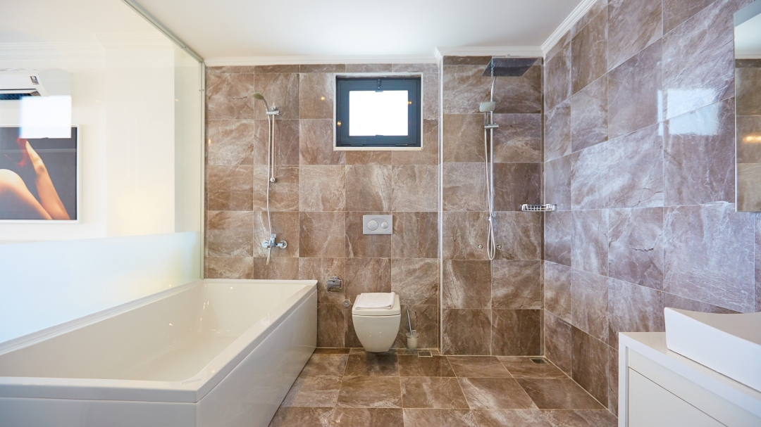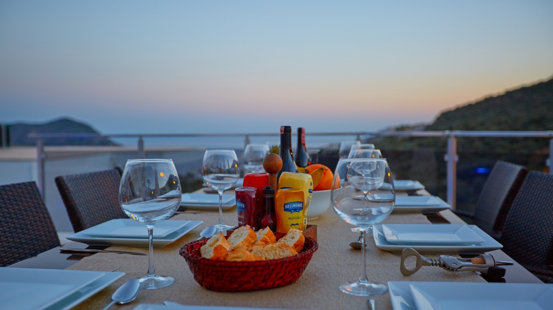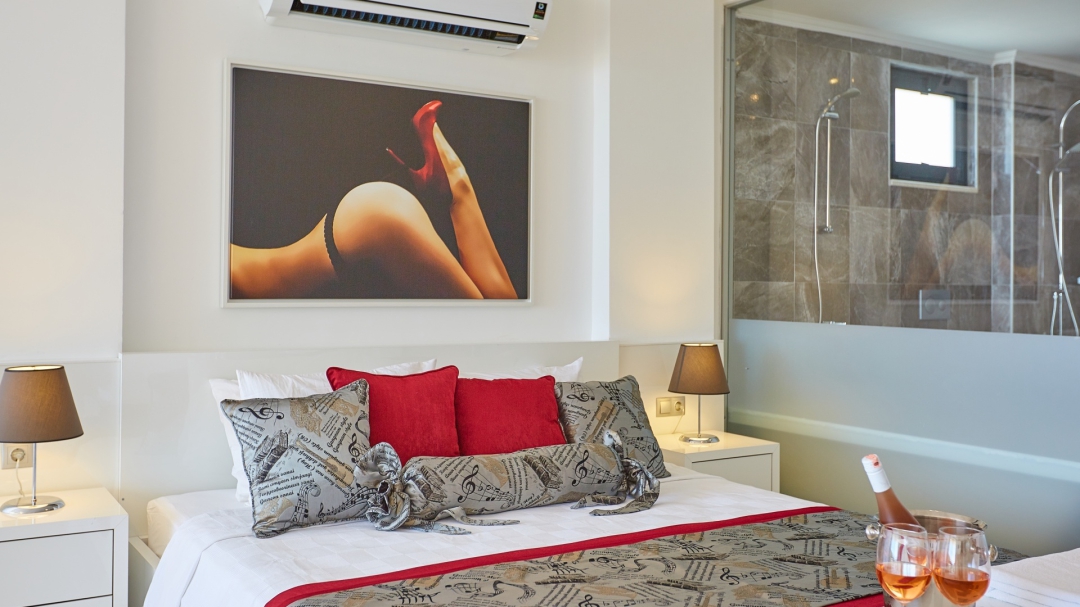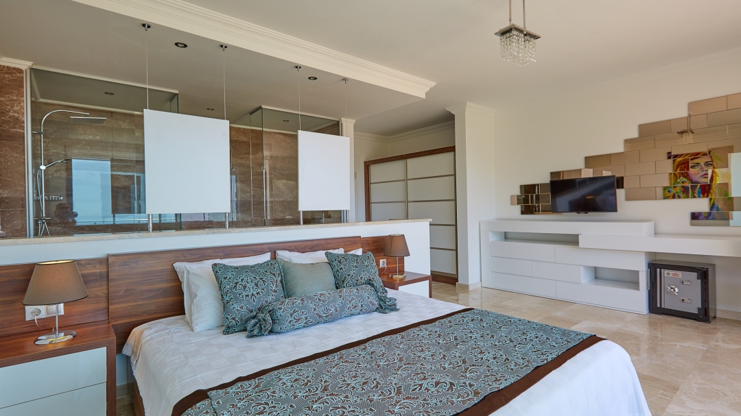 The loft consists of the last two bedrooms and a terrace. The bathroom of this room also has a bathtub. On the terrace in front of it, there are two sun loungers, chairs and a coffee table. It is the best place the villa has to offer to watch Kalkan and the sea.
