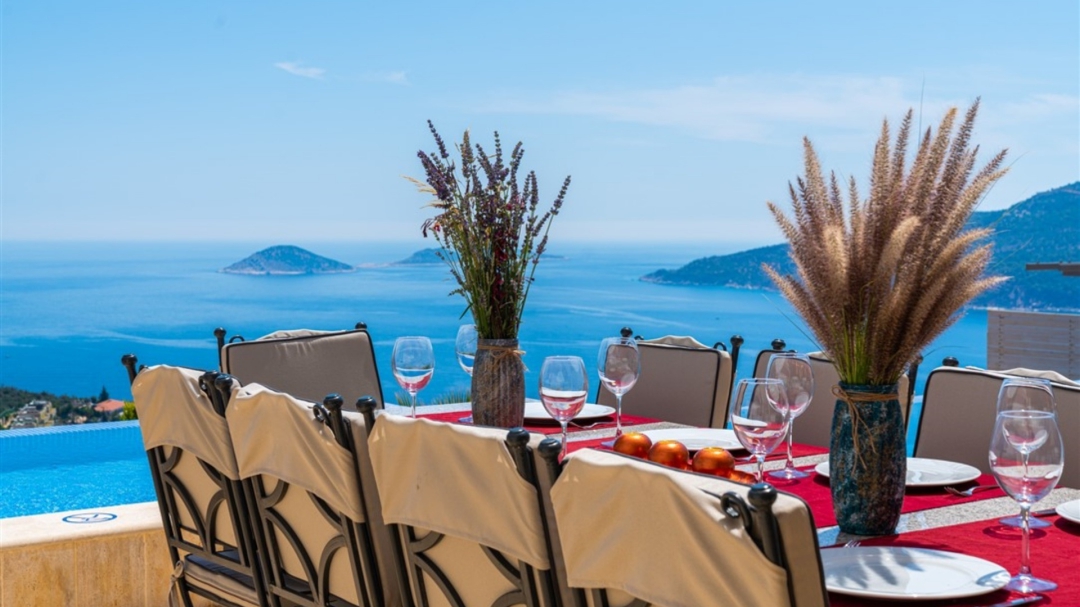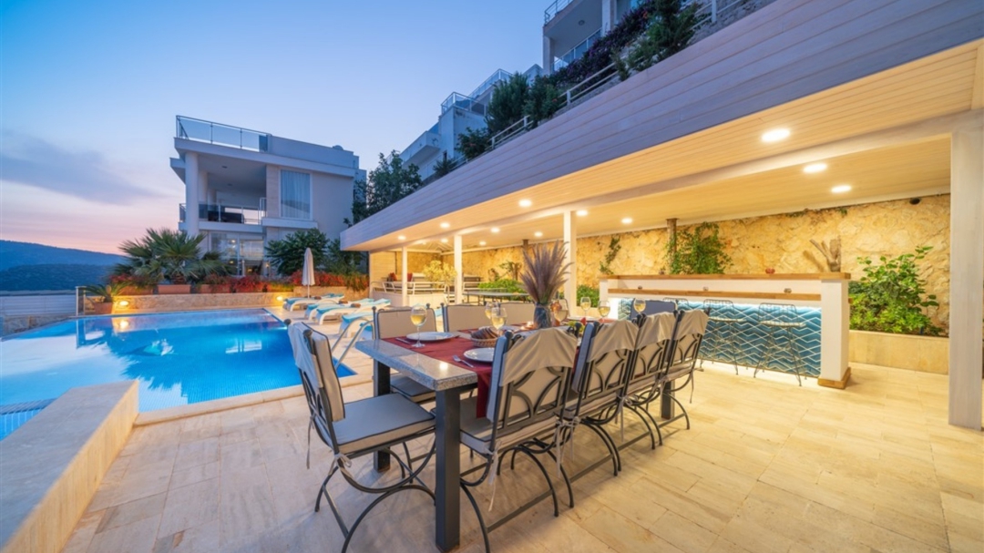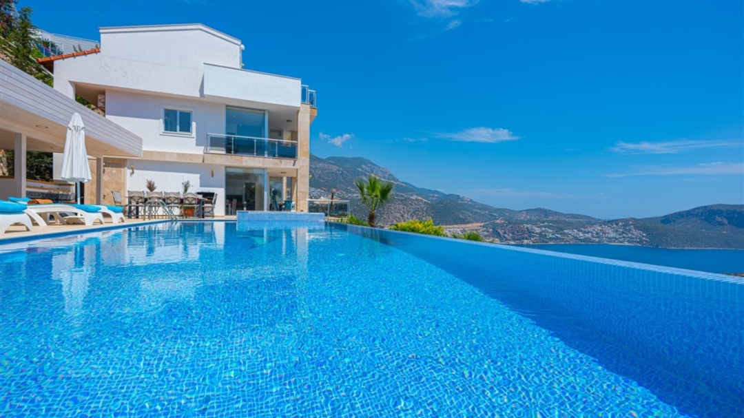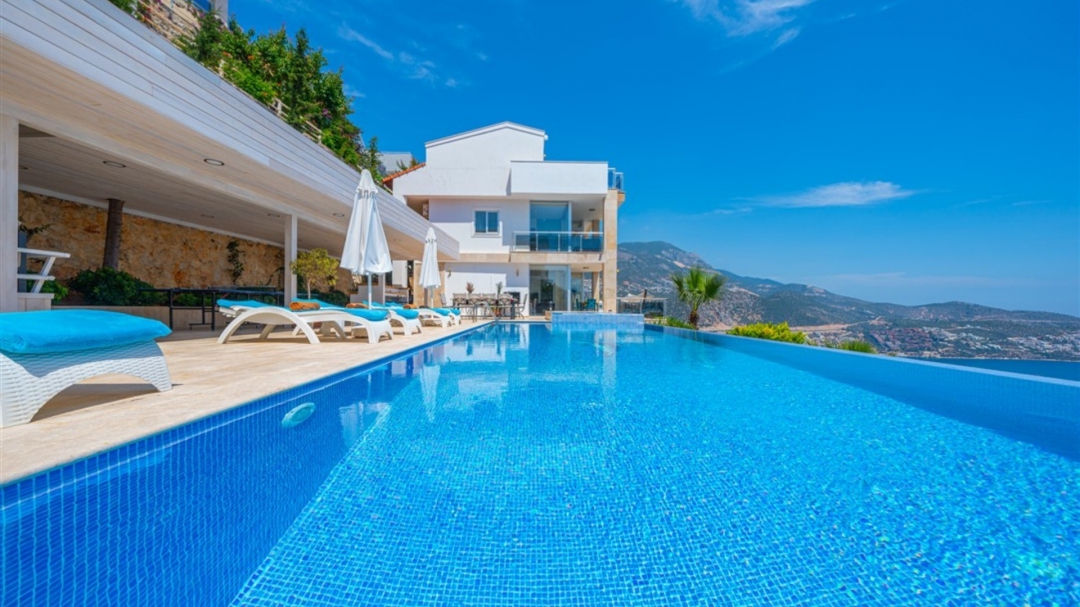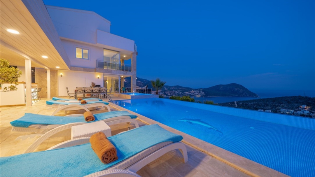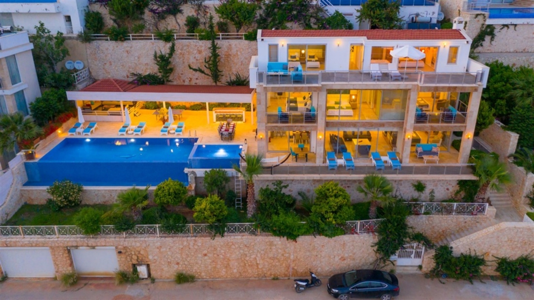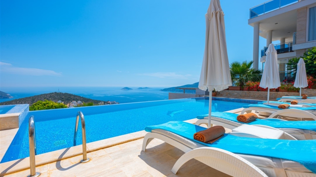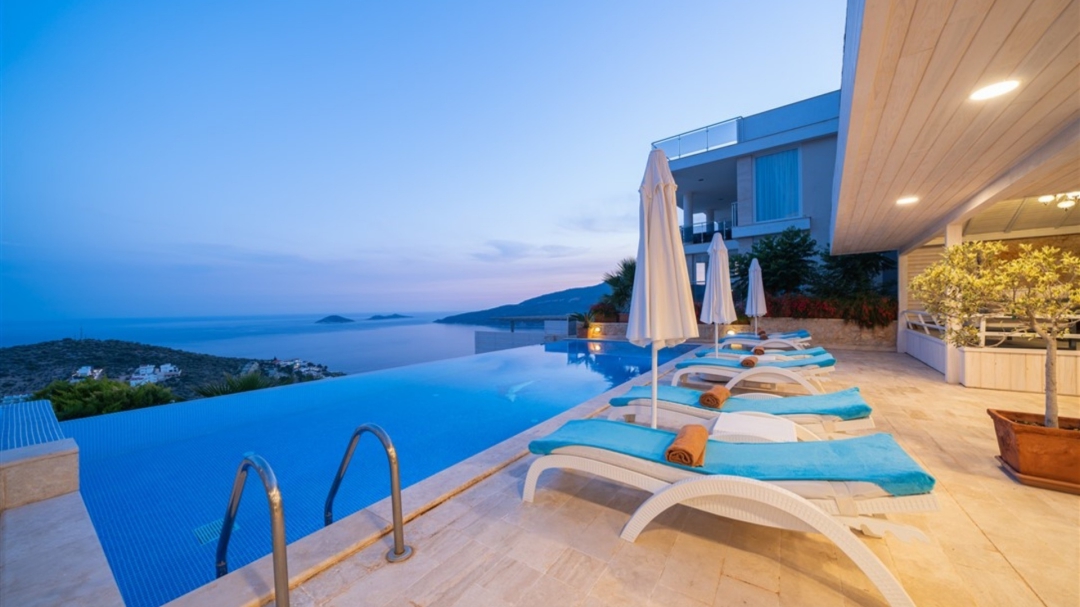 The villa, where comfort and luxury meet, is located in Ortaalan, Kalkan, facing southeast. It offers a magnificent sea view from every room and pool terrace. It is in an area that is easy to reach the center.