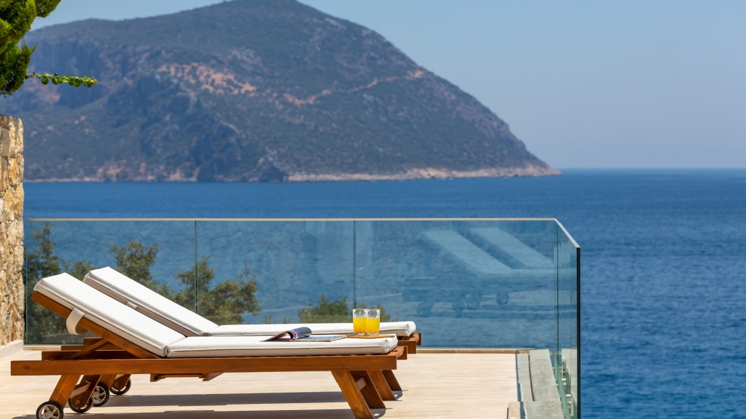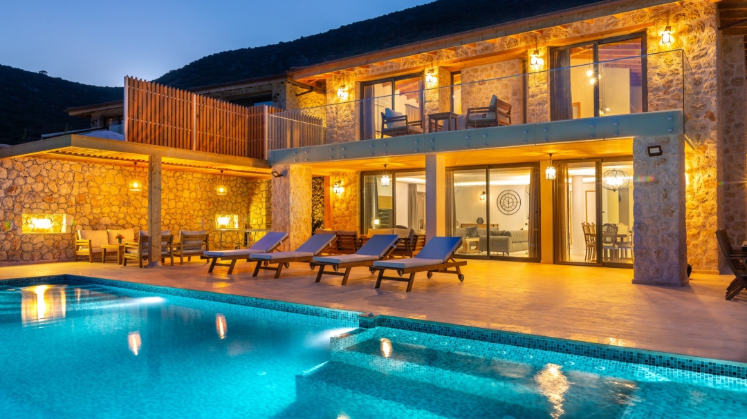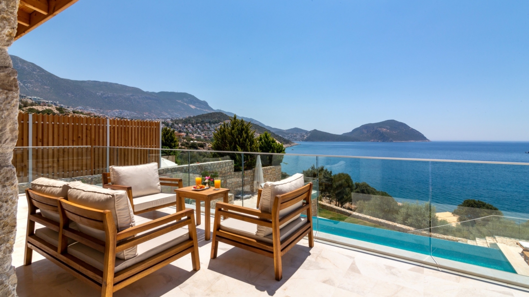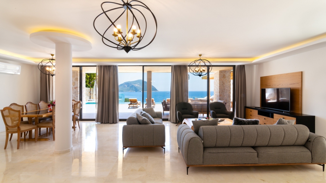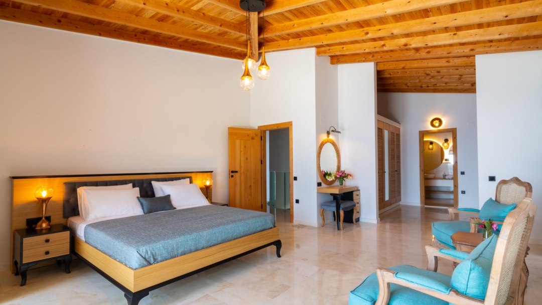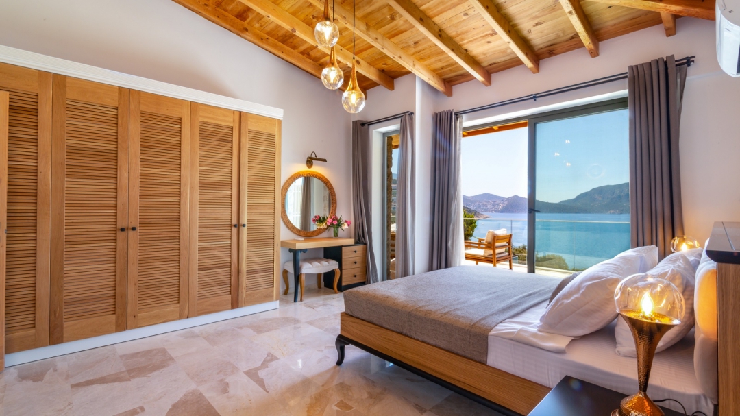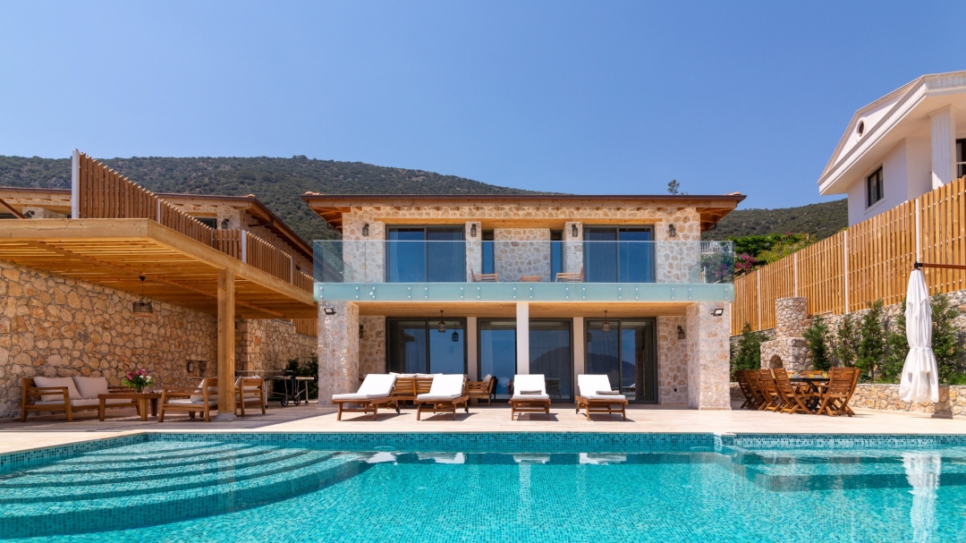 The villa, which has a private platform for access to the sea, is an option with a sea view. Its construction was made with natural materials such as stone and wood. It is located in a quiet area in the Kalamar area of Kalkan. It is one of the three villas in the area where it is located. If it is rented together with the villa with a capacity of 12 people located next to it, a capacity of 20 people can be provided. It offers its guests a unique experience in terms of access to the sea and close sea view. Like the materials used in the structure of the building, the colors used in its decor are natural colors that will make you feel comfortable. The villa has a clear sea view to match the sea view phrase.