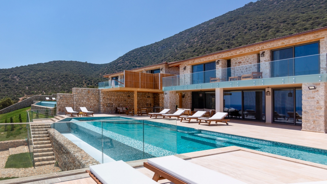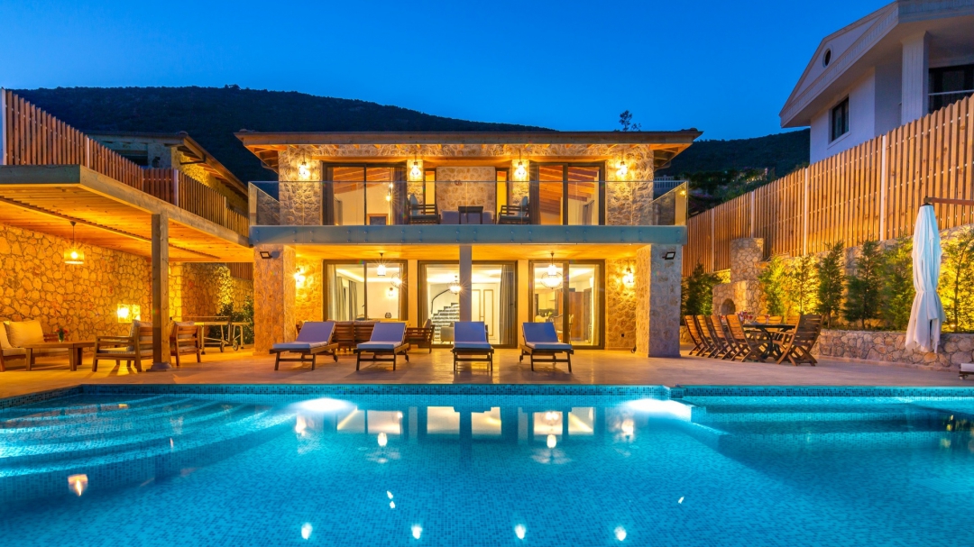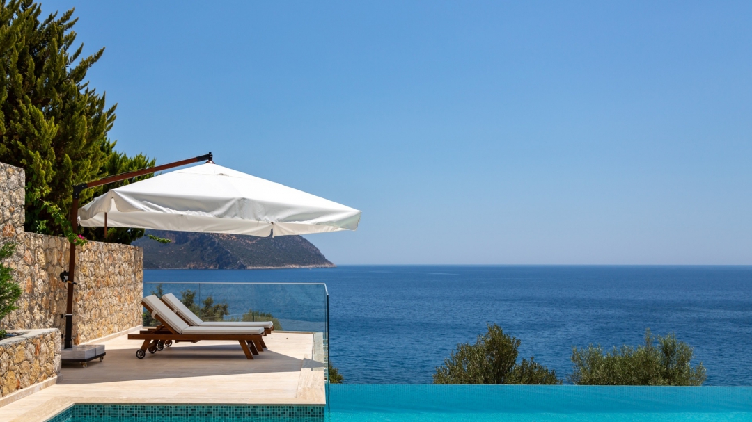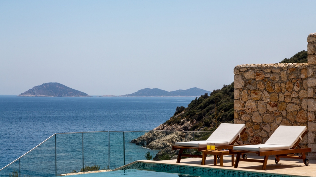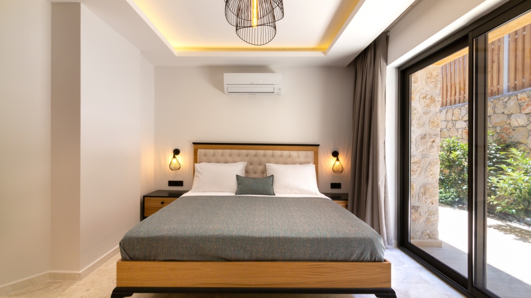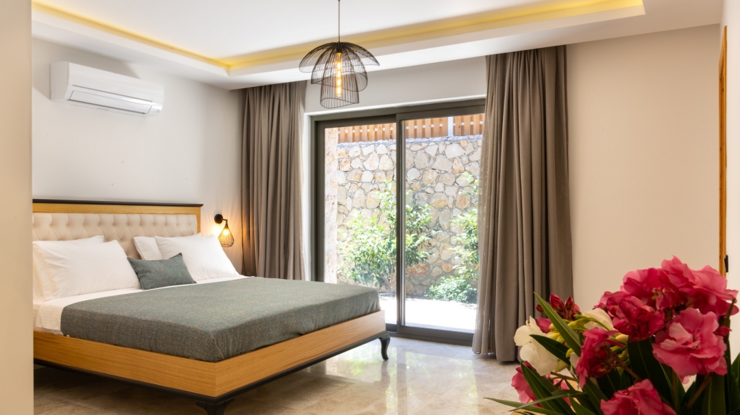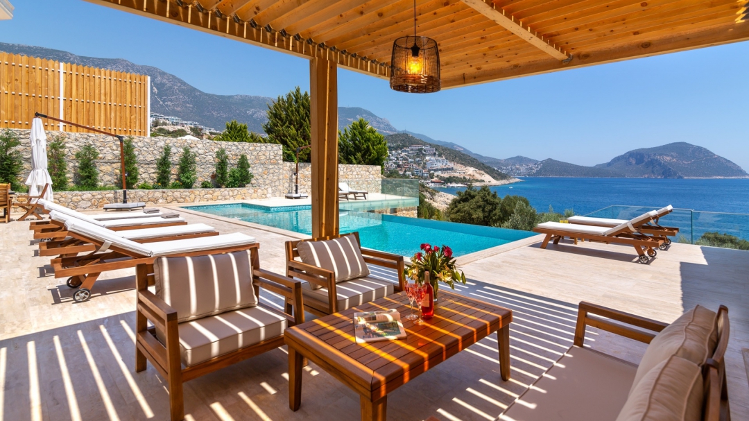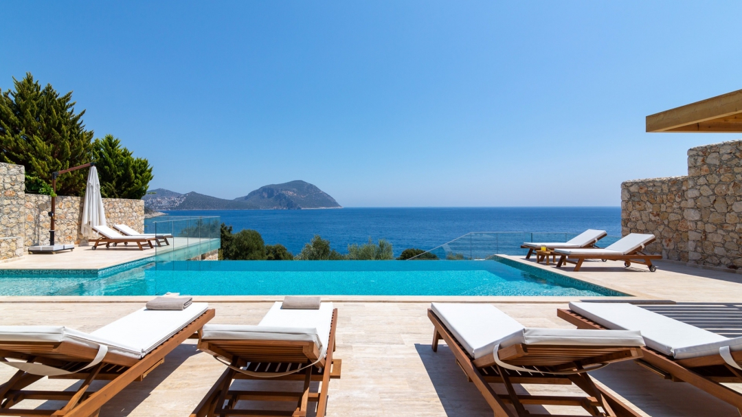 The villa, which has a private platform for access to the sea, is an option with a sea view. Its construction was made with natural materials such as stone and wood. It is located in a quiet area in the Kalamar area of Kalkan. It is one of the three villas in the area where it is located. If it is rented together with the villa with a capacity of 12 people located next to it, a capacity of 20 people can be provided. It offers its guests a unique experience in terms of access to the sea and close sea view. Like the materials used in the structure of the building, the colors used in its decor are natural colors that will make you feel comfortable. The villa has a clear sea view to match the sea view phrase.