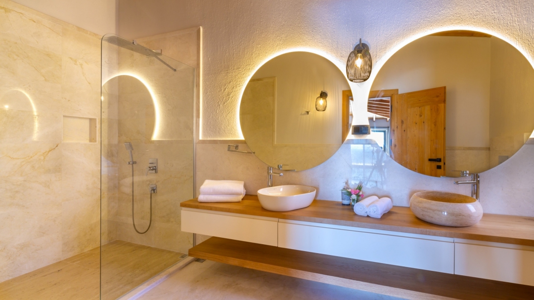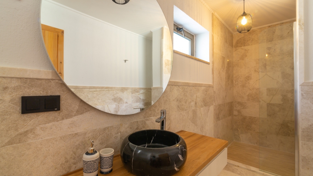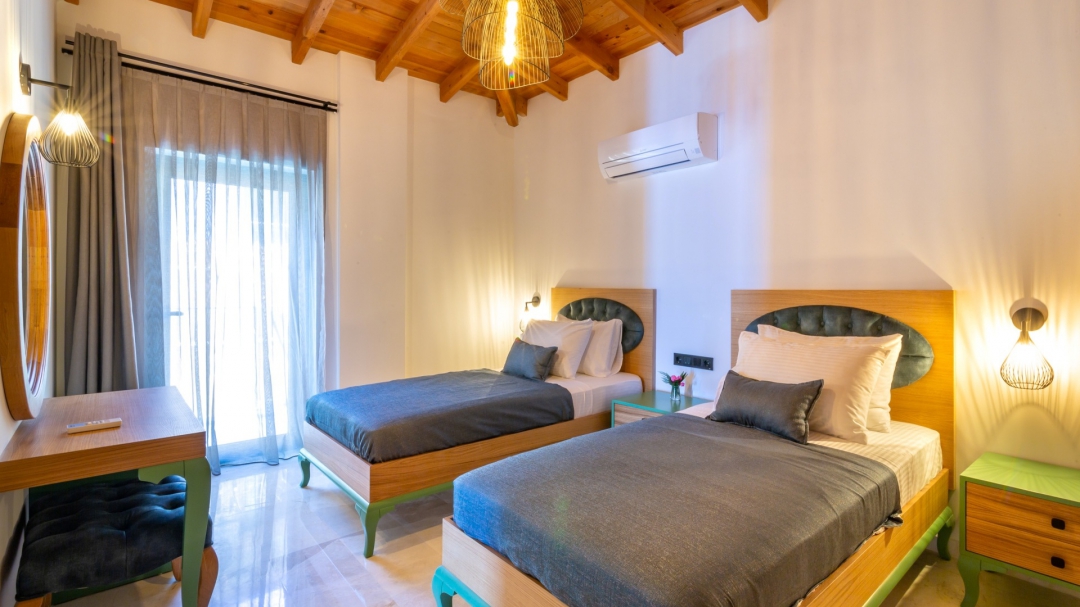 There are three more bedrooms on the first floor. In front of the two rooms with double beds, there is a large balcony with a sitting group. The last room has two single beds. All rooms are en suite. Wardrobe, make-up table, nightstand are other equipment in the rooms. Rooms with double beds have berjers.
