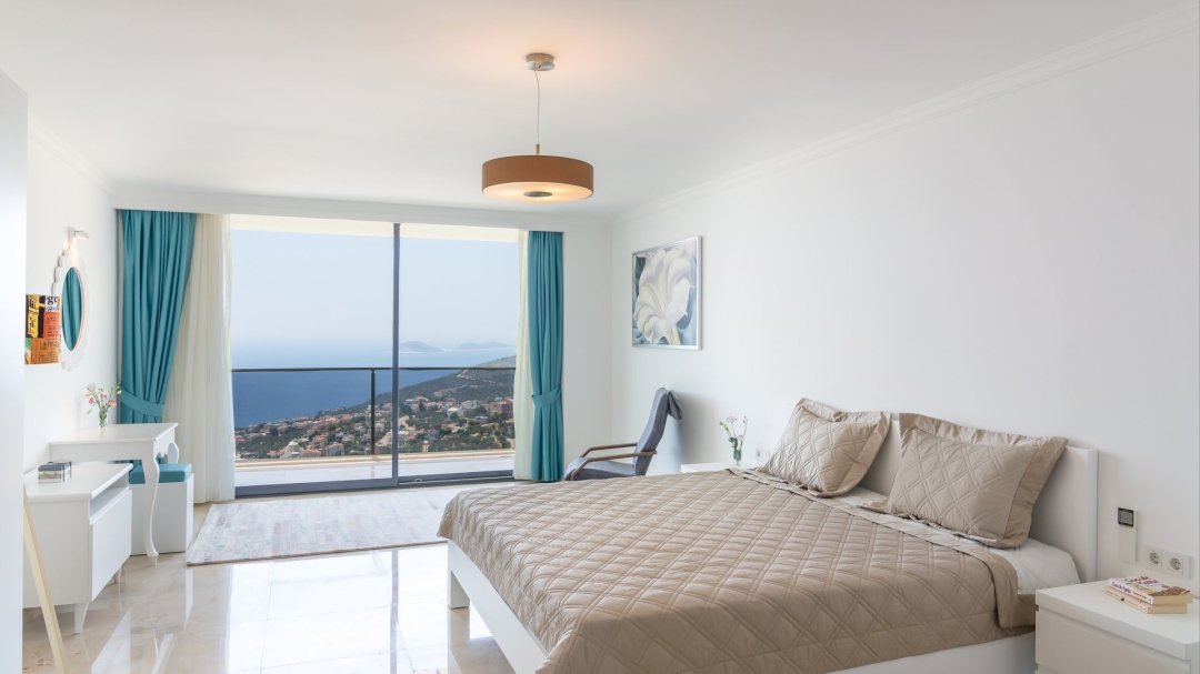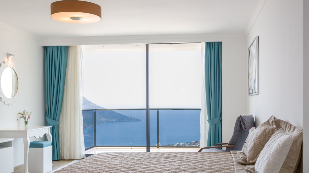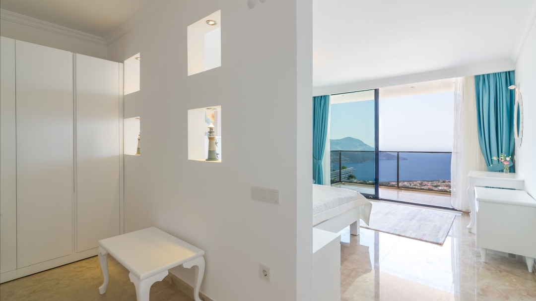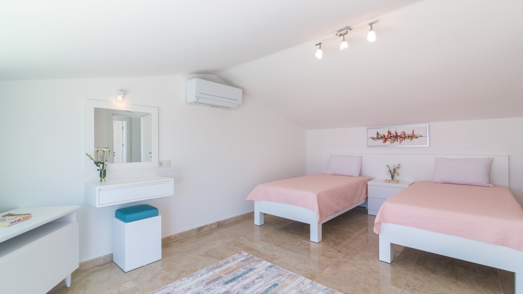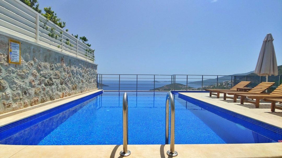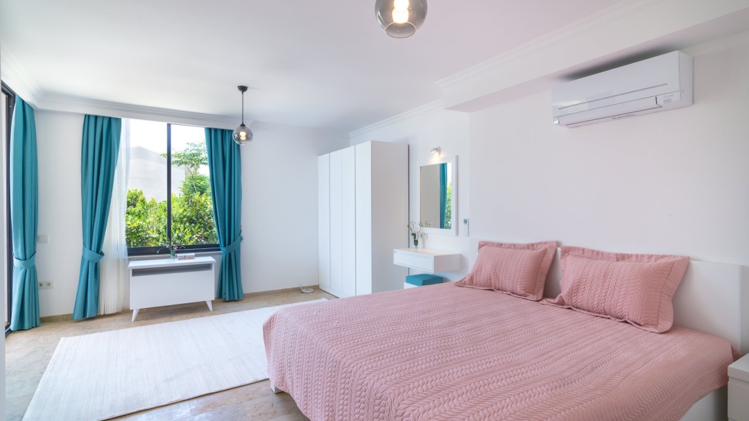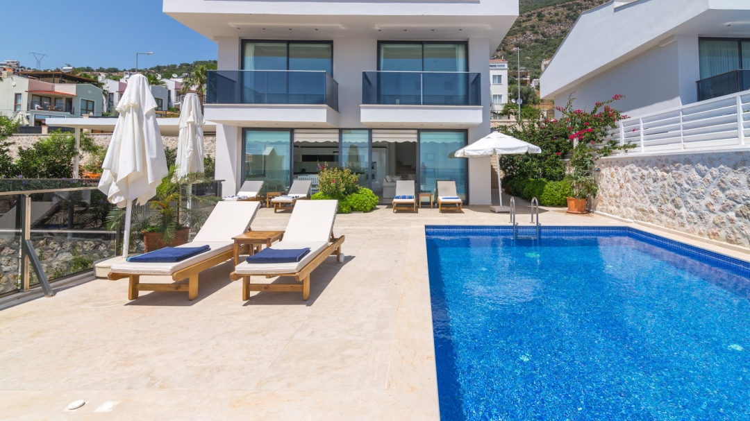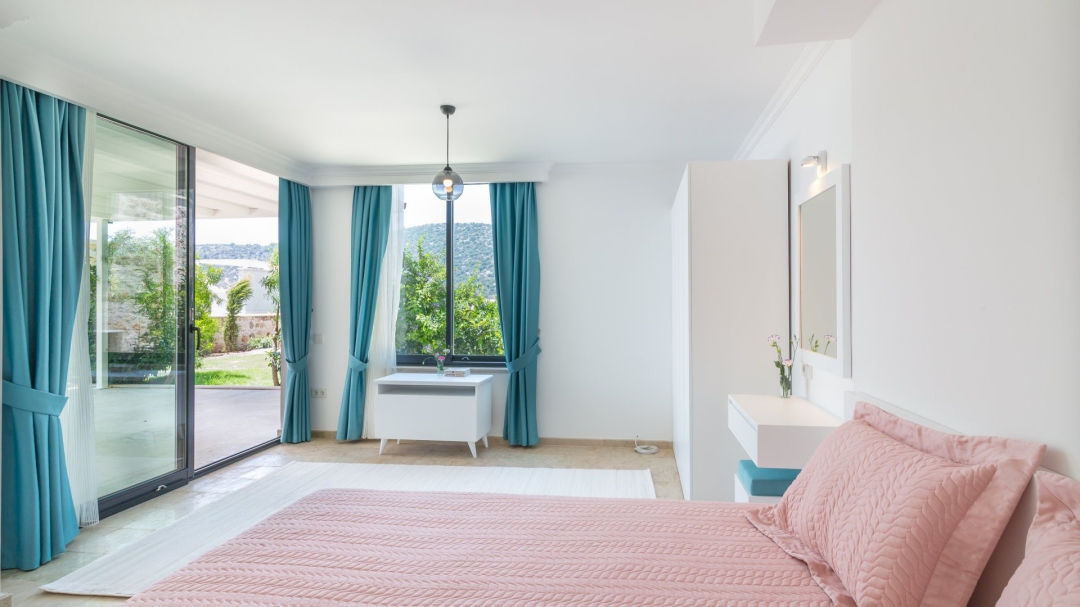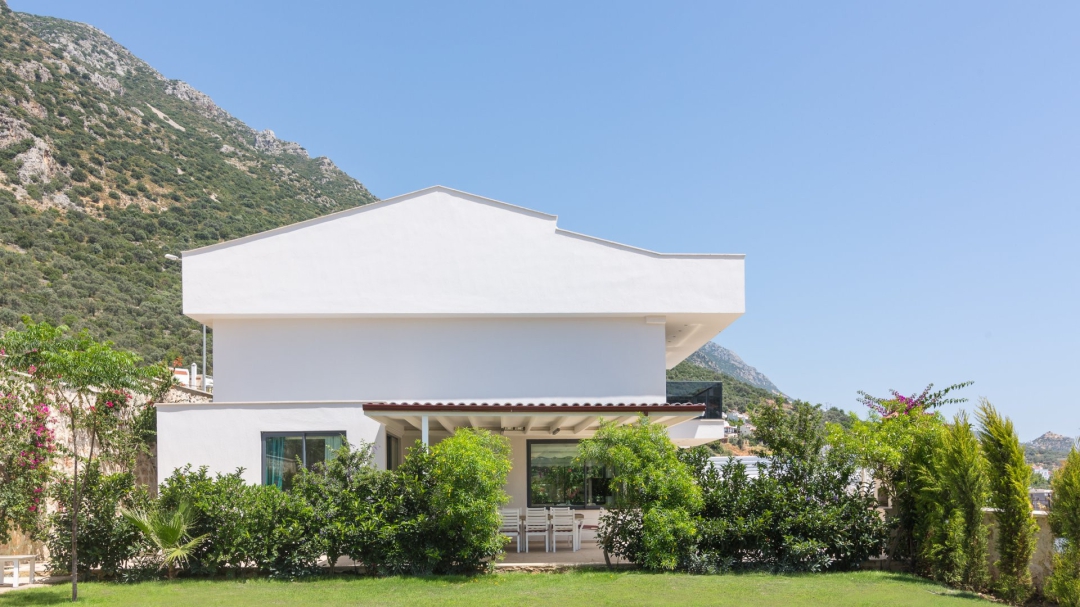 As soon as you reach the pool terrace, the villa that will appeal to your heart with its large garden is located in Kızıltaş, Kalkan. It is a comfortable option in terms of transportation to the center. It has 5 bedrooms with an accommodation capacity of 10 people. Next to the pool, it has a low-deep jacuzzi section that can be used by younger guests. Architecturally, it is a concept dominated by simple furniture and white color. There is no visual confusion even in the interior. The height of the villa is approximately one floor lower than the road you will reach in front of it. This means you have to use stairs to reach the villa's pool terrace and main entrance. In addition, on the ground floor, there is a room with a double bed and a bathroom, which is easy to access for guests who have difficulty moving. A lounge with access to the pool terrace, an open kitchen, a toilet for common use are other parts that complete the ground floor. TV, sitting group, a kitchen with enough equipment for 10 people are the equipments of this floor.