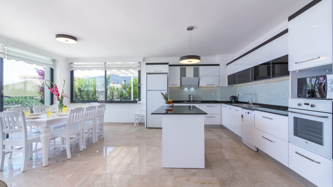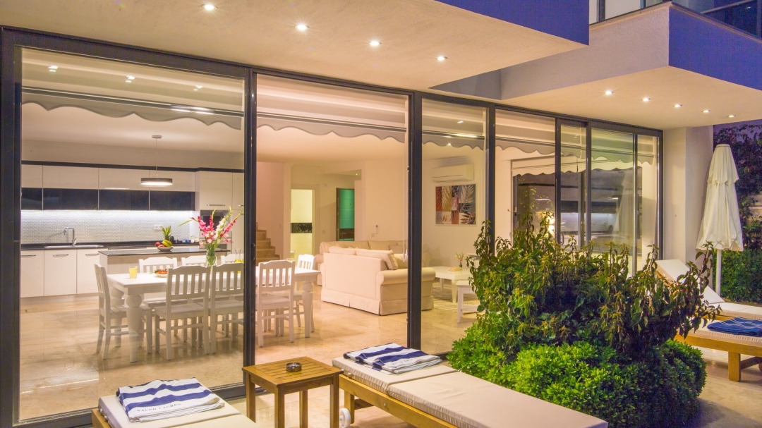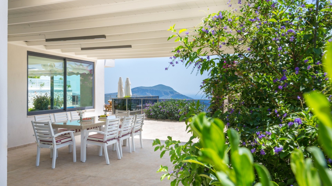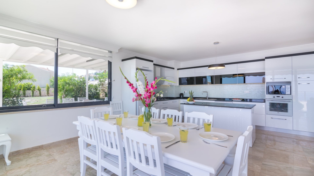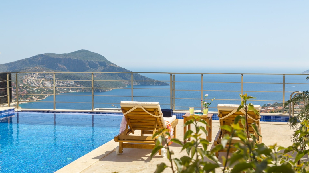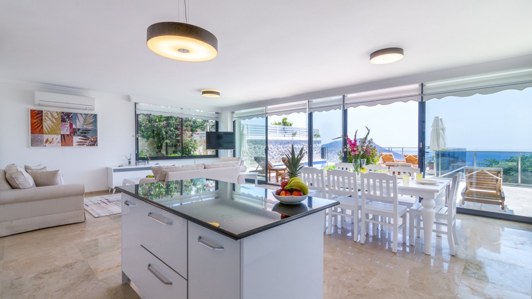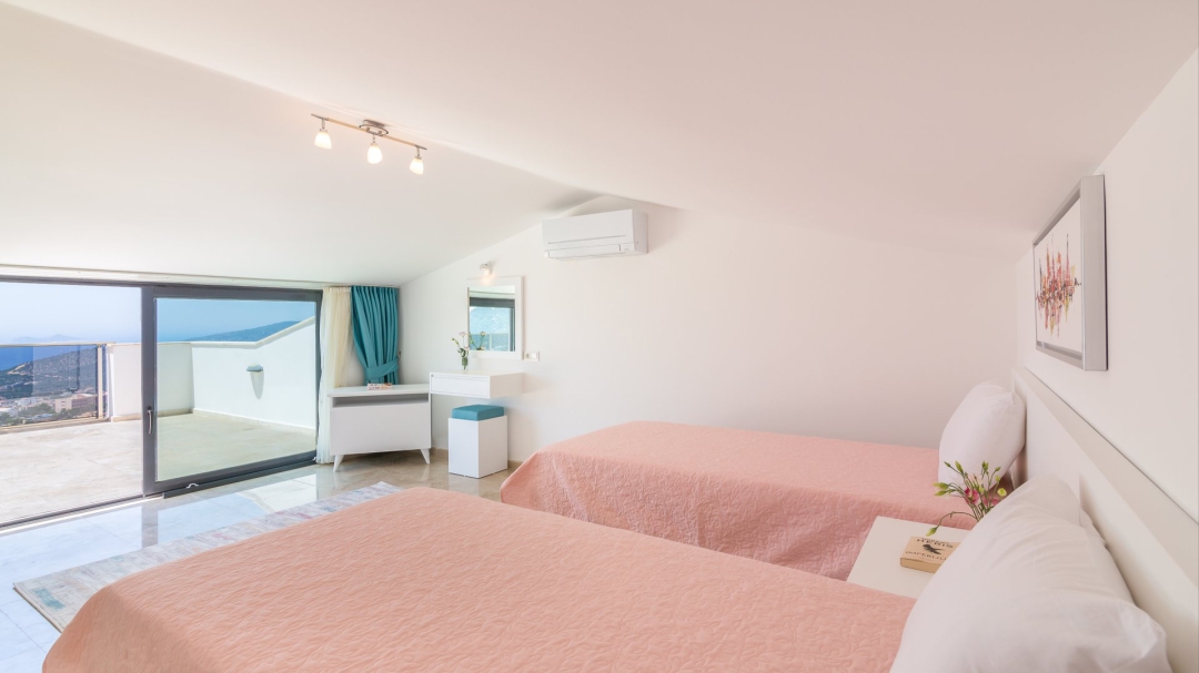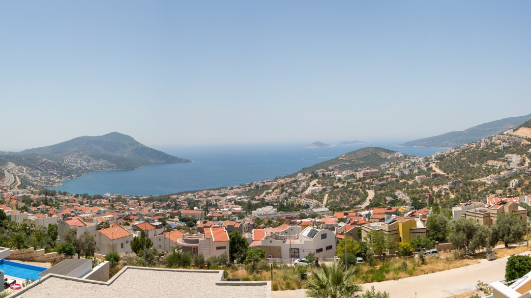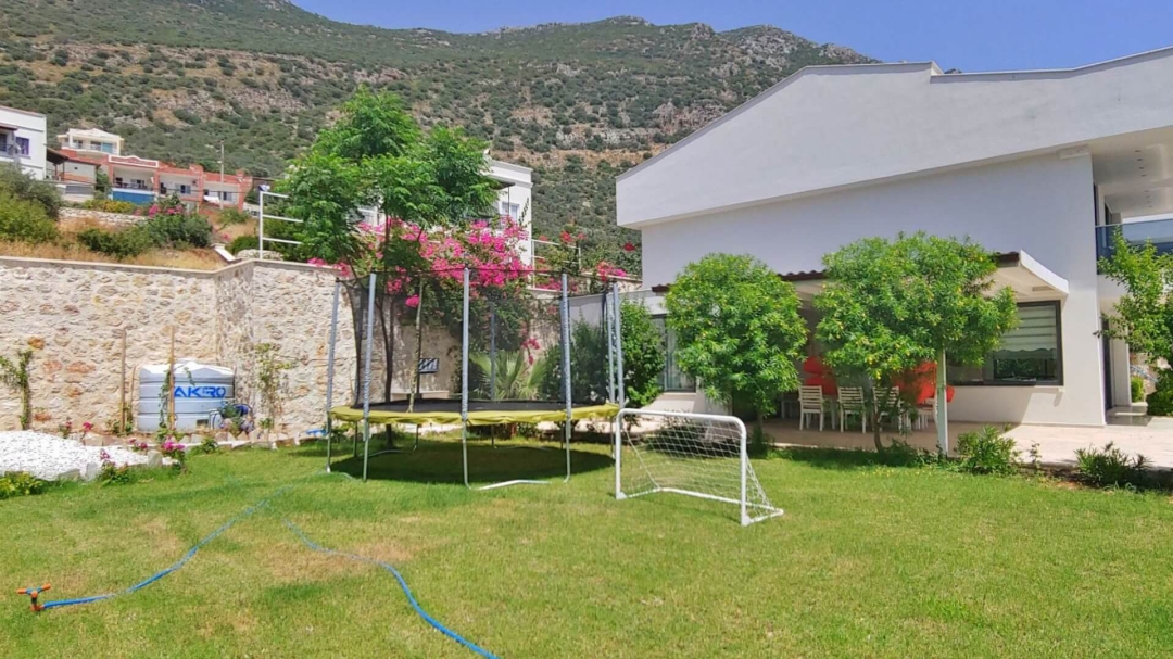 As soon as you reach the pool terrace, the villa that will appeal to your heart with its large garden is located in Kızıltaş, Kalkan. It is a comfortable option in terms of transportation to the center. It has 5 bedrooms with an accommodation capacity of 10 people. Next to the pool, it has a low-deep jacuzzi section that can be used by younger guests. Architecturally, it is a concept dominated by simple furniture and white color. There is no visual confusion even in the interior. The height of the villa is approximately one floor lower than the road you will reach in front of it. This means you have to use stairs to reach the villa's pool terrace and main entrance. In addition, on the ground floor, there is a room with a double bed and a bathroom, which is easy to access for guests who have difficulty moving. A lounge with access to the pool terrace, an open kitchen, a toilet for common use are other parts that complete the ground floor. TV, sitting group, a kitchen with enough equipment for 10 people are the equipments of this floor.