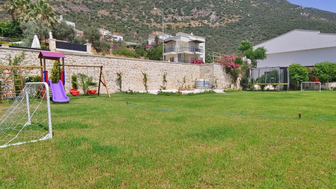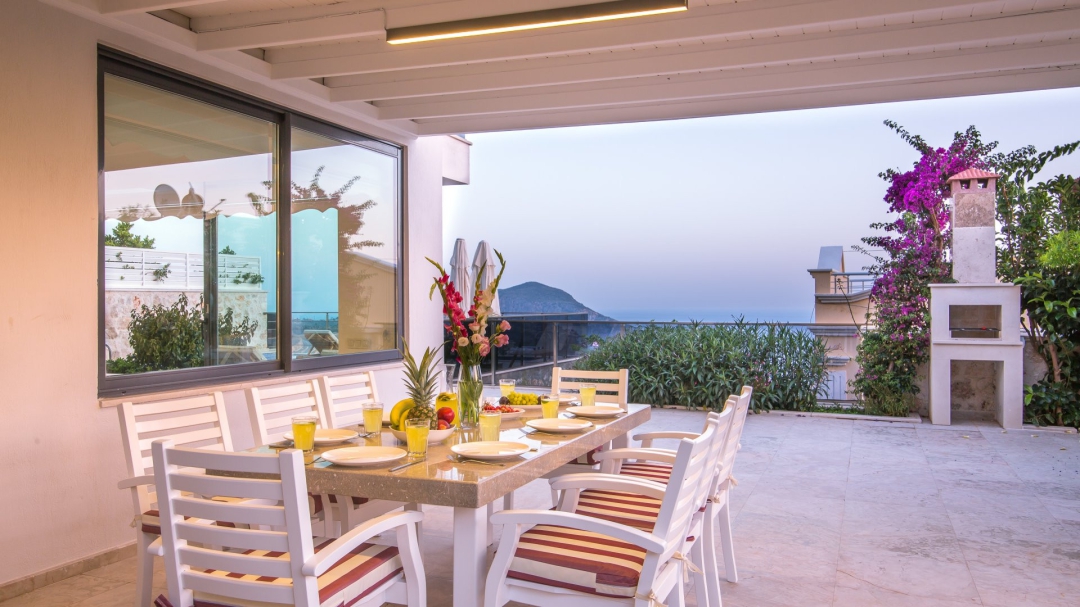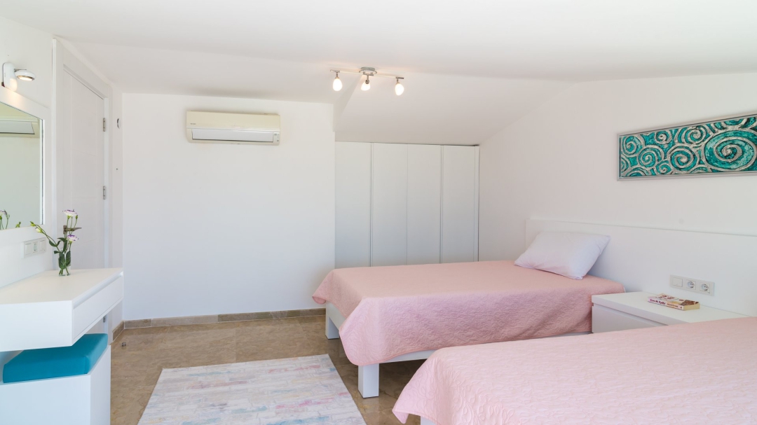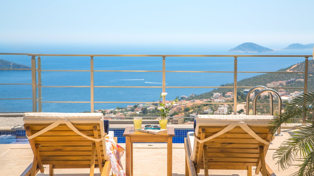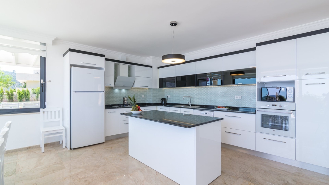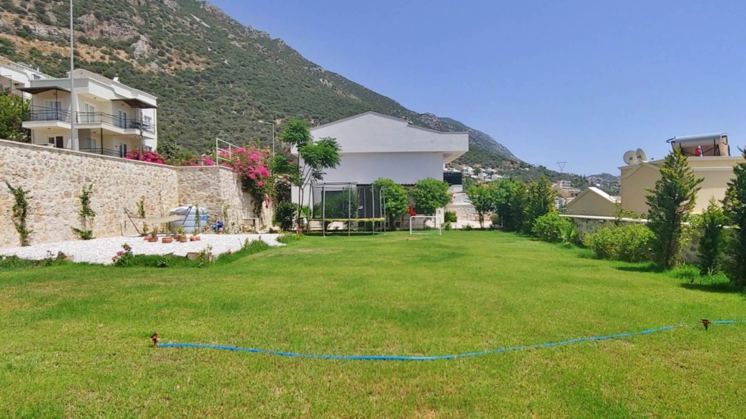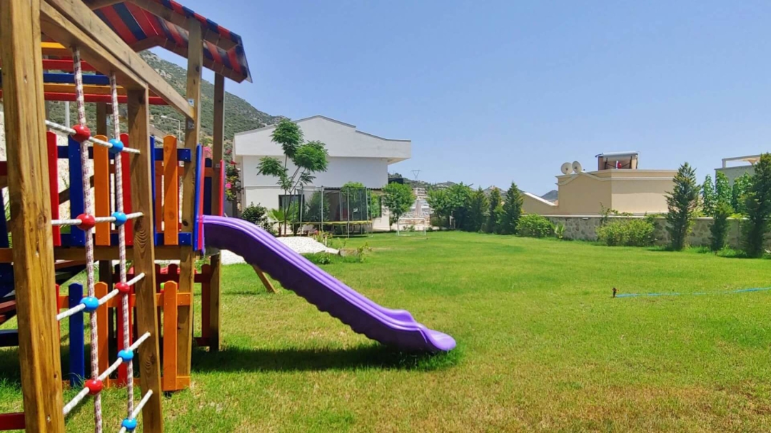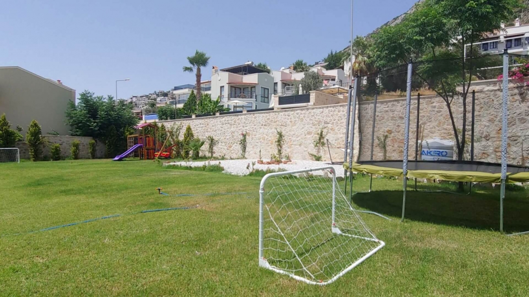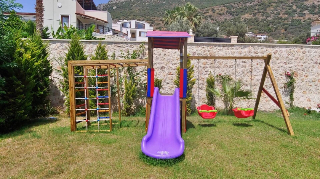As soon as you reach the pool terrace, the villa that will appeal to your heart with its large garden is located in Kızıltaş, Kalkan. It is a comfortable option in terms of transportation to the center. It has 5 bedrooms with an accommodation capacity of 10 people. Next to the pool, it has a low-deep jacuzzi section that can be used by younger guests. Architecturally, it is a concept dominated by simple furniture and white color. There is no visual confusion even in the interior. The height of the villa is approximately one floor lower than the road you will reach in front of it. This means you have to use stairs to reach the villa's pool terrace and main entrance. In addition, on the ground floor, there is a room with a double bed and a bathroom, which is easy to access for guests who have difficulty moving. A lounge with access to the pool terrace, an open kitchen, a toilet for common use are other parts that complete the ground floor. TV, sitting group, a kitchen with enough equipment for 10 people are the equipments of this floor.