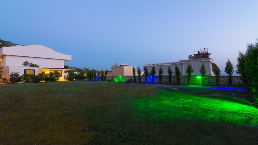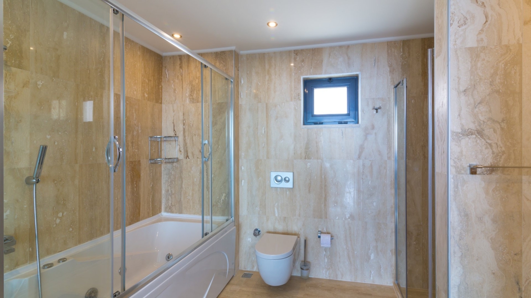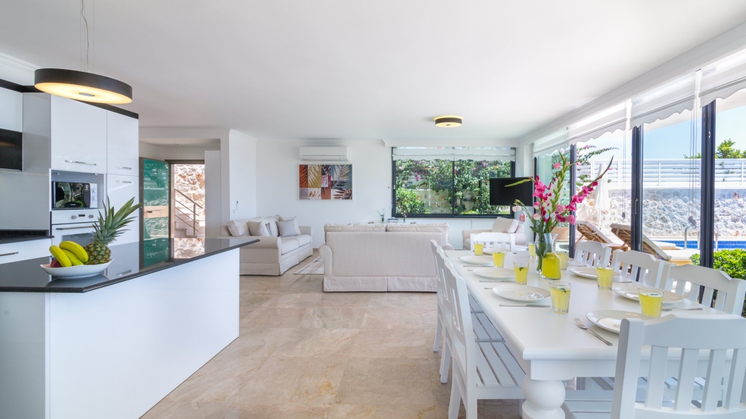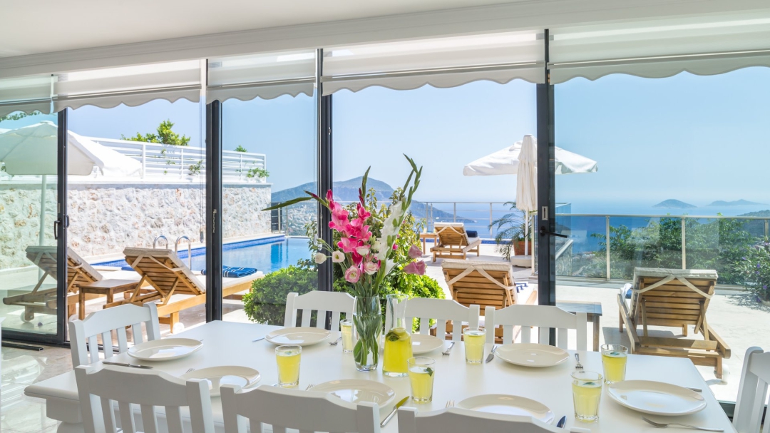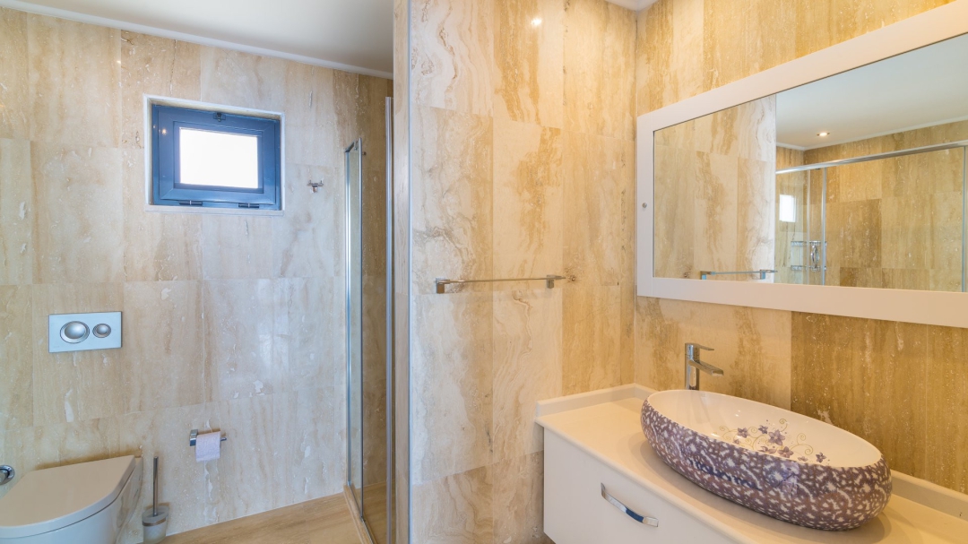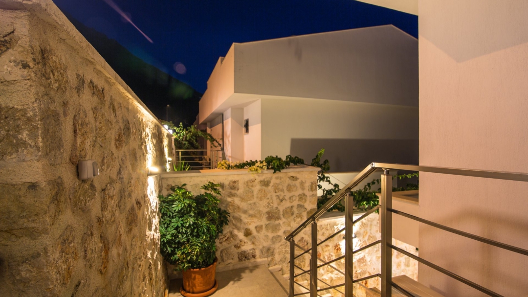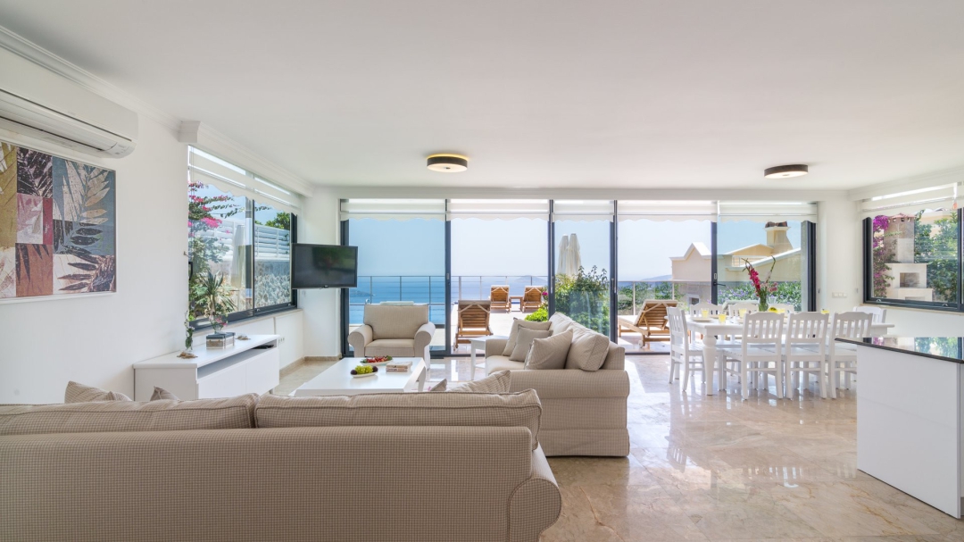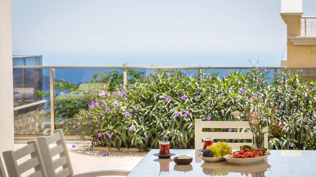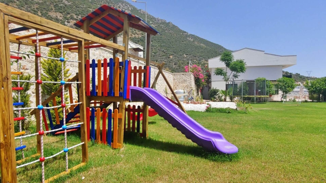 As soon as you reach the pool terrace, the villa that will appeal to your heart with its large garden is located in Kızıltaş, Kalkan. It is a comfortable option in terms of transportation to the center. It has 5 bedrooms with an accommodation capacity of 10 people. Next to the pool, it has a low-deep jacuzzi section that can be used by younger guests. Architecturally, it is a concept dominated by simple furniture and white color. There is no visual confusion even in the interior. The height of the villa is approximately one floor lower than the road you will reach in front of it. This means you have to use stairs to reach the villa's pool terrace and main entrance. In addition, on the ground floor, there is a room with a double bed and a bathroom, which is easy to access for guests who have difficulty moving. A lounge with access to the pool terrace, an open kitchen, a toilet for common use are other parts that complete the ground floor. TV, sitting group, a kitchen with enough equipment for 10 people are the equipments of this floor.