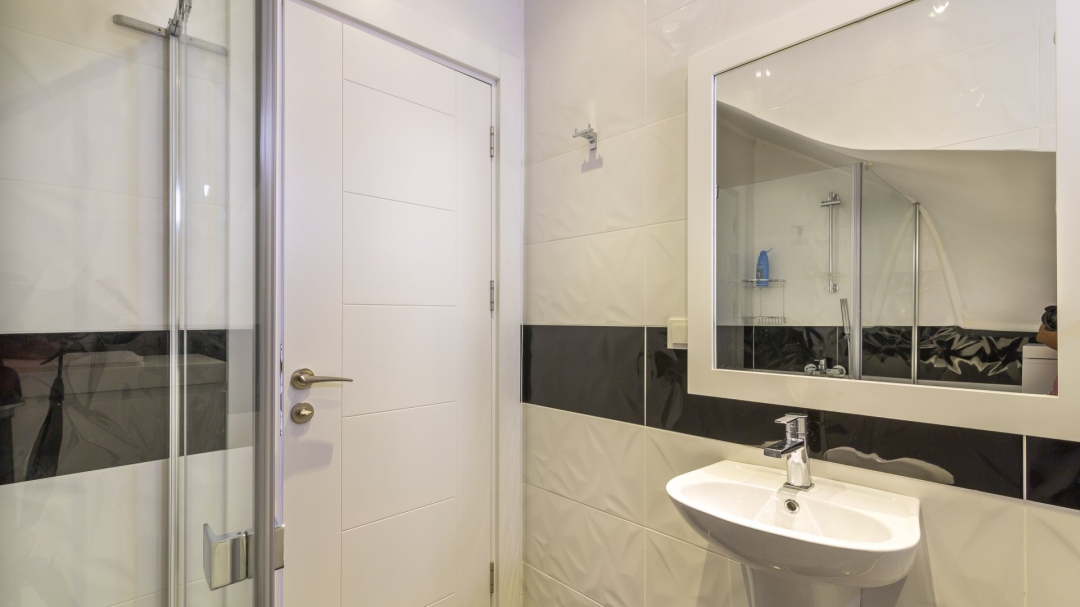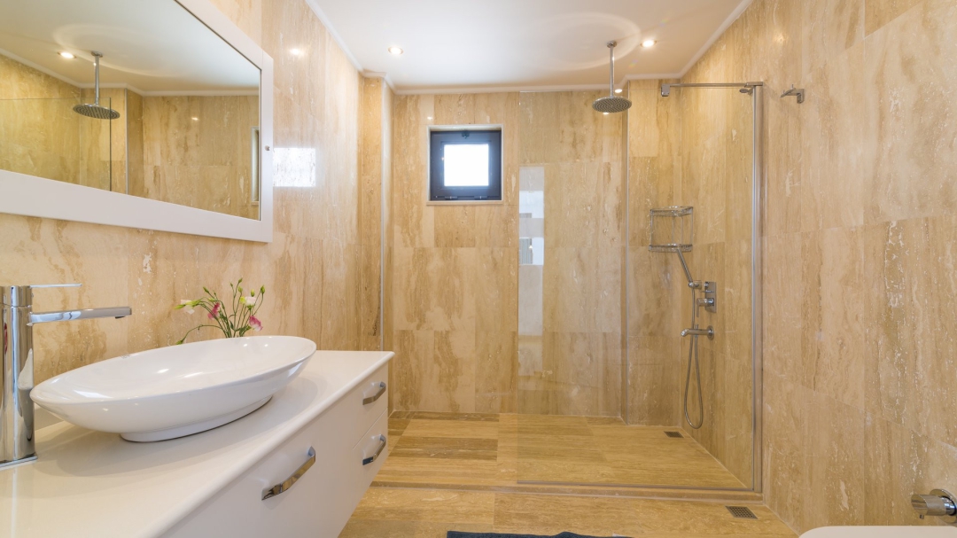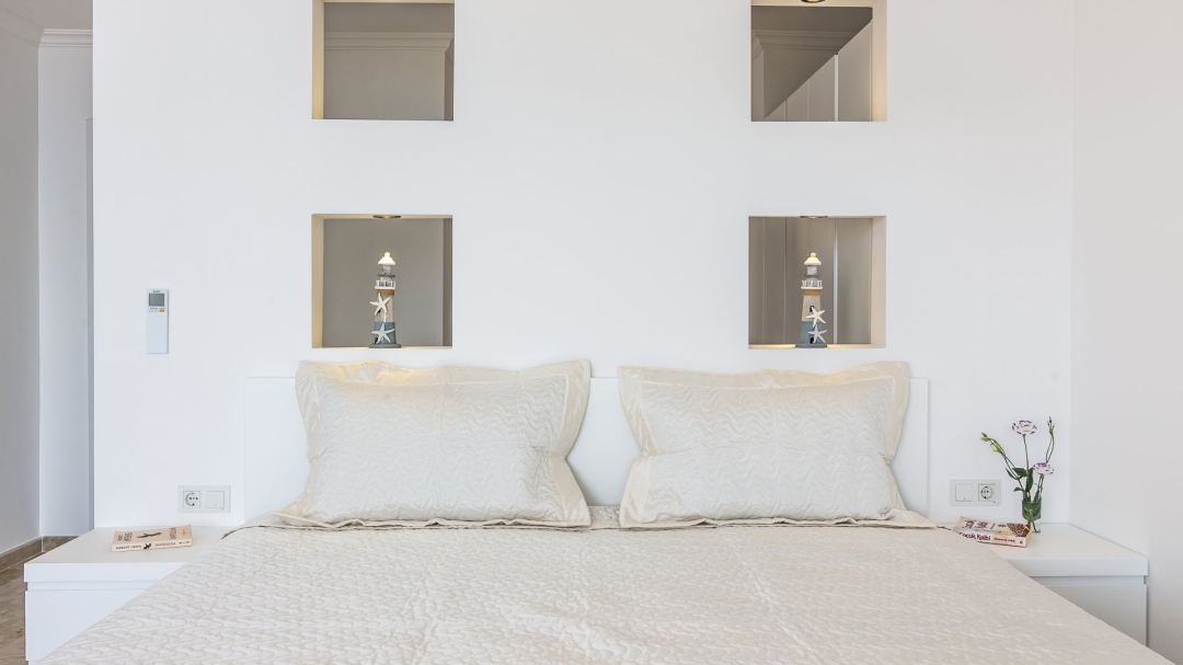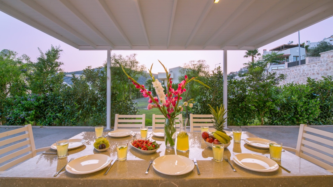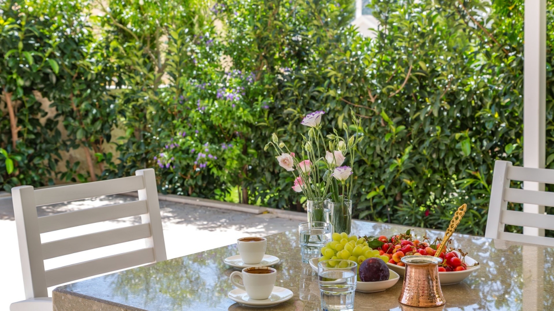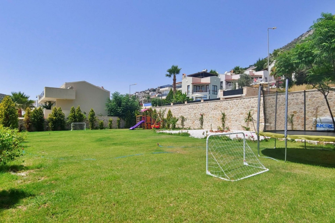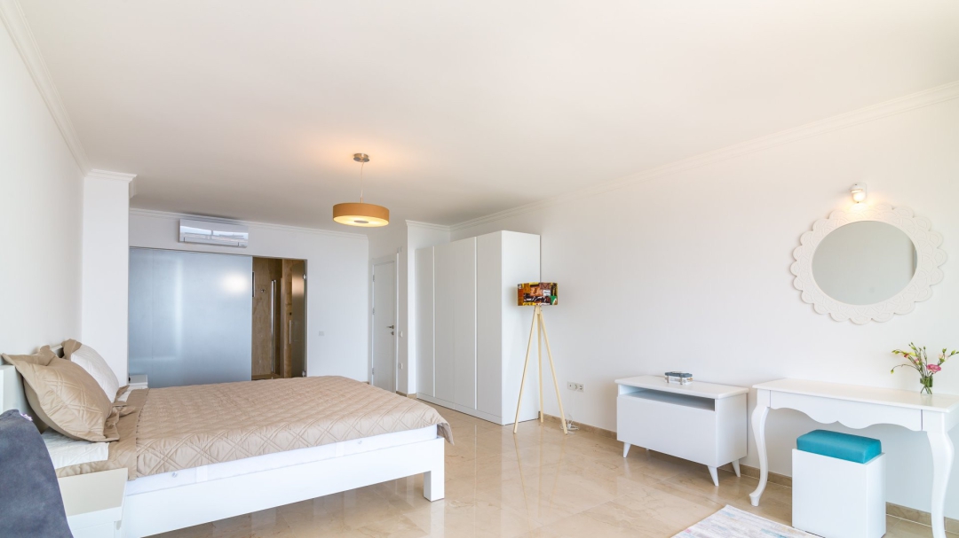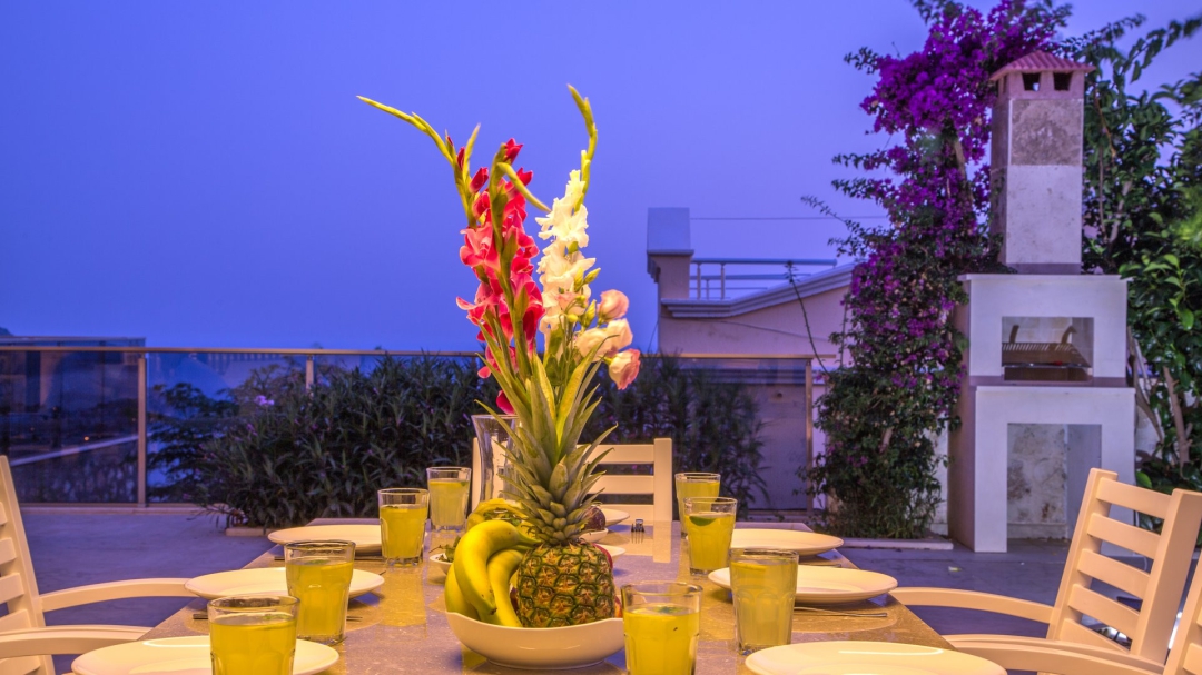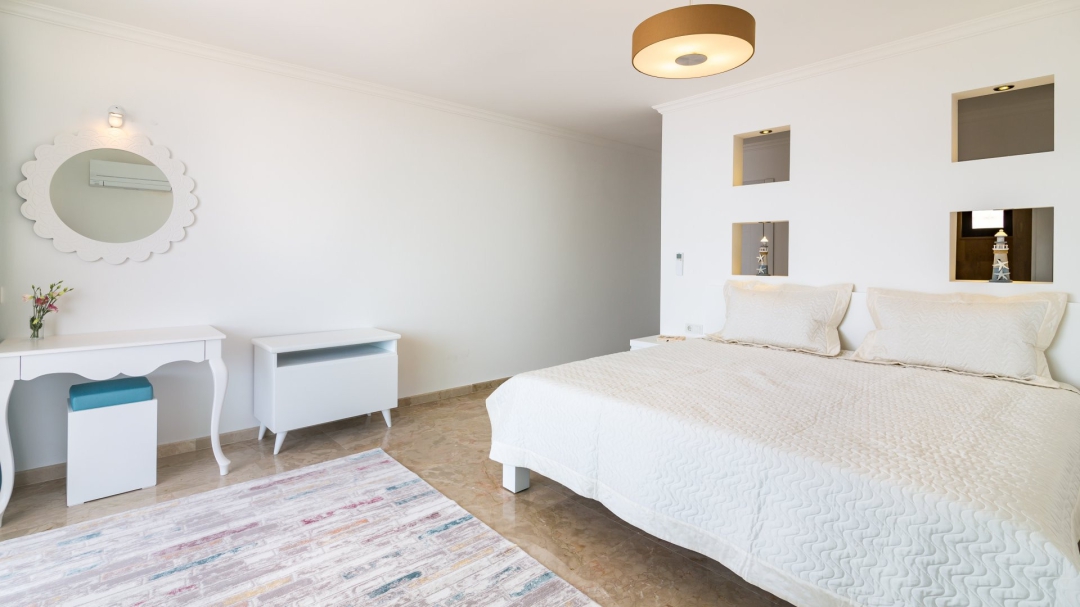 As soon as you reach the pool terrace, the villa that will appeal to your heart with its large garden is located in Kızıltaş, Kalkan. It is a comfortable option in terms of transportation to the center. It has 5 bedrooms with an accommodation capacity of 10 people. Next to the pool, it has a low-deep jacuzzi section that can be used by younger guests. Architecturally, it is a concept dominated by simple furniture and white color. There is no visual confusion even in the interior. The height of the villa is approximately one floor lower than the road you will reach in front of it. This means you have to use stairs to reach the villa's pool terrace and main entrance. In addition, on the ground floor, there is a room with a double bed and a bathroom, which is easy to access for guests who have difficulty moving. A lounge with access to the pool terrace, an open kitchen, a toilet for common use are other parts that complete the ground floor. TV, sitting group, a kitchen with enough equipment for 10 people are the equipments of this floor.