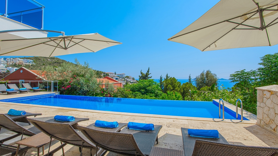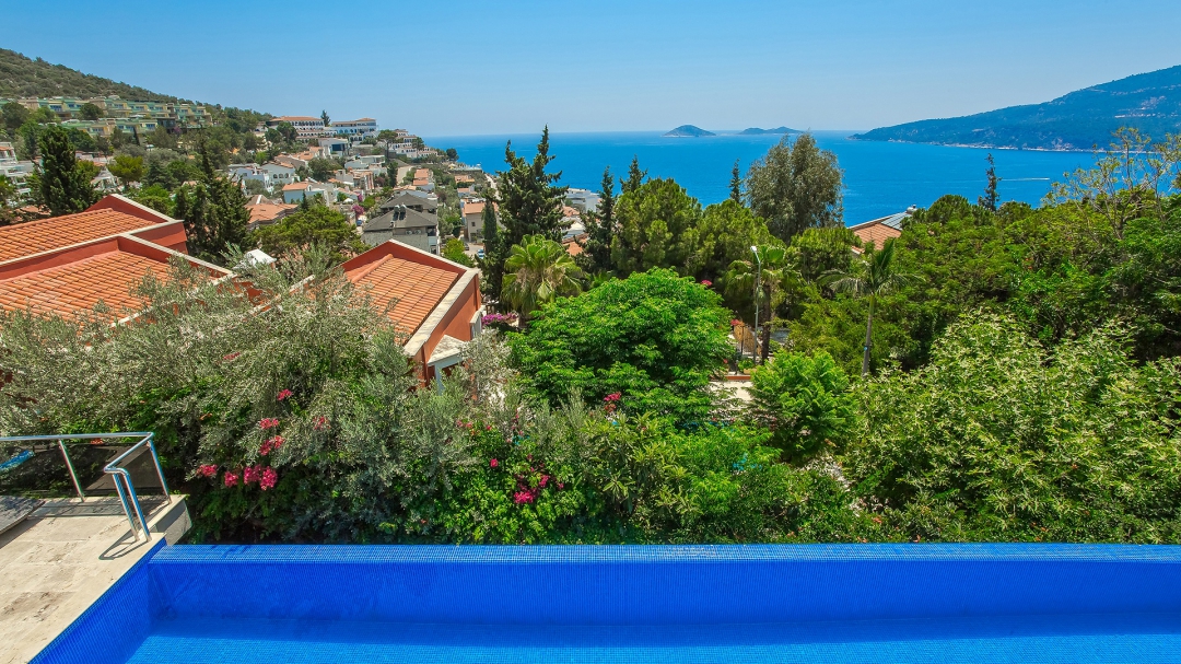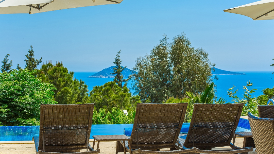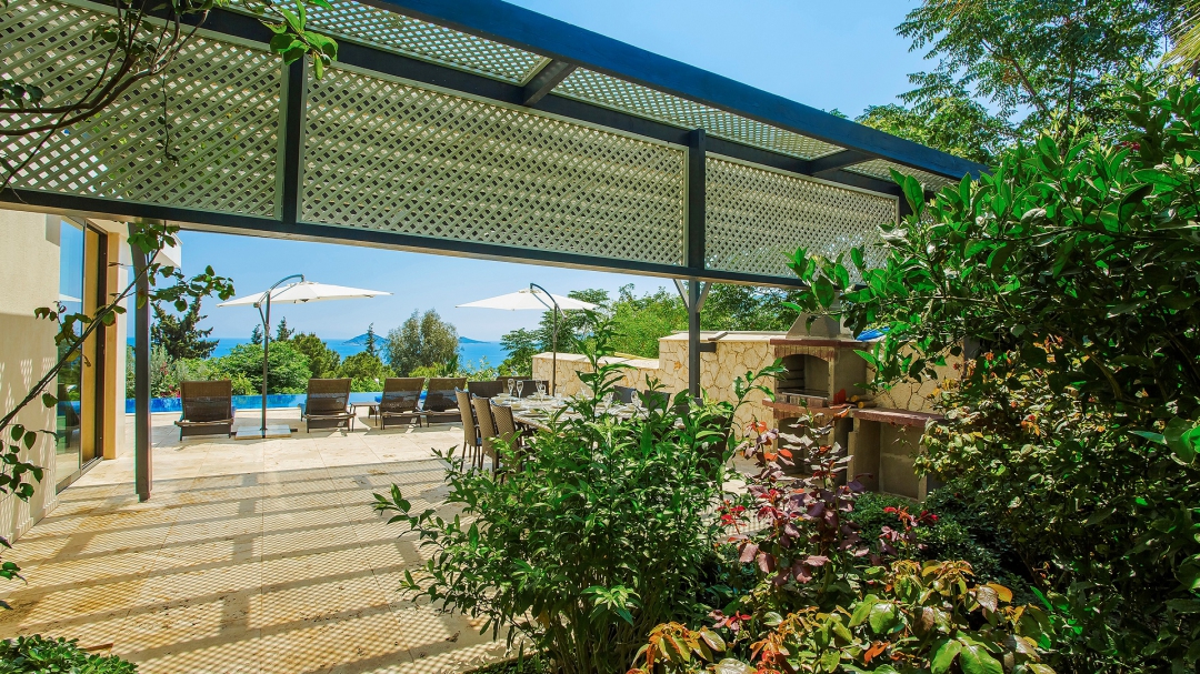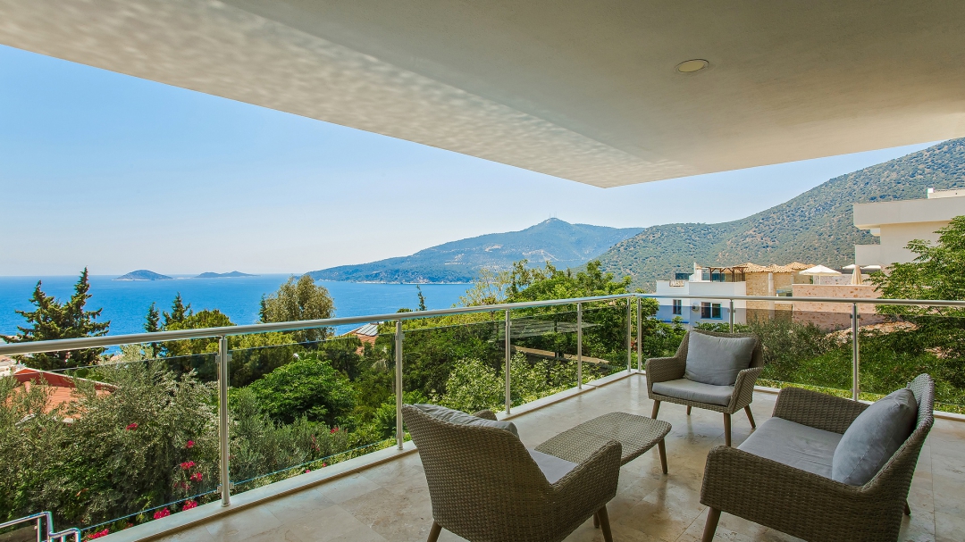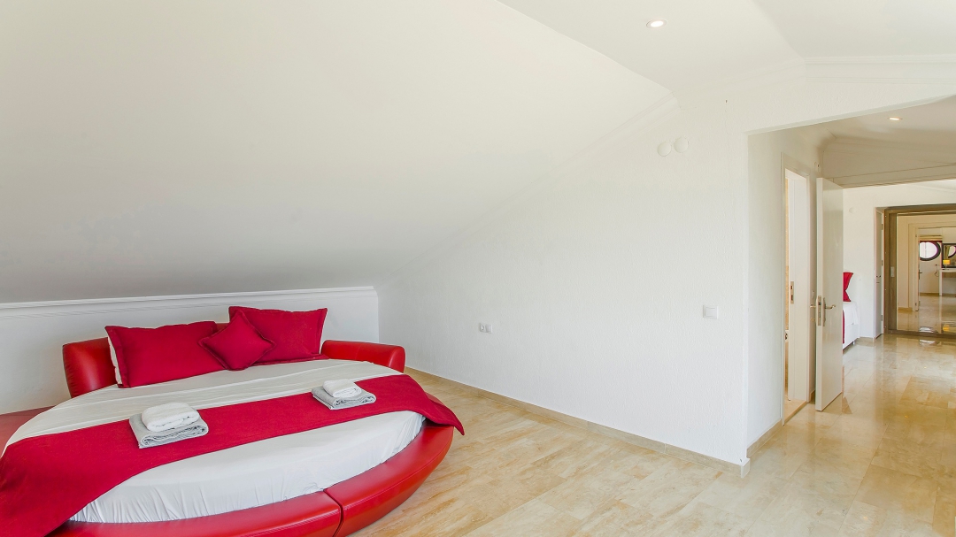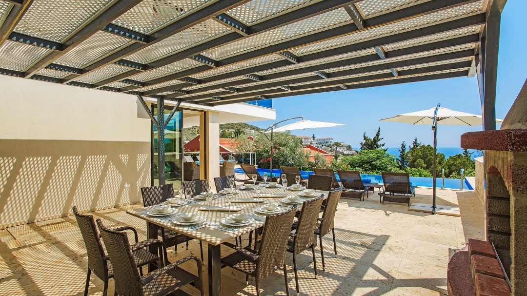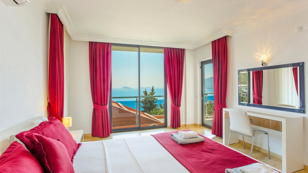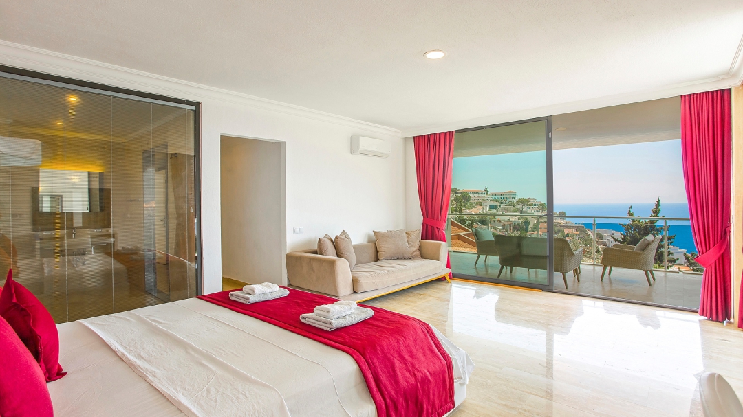 The villa for 14 people has 7 bedrooms. It has 4 floors with a basement. It is located in Kalamar region, close to the sea. It is among the options with sea view. Except for the two rooms in the attic, the rooms are all en suite.