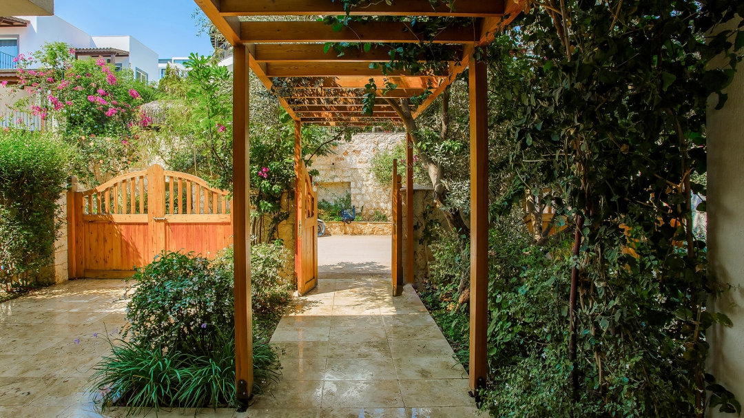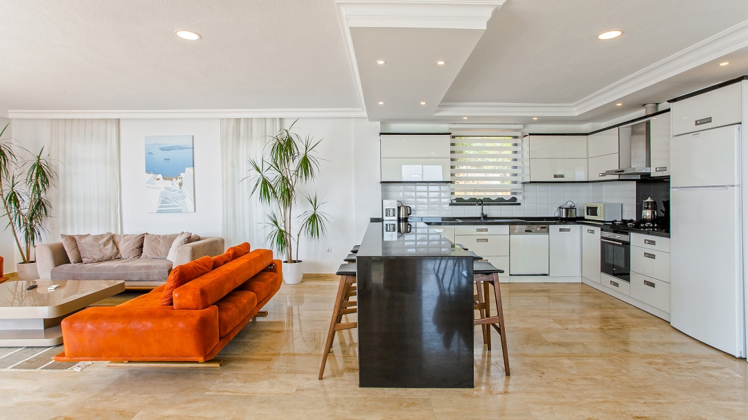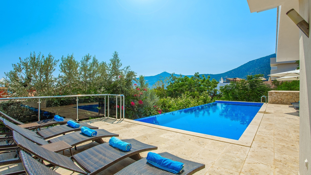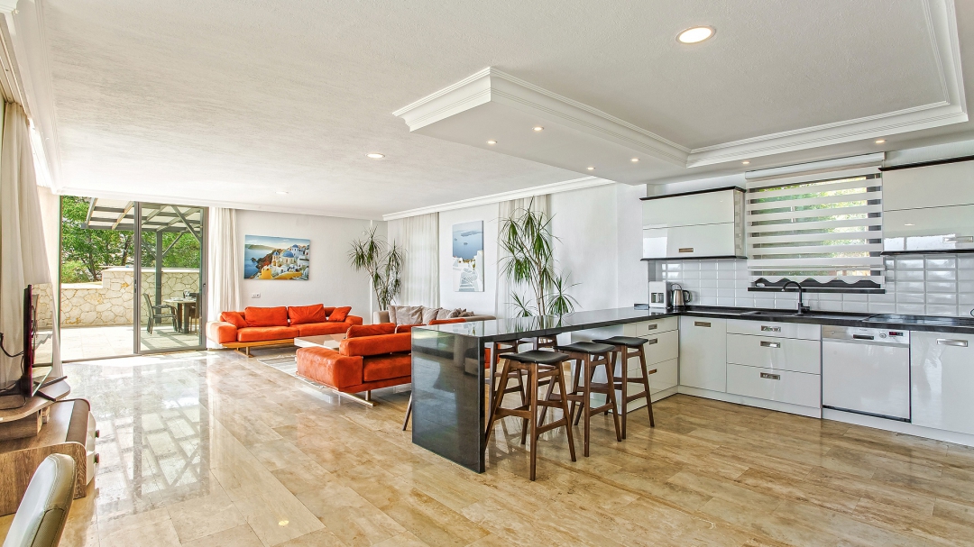 The floor where the pool is located is the ground floor. The sea view seen through the green plants in front of the villa accompanies the pool terrace. Equipment such as sun loungers, umbrellas, barbecue, dining table, sitting group fill this area. There is access to the hall from this area. Equipment for the living room and kitchen; sitting group, tv, island kitchen counter, stools, filter coffee machine, microwave oven, toaster and built-in kitchen equipment. The second room is also on this floor. Two single beds, make-up table, wardrobe, nightstands are the details of this room.