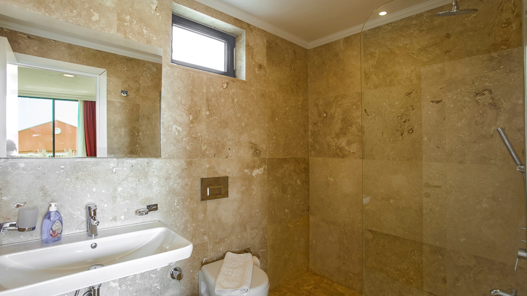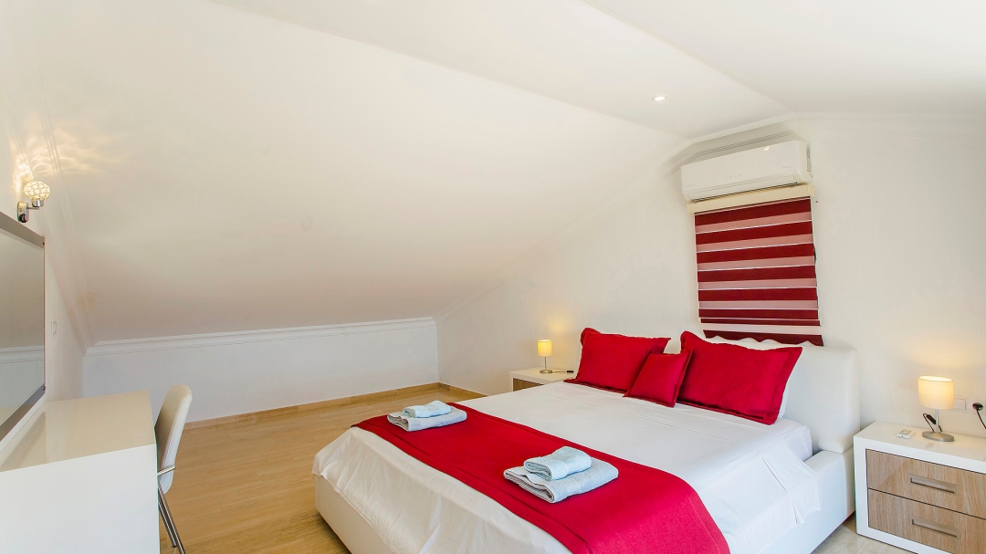 In the attic; The room on the east side of the building has a double bed. This is the en suite room on this floor. Wardrobe, dressing table, nightstand and balcony are the details of this room. The room with a round double bed and the room with two single beds use the same bathroom and toilet. A large terrace with a jacuzzi for the common use of these rooms forms the last part of the house. On this terrace, there are two sun loungers and furniture such as a sitting group.