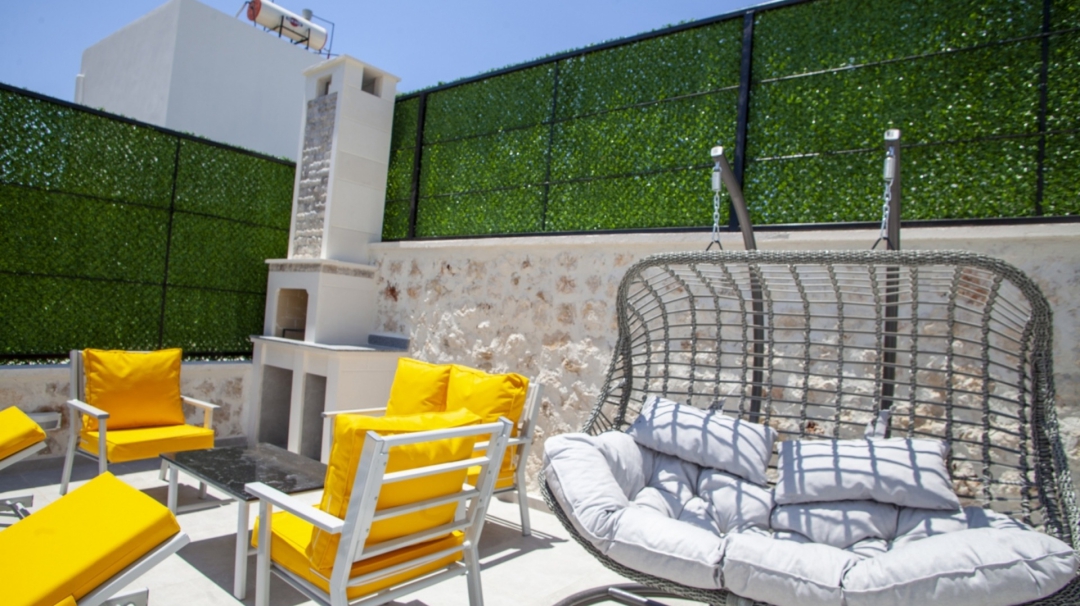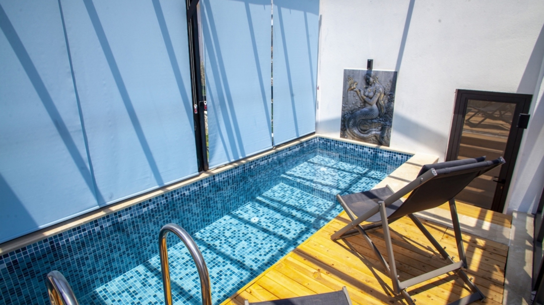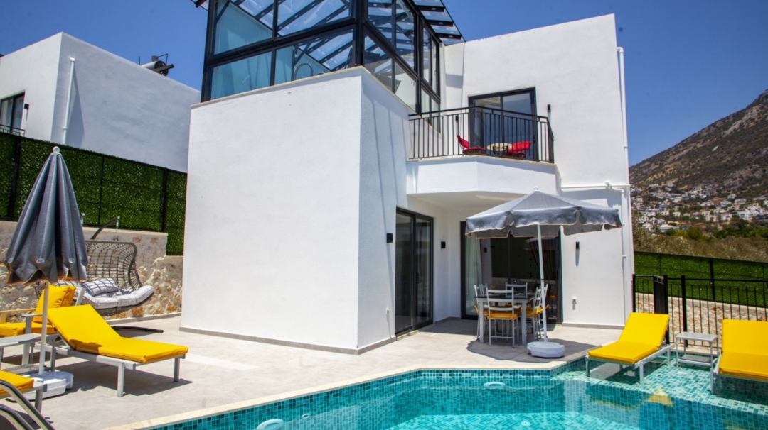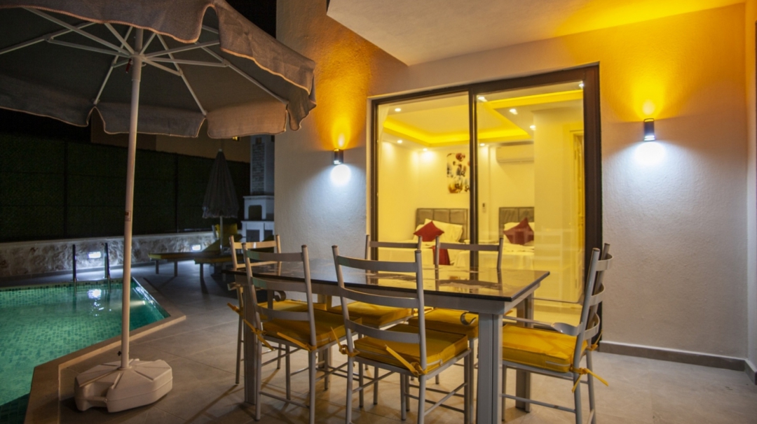 On the ground floor, there is a pool terrace, living room, open kitchen, room with two single beds. Seating group, dining table, sun loungers, umbrellas, barbecue, swing are the equipment of the pool terrace. In the kitchen, dining table, microwave oven, built-in kitchen equipment, tea maker are some of the equipment.The room on this floor has a bathroom. Wardrobe, bedside table, air conditioner are the equipment of this room.There is an exit to the pool area from the living room and room.