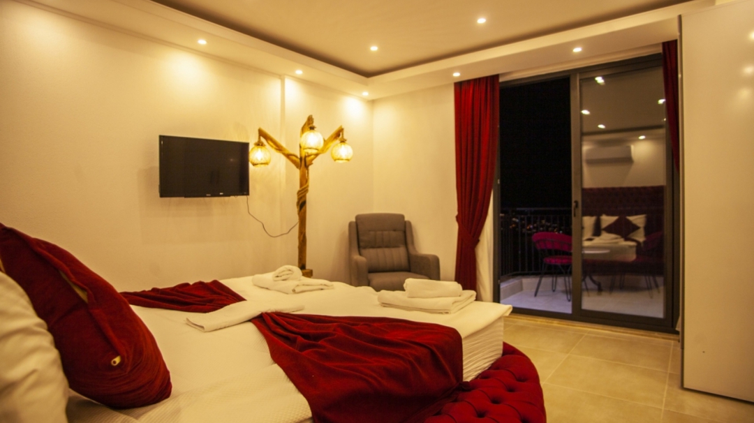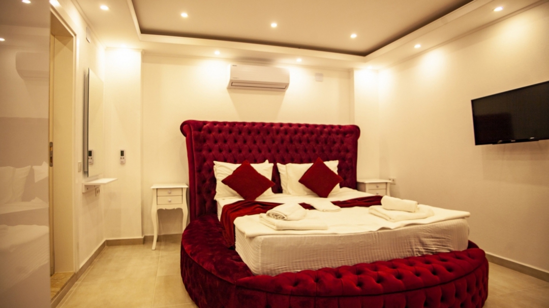 The upper floor consists of the master bedroom, indoor and heated pool. There is a sea view from this floor. Pool heating is activated at the request of the guest, for a fee. There are 2 sun loungers as equipment in the indoor pool area. The room is the master bedroom of the villa. It has a round double bed. Bergere, make-up table, balcony, wardrobe are the parts of this room. This room also has a bathroom.