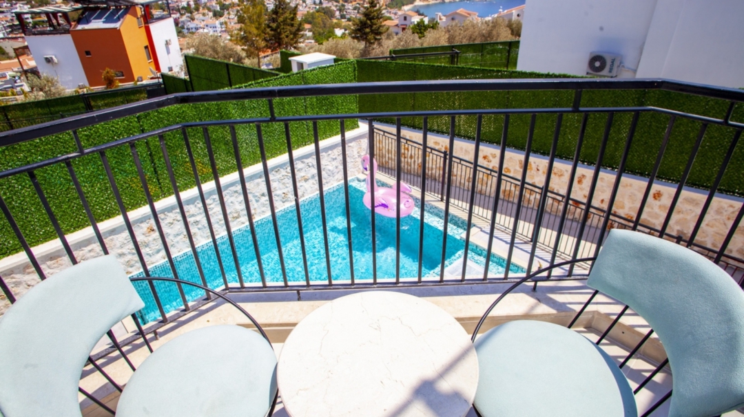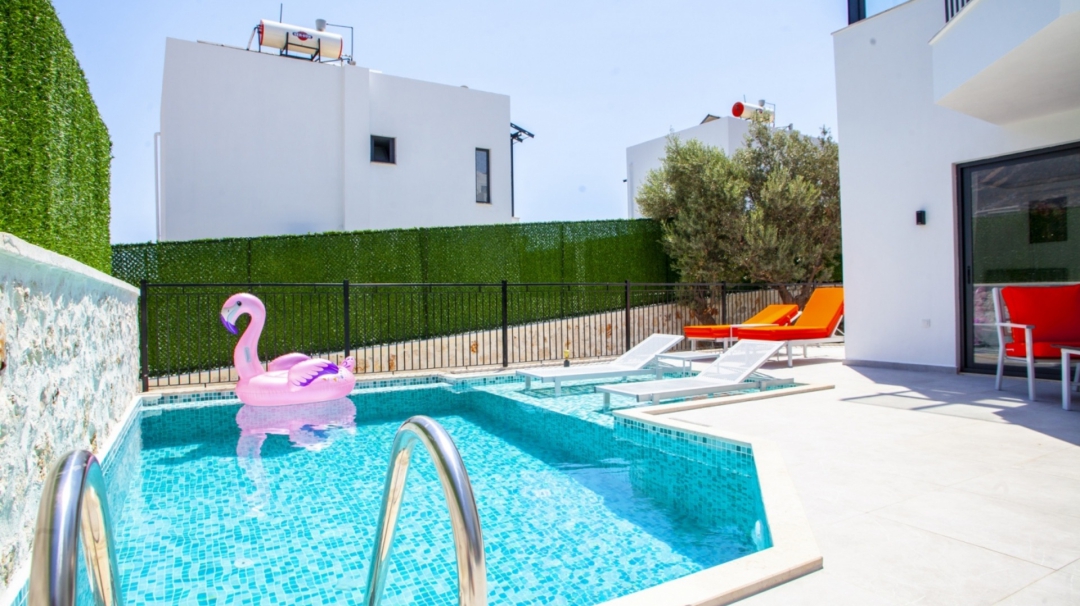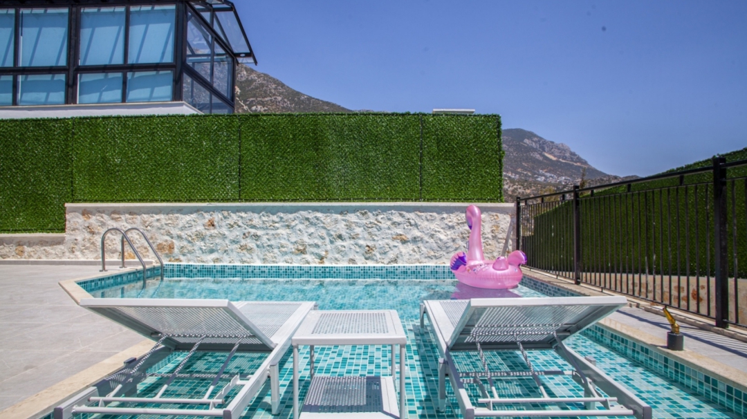 On the ground floor, there is a pool terrace, living room, open kitchen, room with two single beds. Seating group, dining table, sun loungers, umbrellas, barbecue, swing are the equipment of the pool terrace. In the kitchen, dining table, microwave oven, built-in kitchen equipment, tea maker are some of the equipment.The room on this floor has a bathroom. Wardrobe, bedside table, air conditioner are the equipment of this room.There is an exit to the pool area from the living room and room.