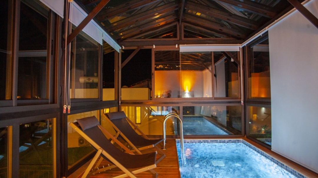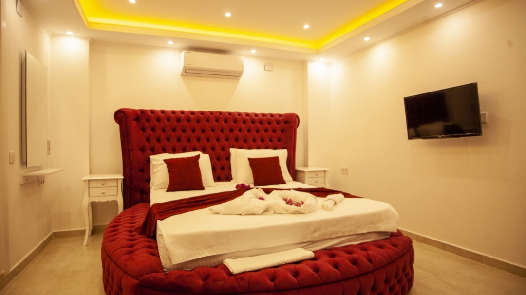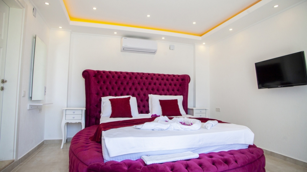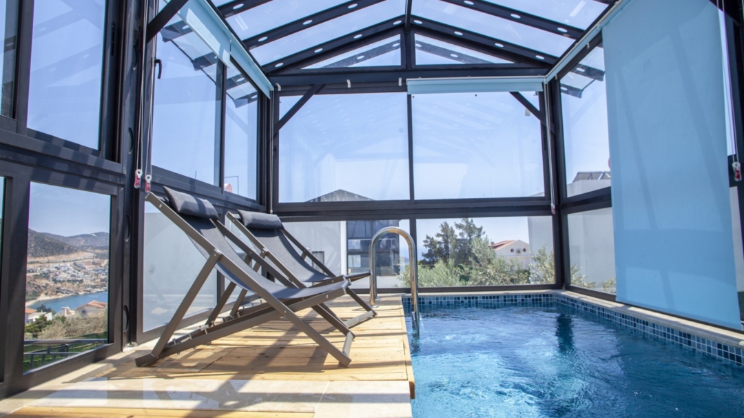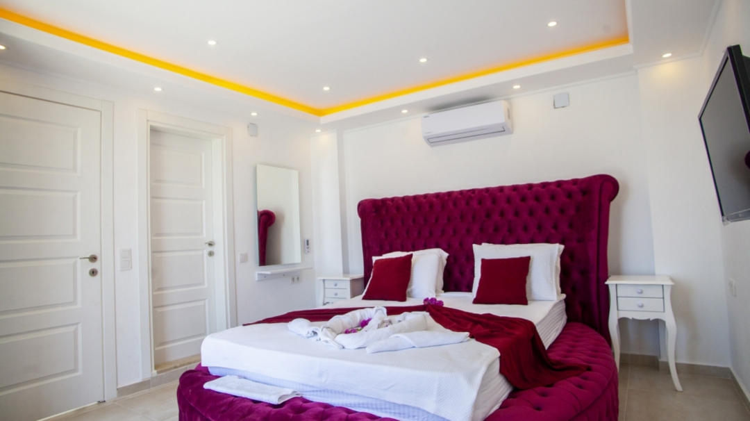 The upper floor consists of the master bedroom, indoor and heated pool. There is a sea view from this floor. Pool heating is activated at the request of the guest, for a fee. There are 2 sun loungers as equipment in the indoor pool area. The room is the master bedroom of the villa. It has a round double bed. Bergere, make-up table, balcony, wardrobe are the parts of this room. This room also has a bathroom.
