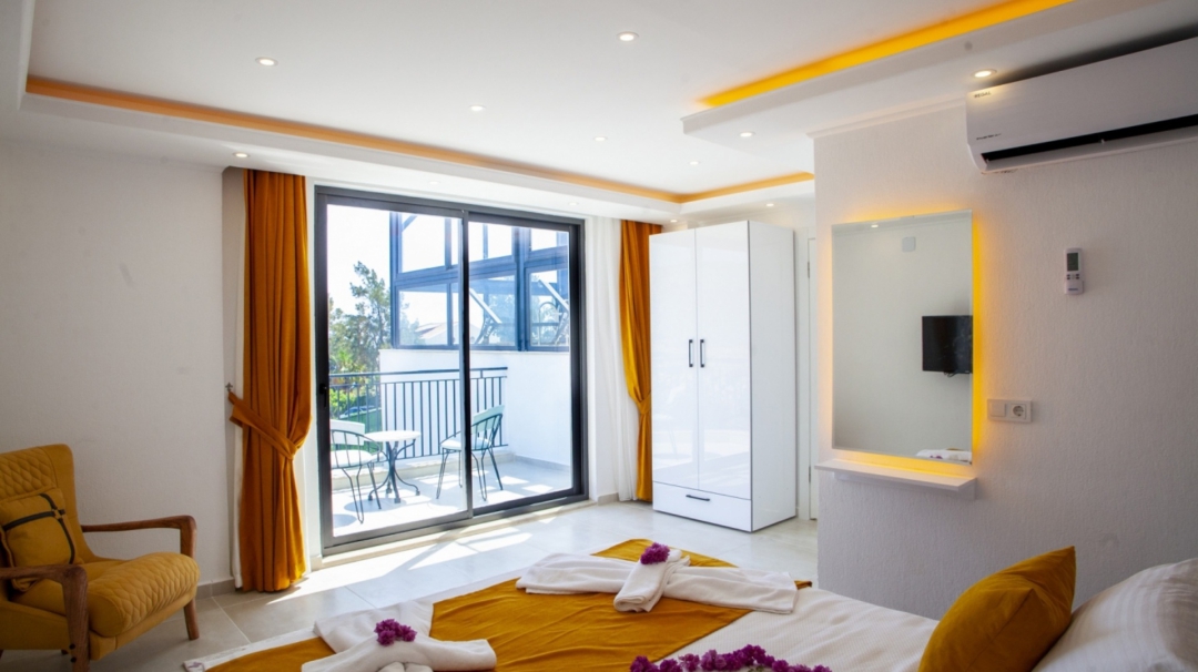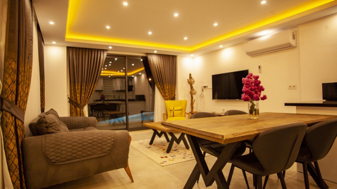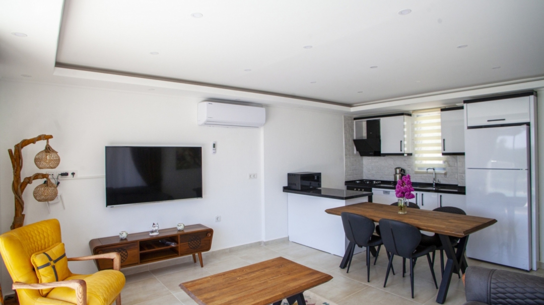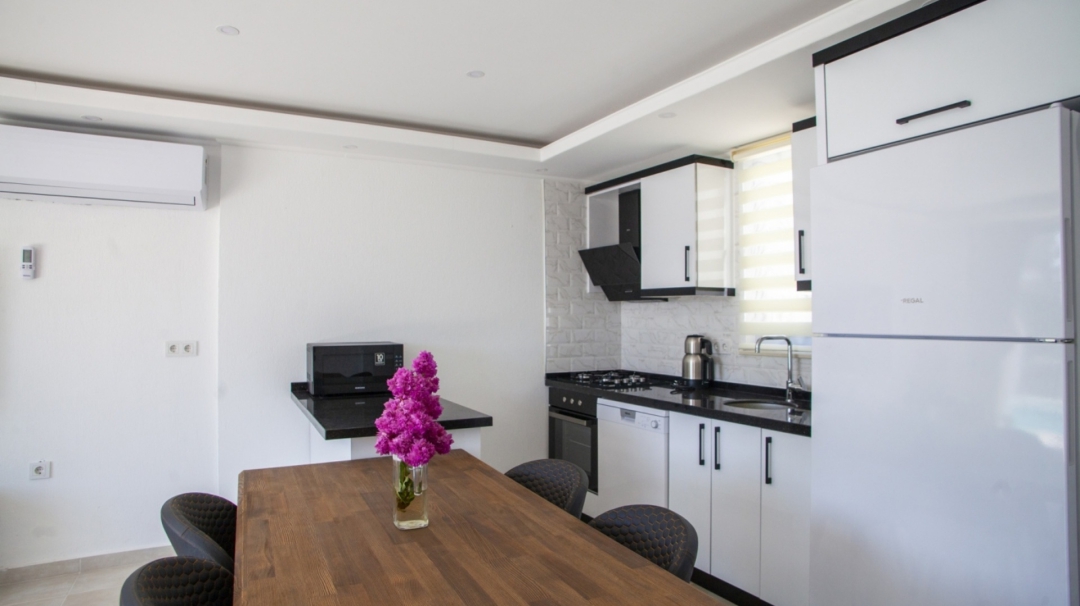 Located in Ortaalan, close to the center, the villa has two bedrooms. From this option, it is easy to reach the center on foot or by car. There are three more villas with the same capacity and similar plan in the same area. When 4 Villas are rented together, it creates a capacity of 16 people. Buildings with codes ABI6959, ABI7032, ABI7328 are the other villas located next to this villa.