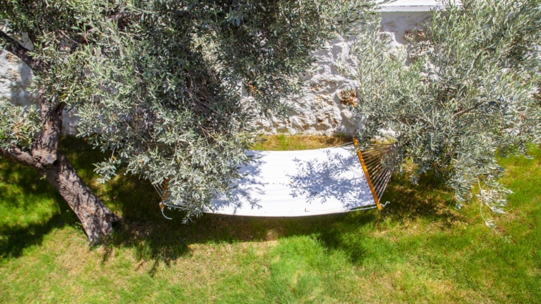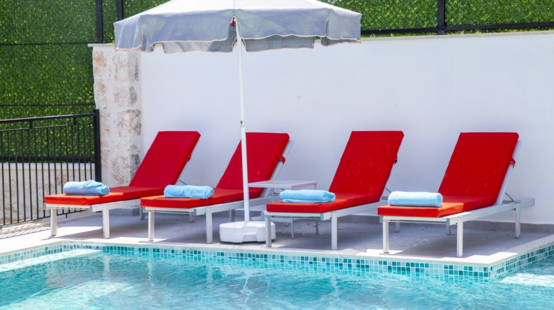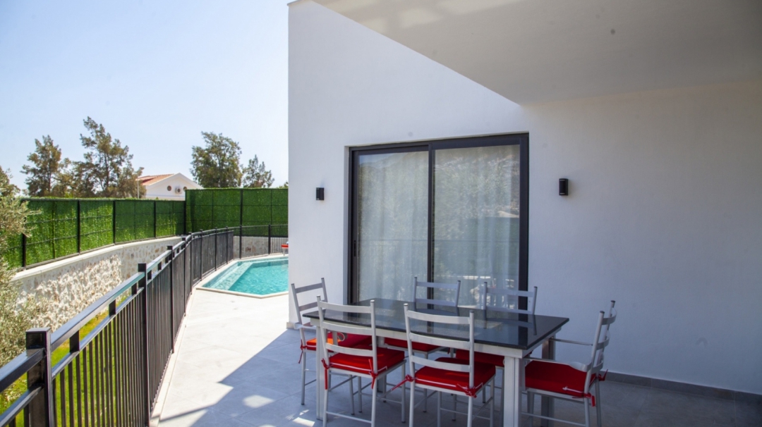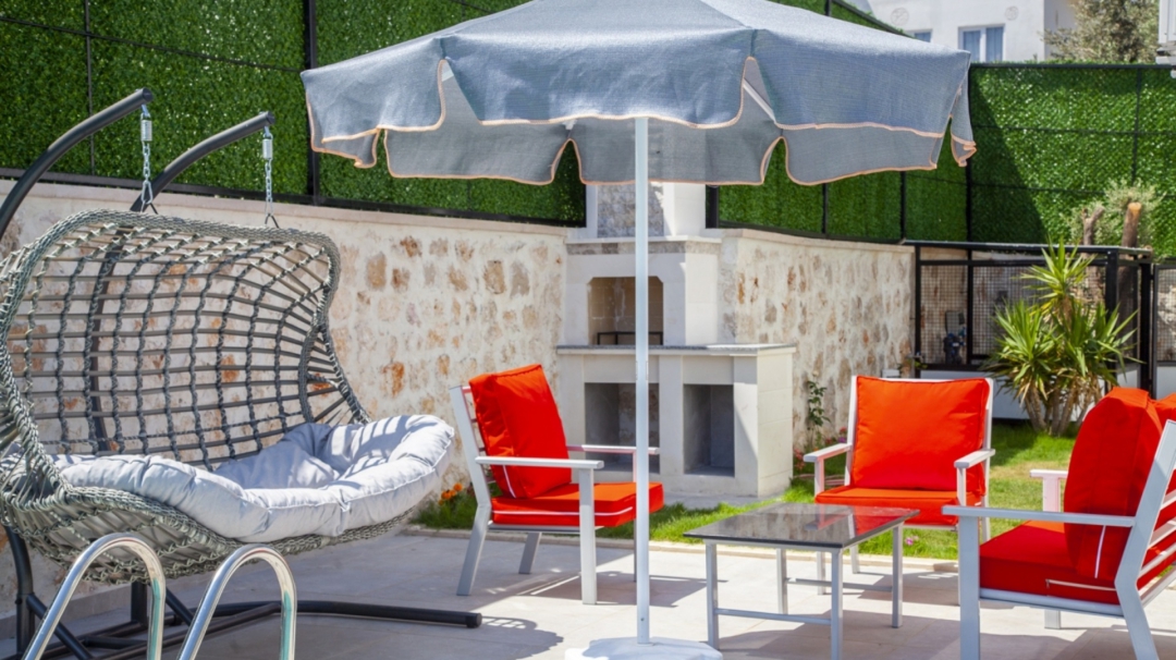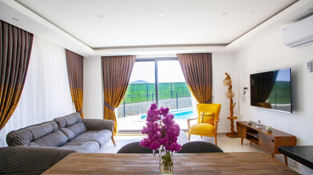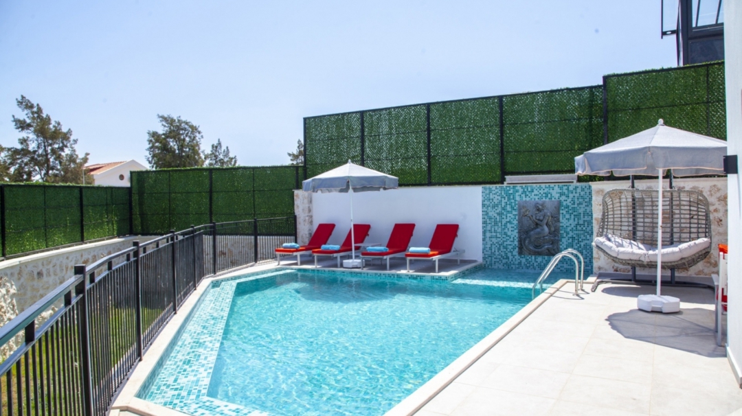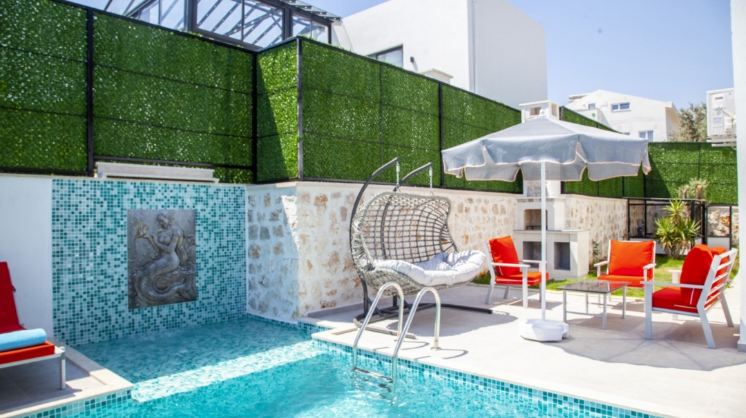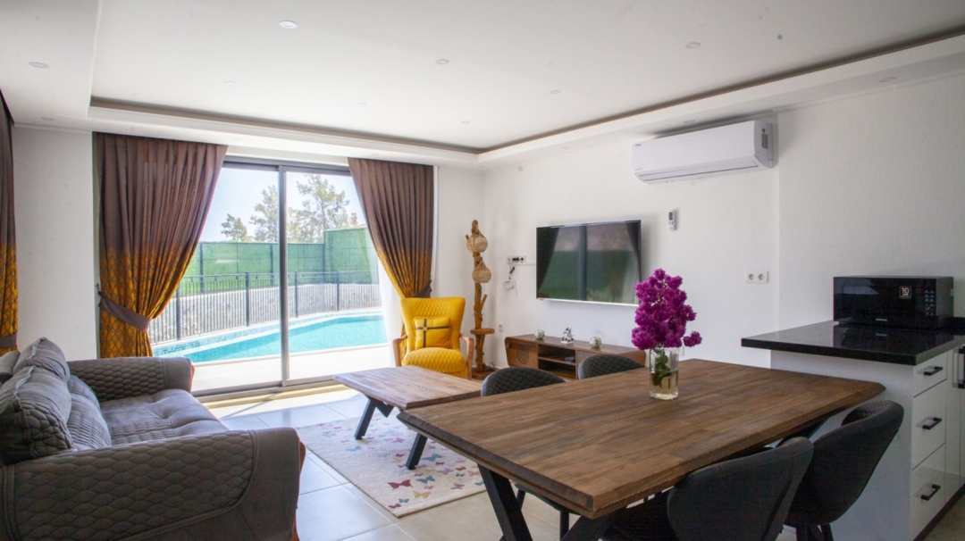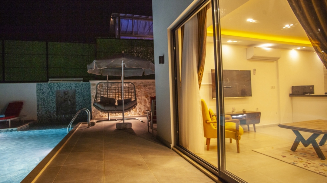 On the ground floor, there is a pool terrace, living room, open kitchen, room with two single beds. Seating group, dining table, sun loungers, umbrellas, barbecue, swing are the equipment of the pool terrace. In the kitchen, dining table, microwave oven, built-in kitchen equipment, tea maker are some of the equipment.The room on this floor has a bathroom. Wardrobe, bedside table, air conditioner are the equipment of this room.There is an exit to the pool area from the living room and room.