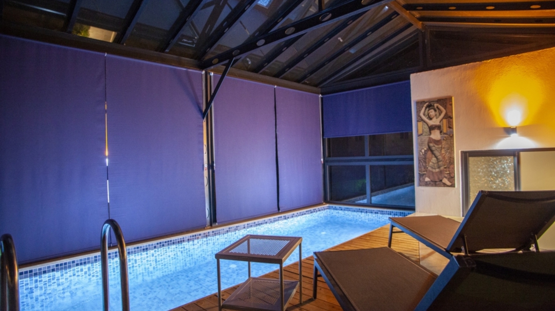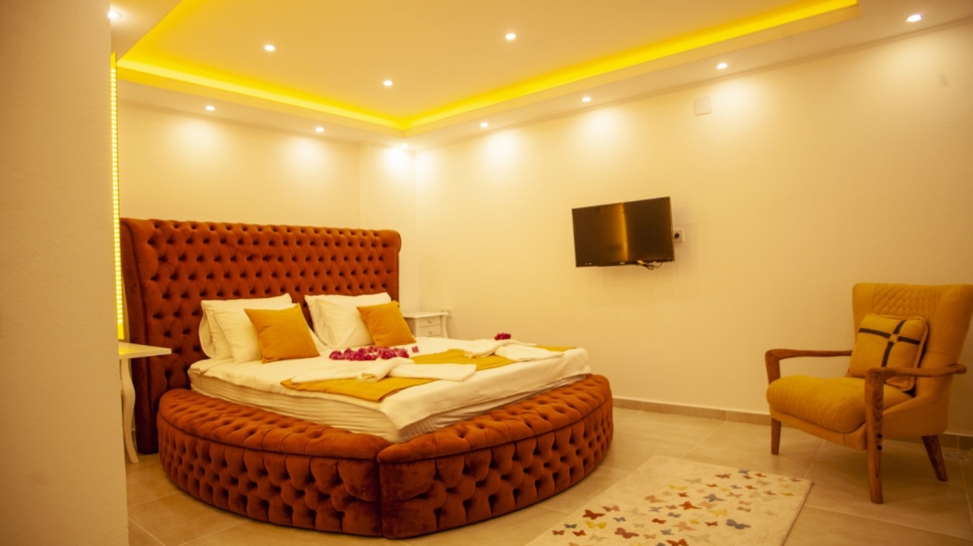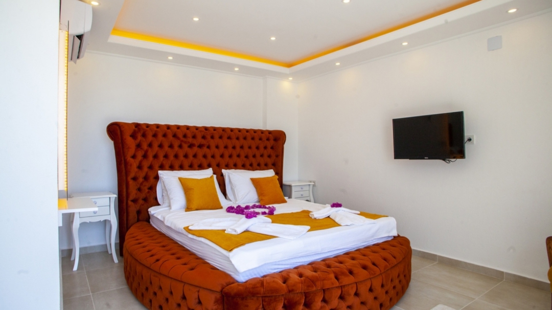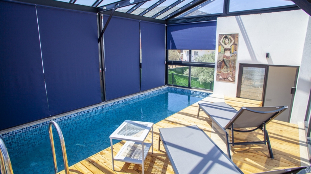 The upper floor consists of the master bedroom, indoor and heated pool. There is a sea view from this floor. Pool heating is activated at the request of the guest, for a fee. There are 2 sun loungers as equipment in the indoor pool area. The room is the master bedroom of the villa. It has a round double bed. Bergere, make-up table, balcony, wardrobe are the parts of this room. This room also has a bathroom.