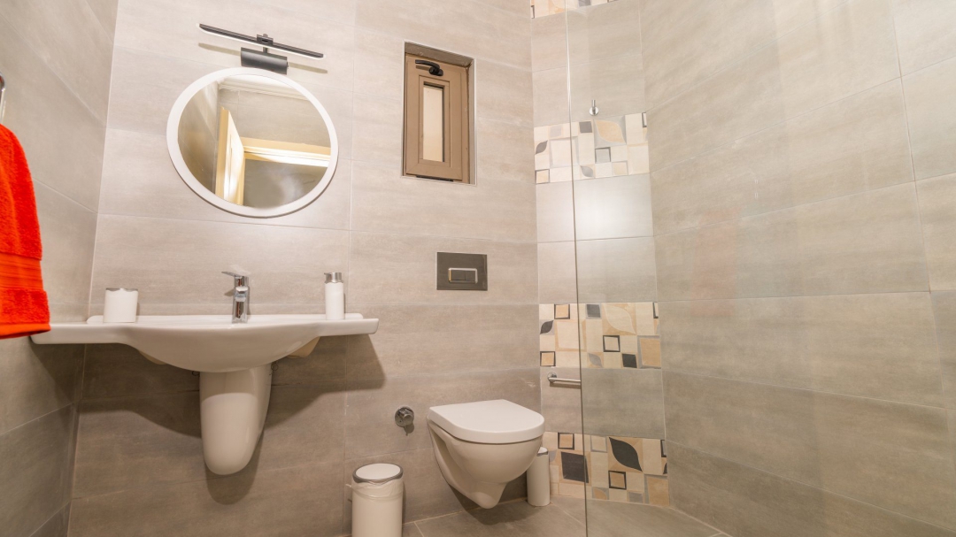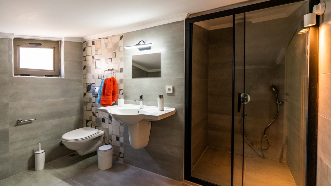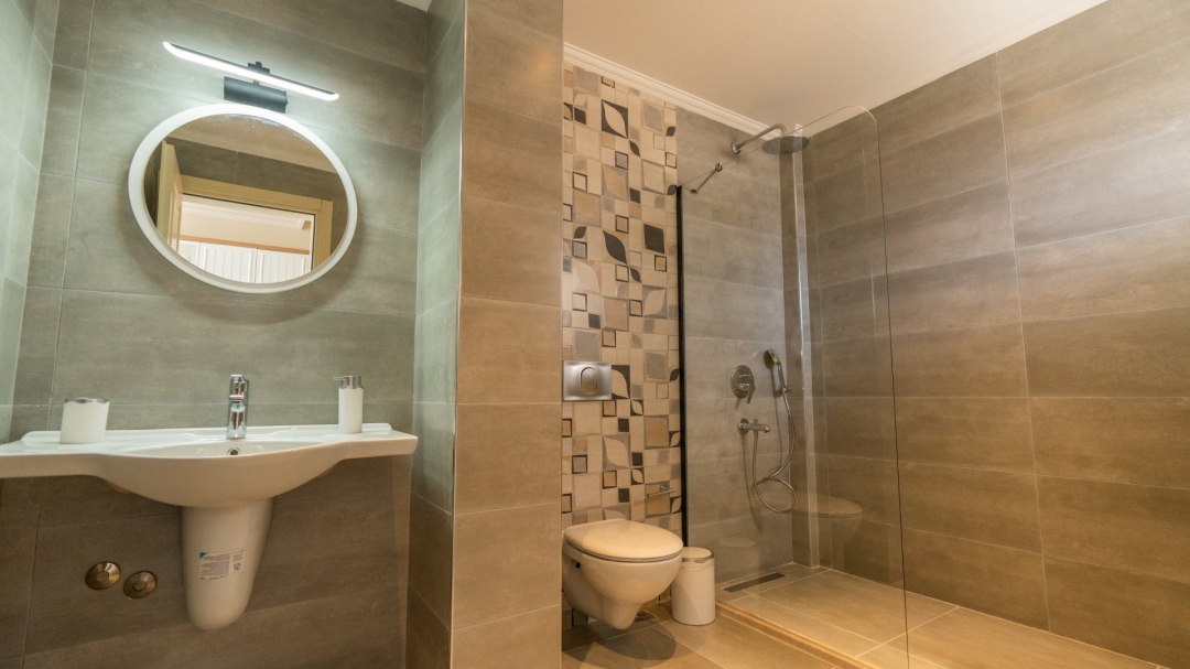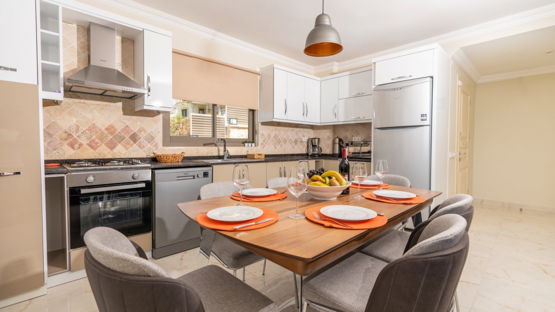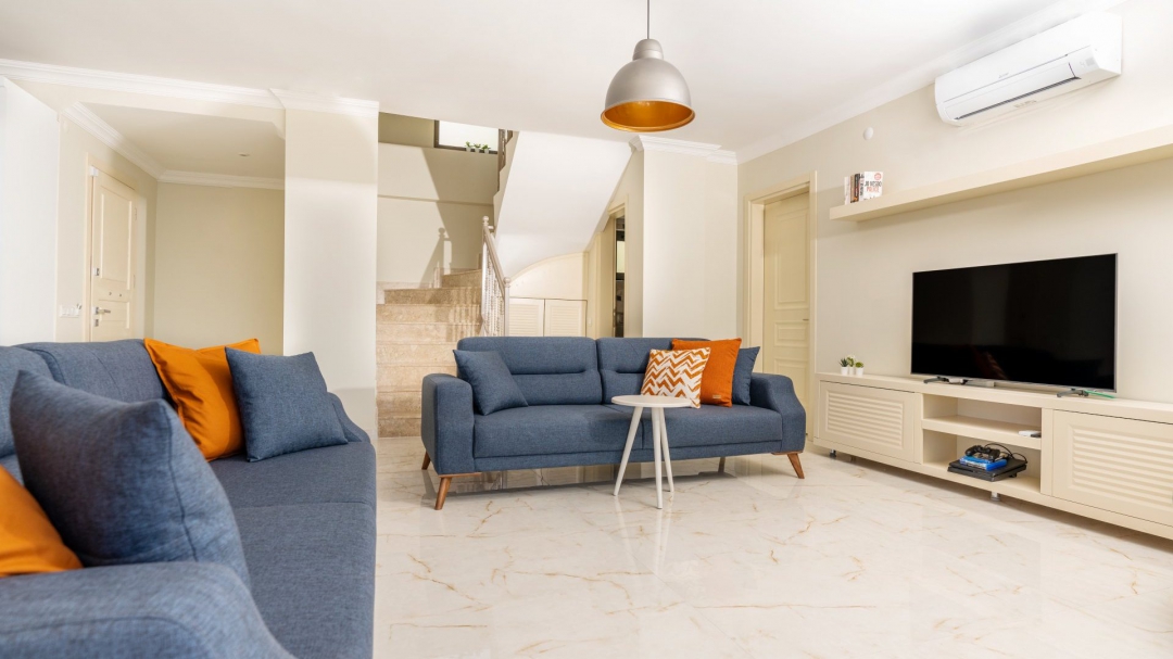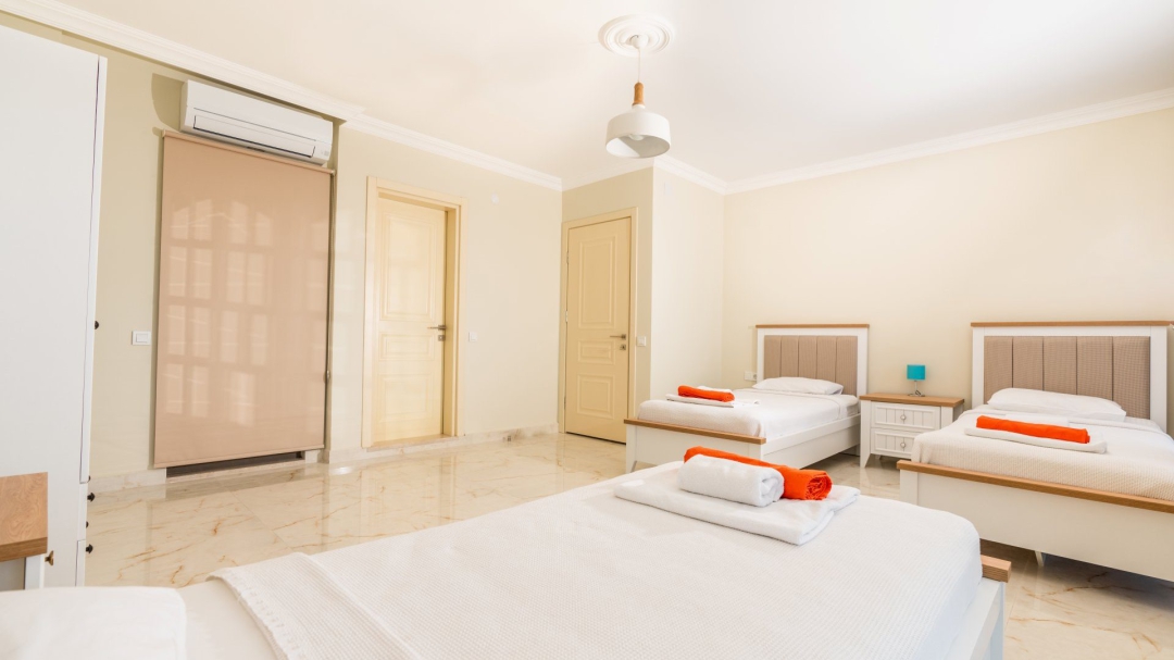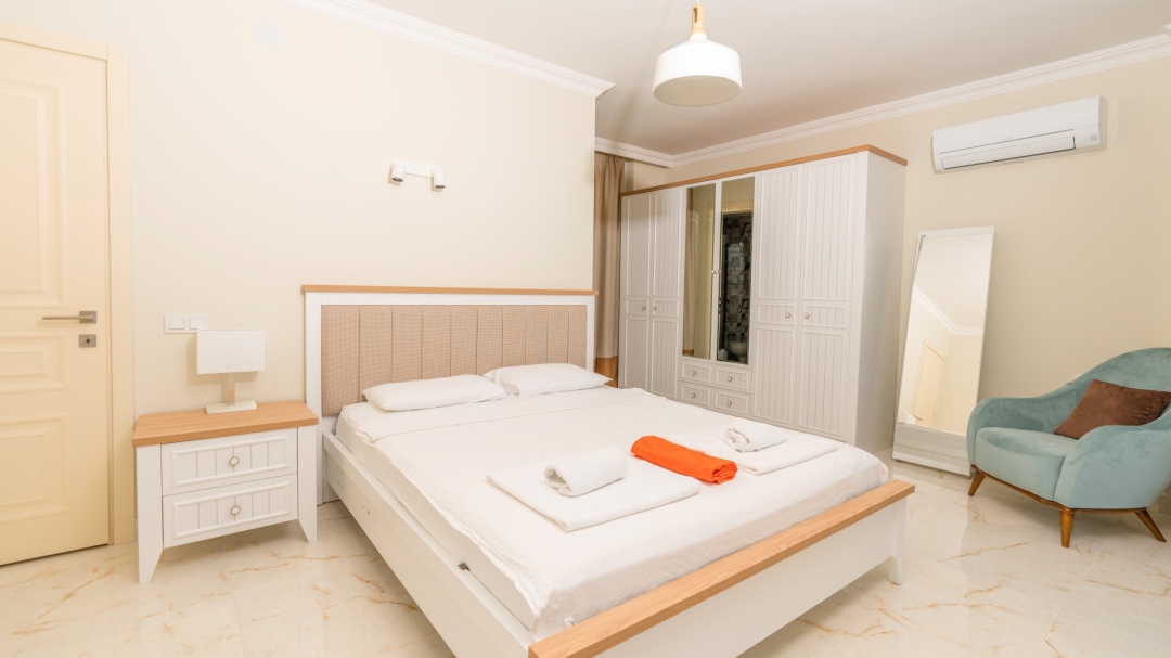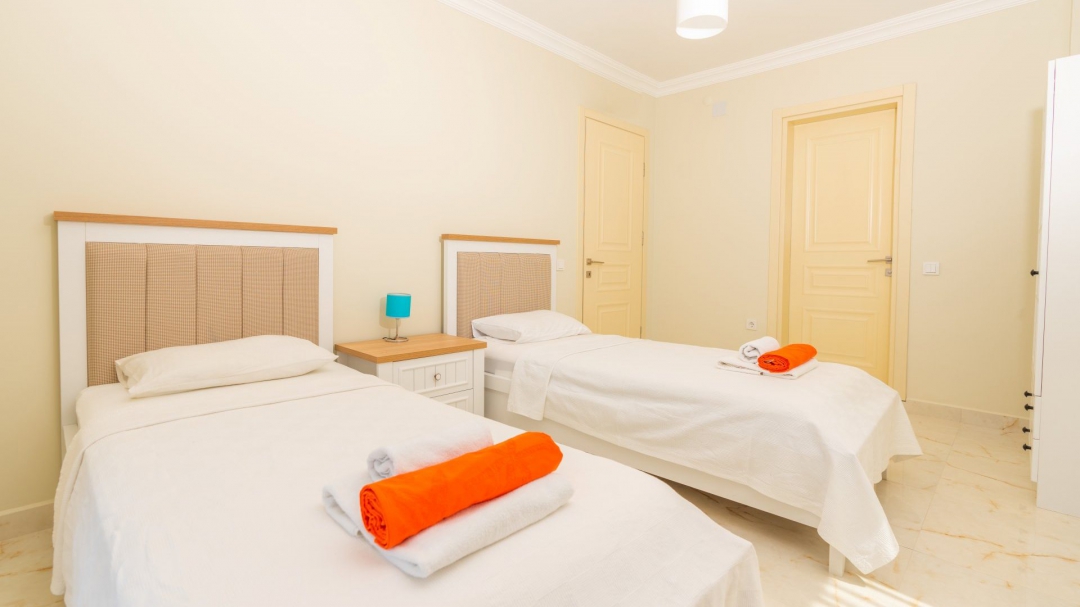 Ground floor; It consists of a living room, an open kitchen and a room with two single beds. There is an exit to the pool terrace from the living room and room. A wing chair, two 3-seater armchairs, a coffee table, a TV and a toilet for common use are the equipment that makes up the living room. The open kitchen with the dining table and the equipment you may need is also located on this floor. The room on the ground floor is ensuite. Wardrobe and nightstand are the equipments of this room.