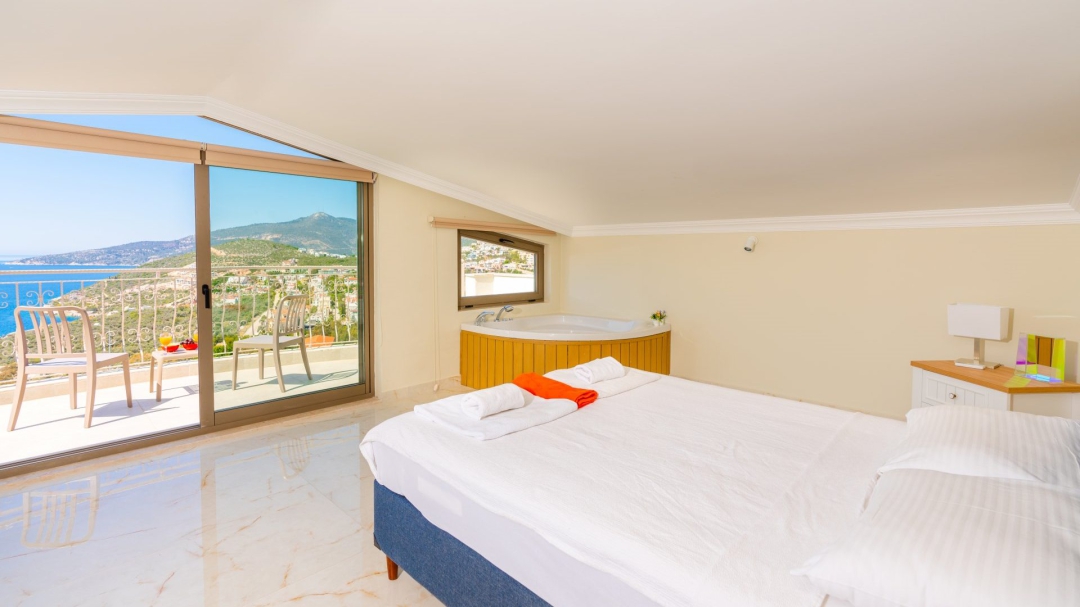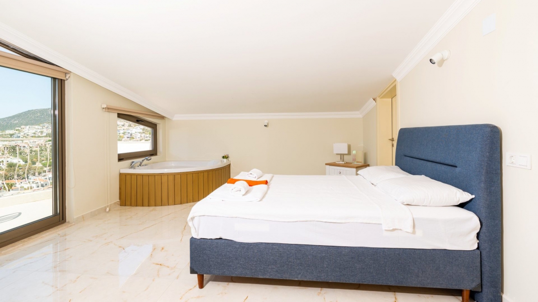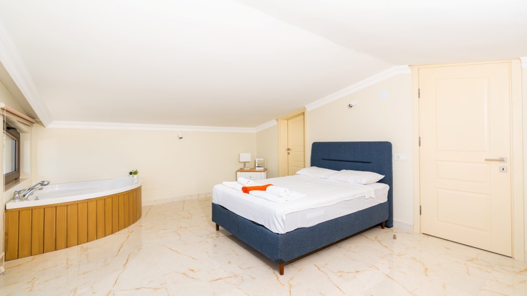 The master bedroom is located in the attic. This room has a large balcony and a bathroom. Double bed, Jacuzzi, armchair, nightstand, wardrobe are other items that fill this room.