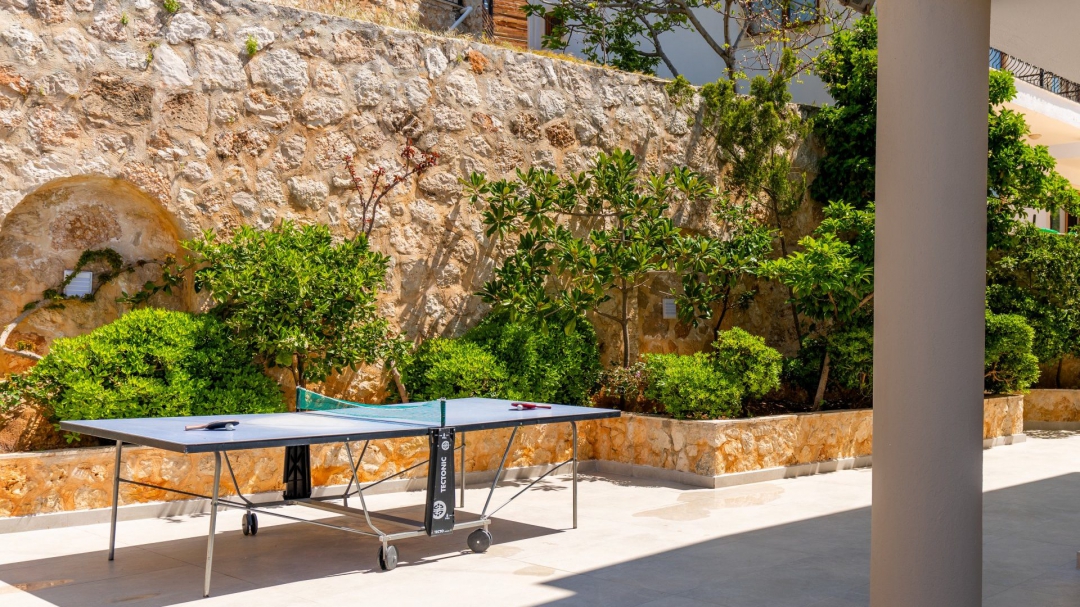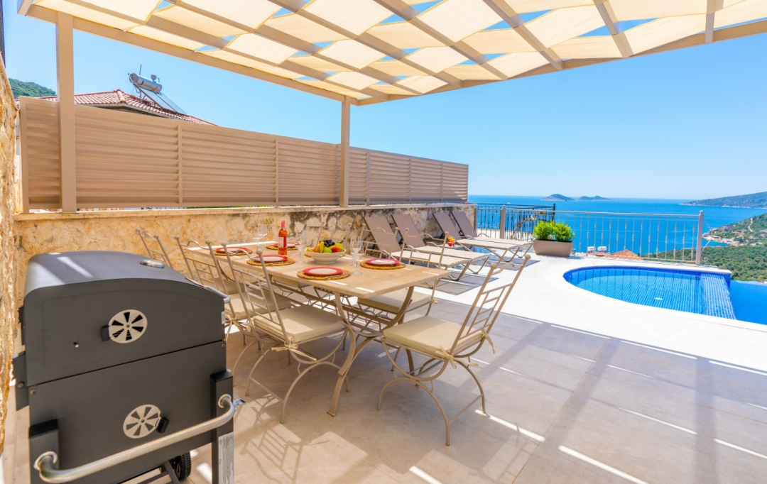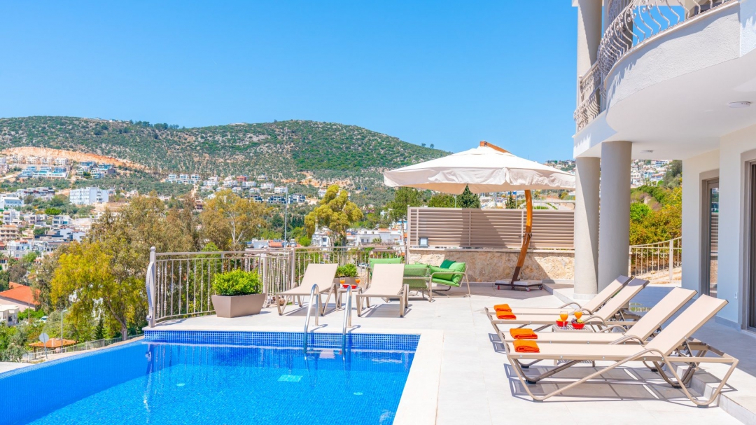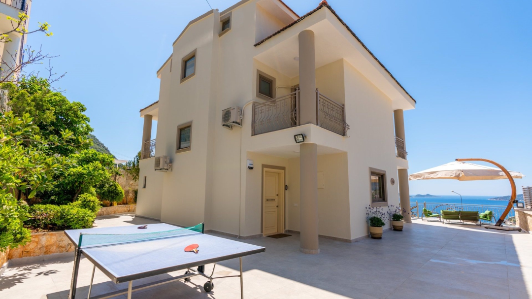 There are sun loungers, umbrella, sitting group, shade area, coffee table, dining table, table tennis in the pool area. A part of the pool is designed as a children's pool. This area looks at Kalkan and the sea view from a very wide angle.