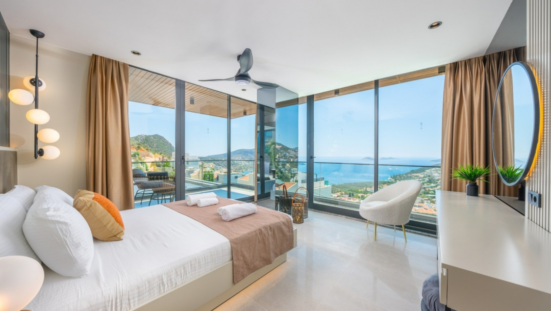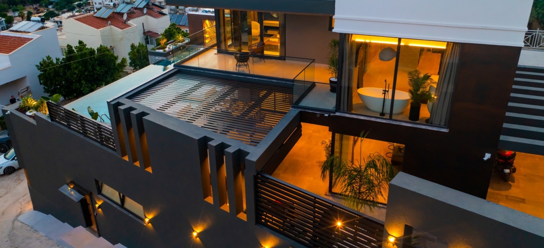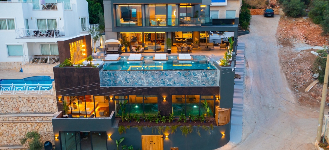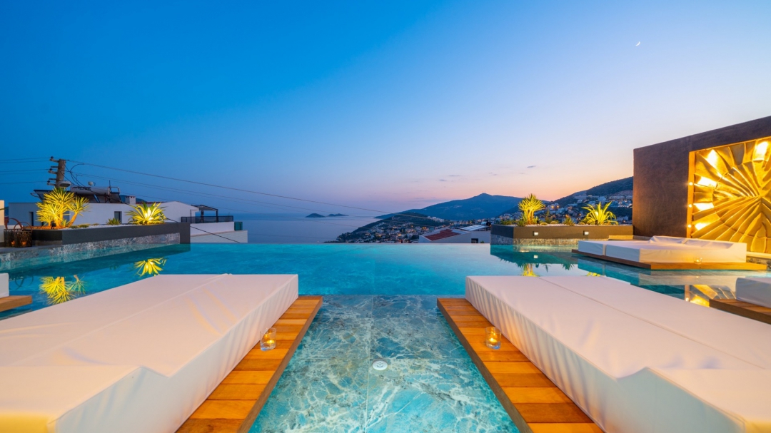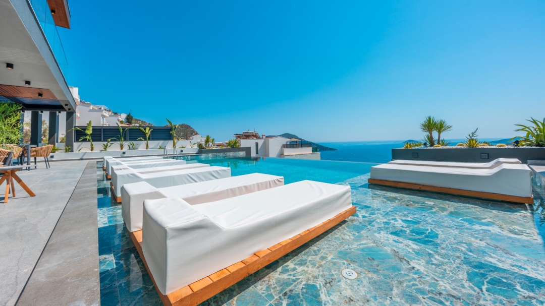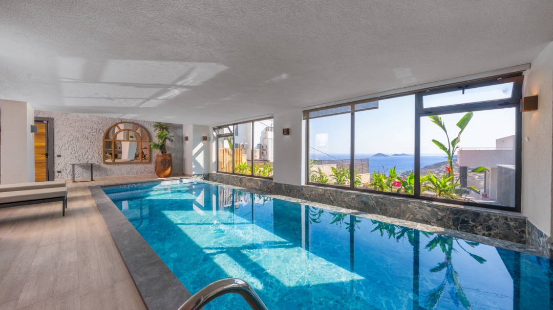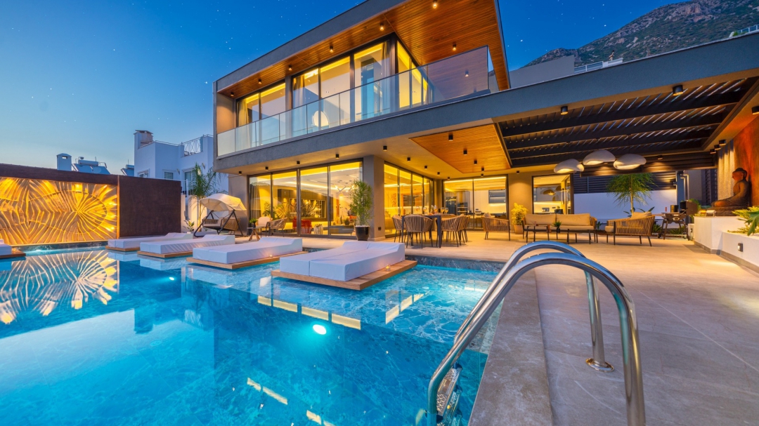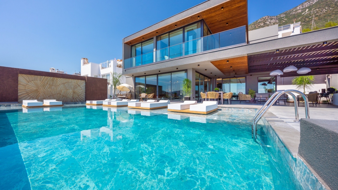 It is located in Kızıltaş, at a location that shows Kalkan and Kalkan Bay to its guests. The orientation of the villa faces south. Therefore, it receives maximum daylight during the day. Every detail has luxurious furnishings and modern architectural touches. It has all the equipment to meet the needs of a group of 10 people. Three of the five bedrooms have double beds and the other two have twin beds. All rooms of the villa are en-suite. Hammam, sauna, indoor and heated pool, fitness area are some of the equipment it has. Two pools have a salt water system. Central system air conditioning is used throughout the villa.