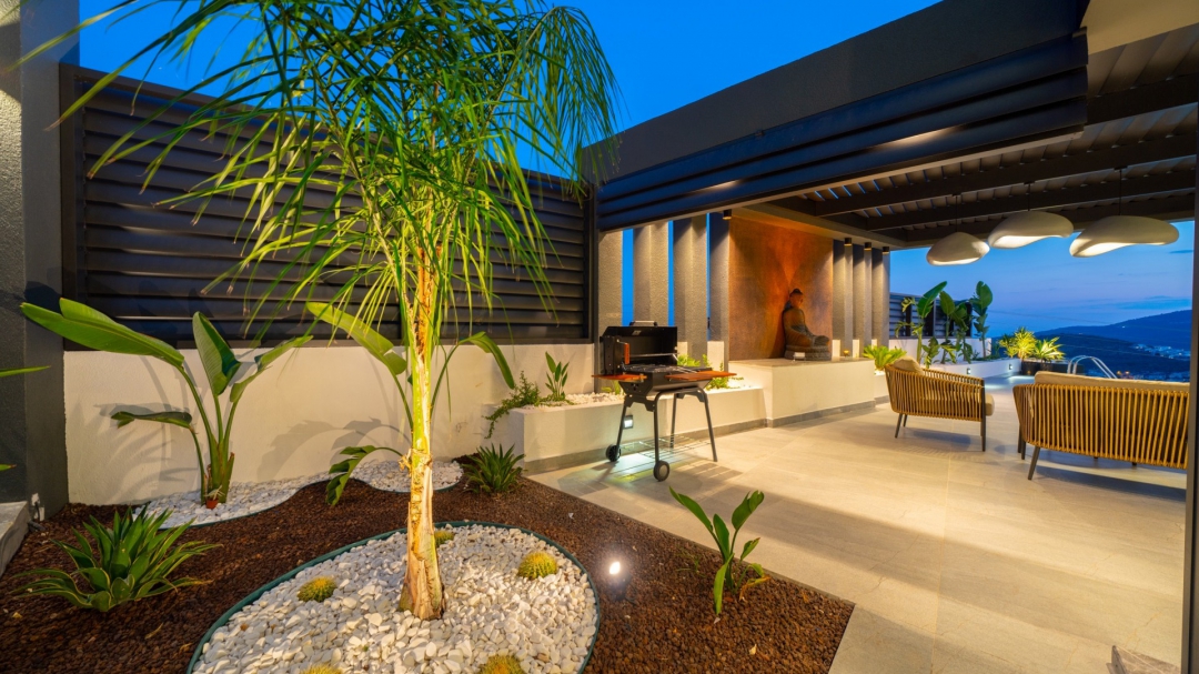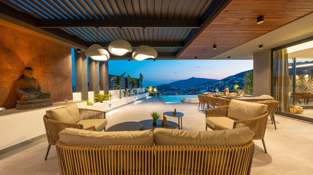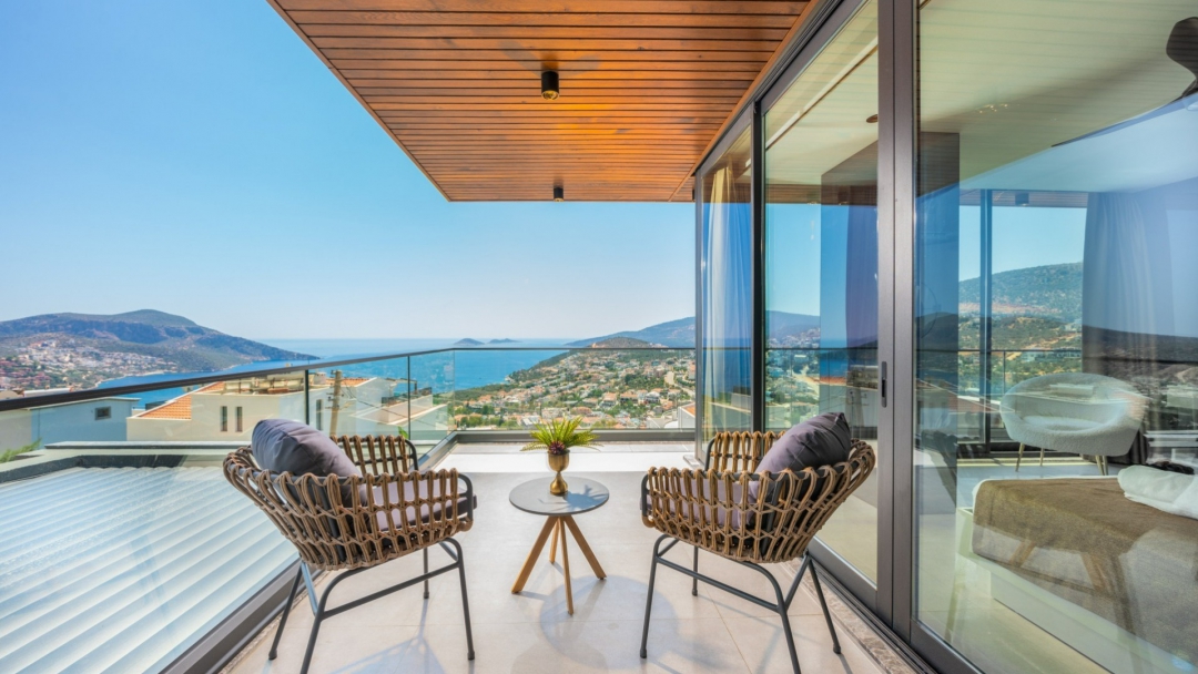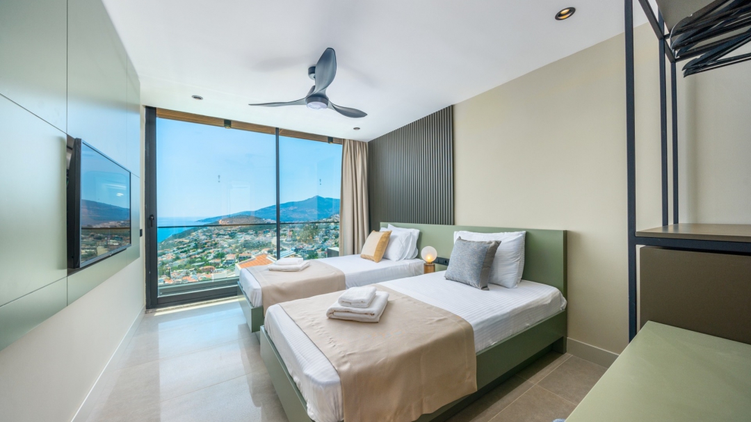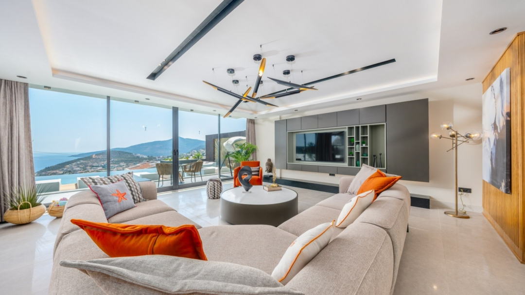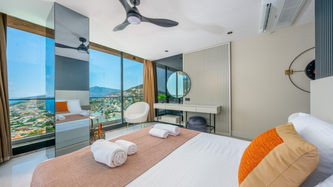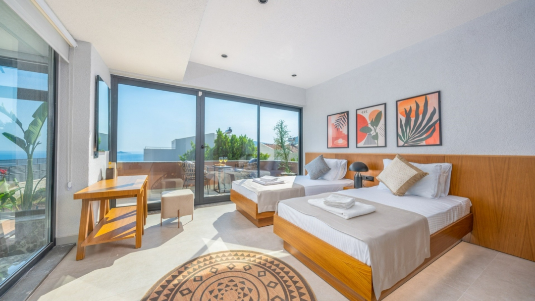 It is located in Kızıltaş, at a location that shows Kalkan and Kalkan Bay to its guests. The orientation of the villa faces south. Therefore, it receives maximum daylight during the day. Every detail has luxurious furnishings and modern architectural touches. It has all the equipment to meet the needs of a group of 10 people. Three of the five bedrooms have double beds and the other two have twin beds. All rooms of the villa are en-suite. Hammam, sauna, indoor and heated pool, fitness area are some of the equipment it has. Two pools have a salt water system. Central system air conditioning is used throughout the villa.