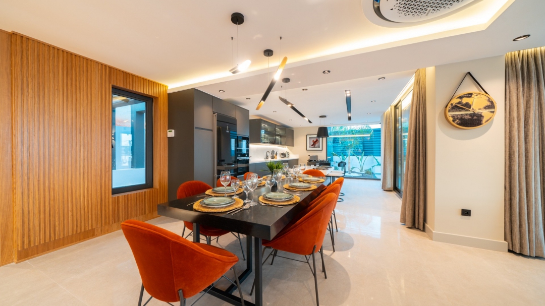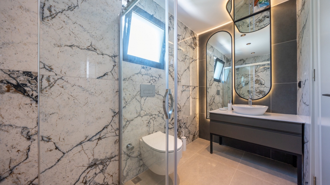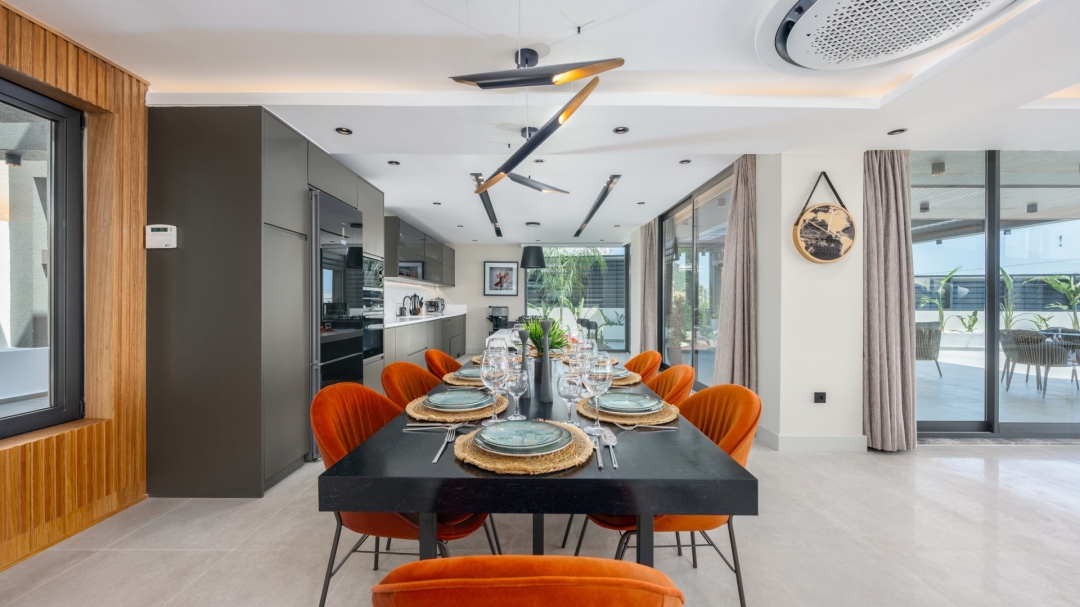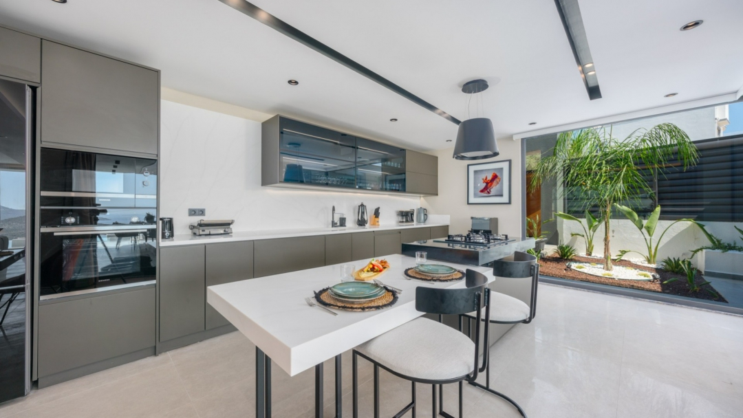 On the ground floor there is the living room, kitchen and pool terrace.Indoor area and pool terrace are transitive. In the living room, furniture such as a corner sofa set, center table, nesting table, TV are integrated with the pleasant colors and stylish accessories used for this area. The kitchen, which is generally white and gray for its furniture, has electric kitchen utensils such as kettle, toaster, Turkish coffee machine as well as built-in appliances. A dining table for 8 people and an island kitchen counter and two bar chairs in the kitchen section complete the dining area, sufficient for the capacity.