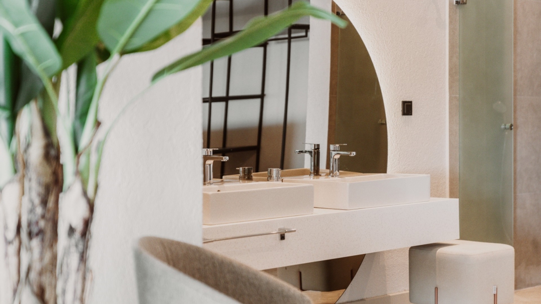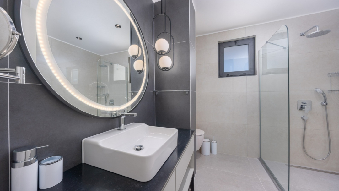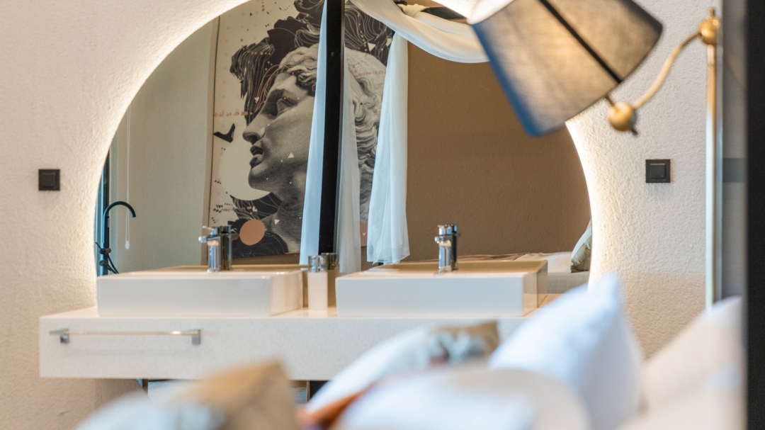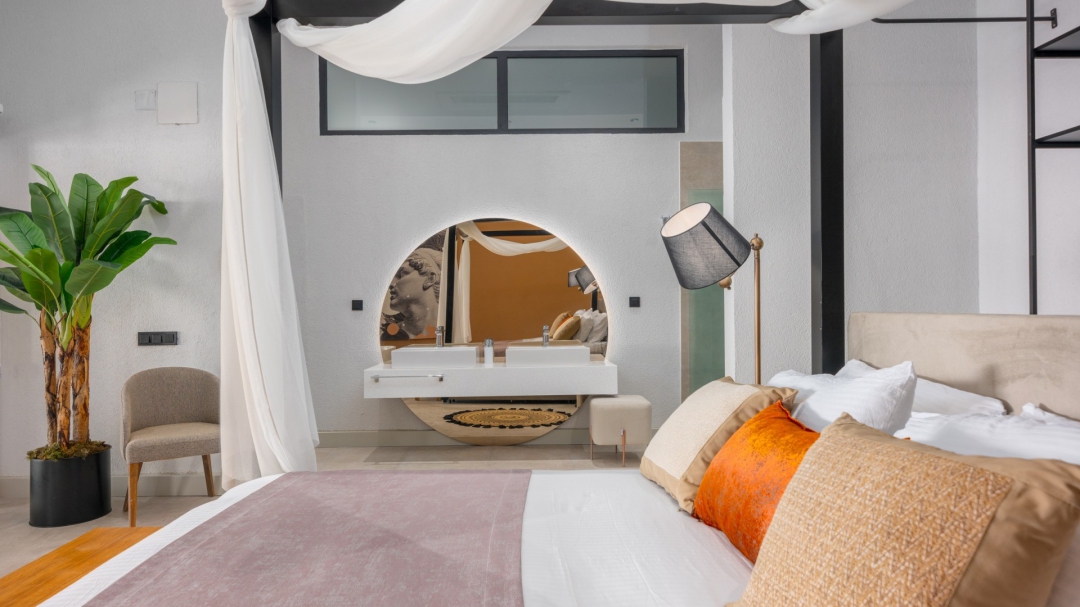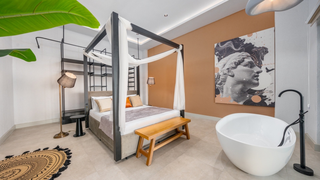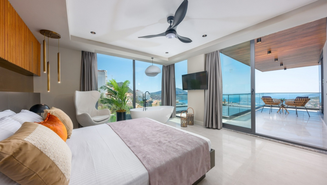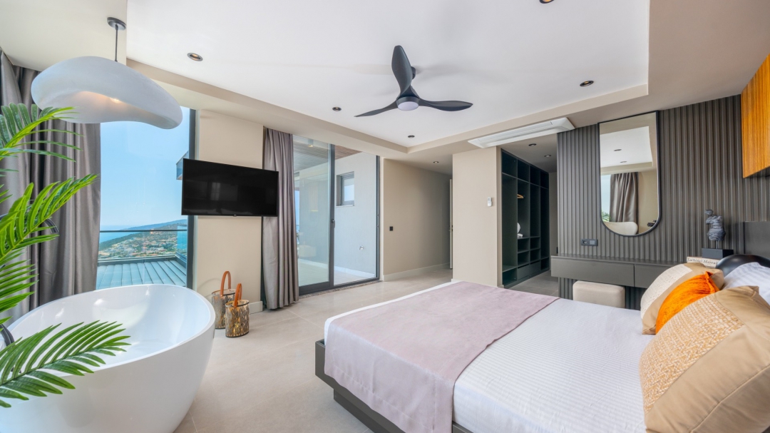 Three of the five bedrooms of the villa are located on the first floor. The first room on the east side has a sea view like the whole villa. Along with a double bed, make-up table, TV, wardrobe and dressing area, ceiling fan, an aesthetic bathtub, a wing chair, a large balcony are the elements that complete this room. The balcony in front of this room has two comfortable chairs and a coffee table.