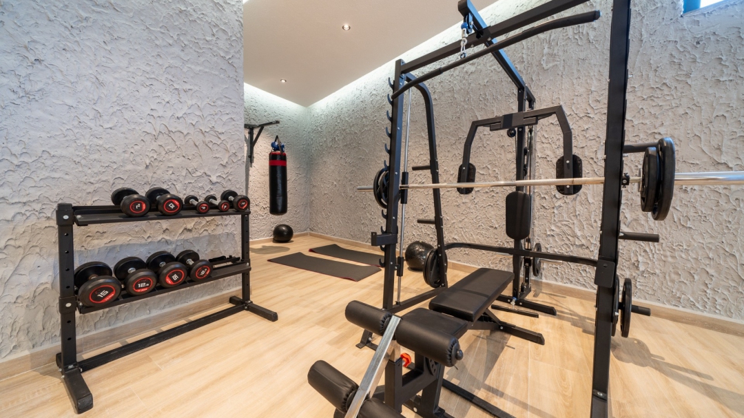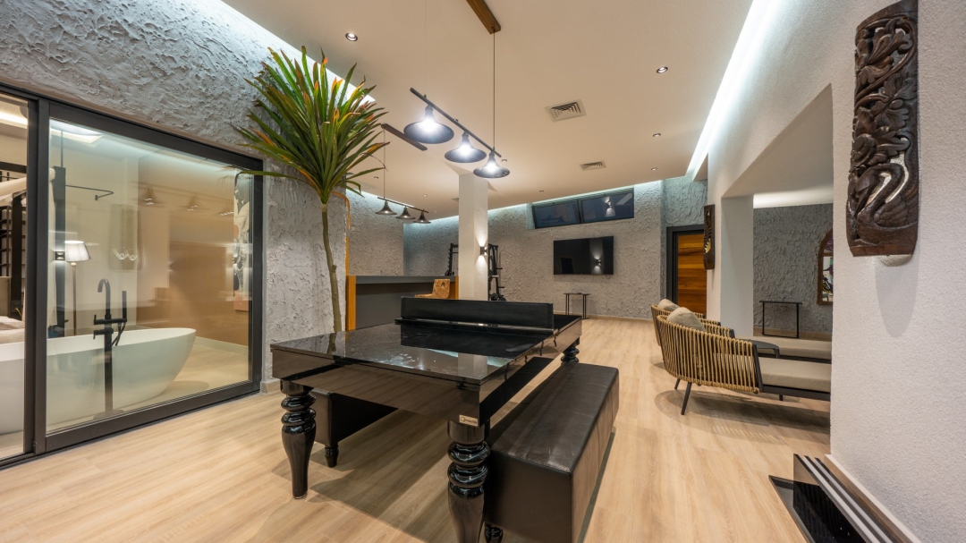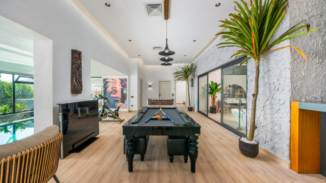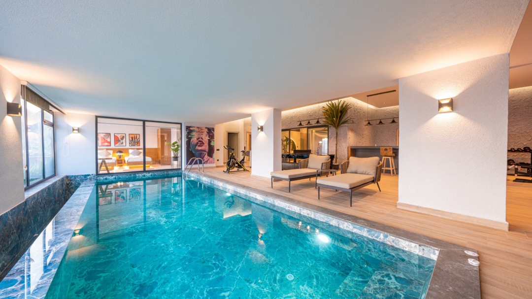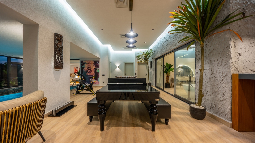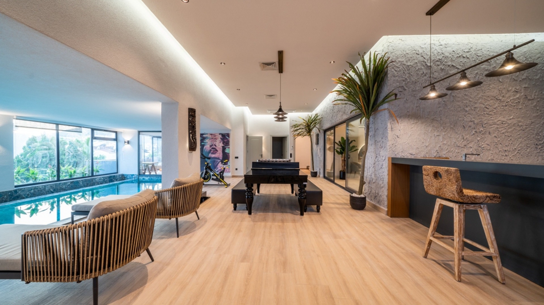 On the floor below the pool terrace is the indoor pool with heating system. Sauna, Turkish bath, fitness area and the last two rooms of the villa are the other parts that complete this floor. There are sun loungers, a sitting group and a stationary bike next to the indoor pool. There is a bar area serving this floor. A black table suitable for multiple uses such as table tennis, dining table and billiards is also one of the stylish furniture of this area. Located next to the pool, this area also acts as a corridor connecting all the sections on this floor.