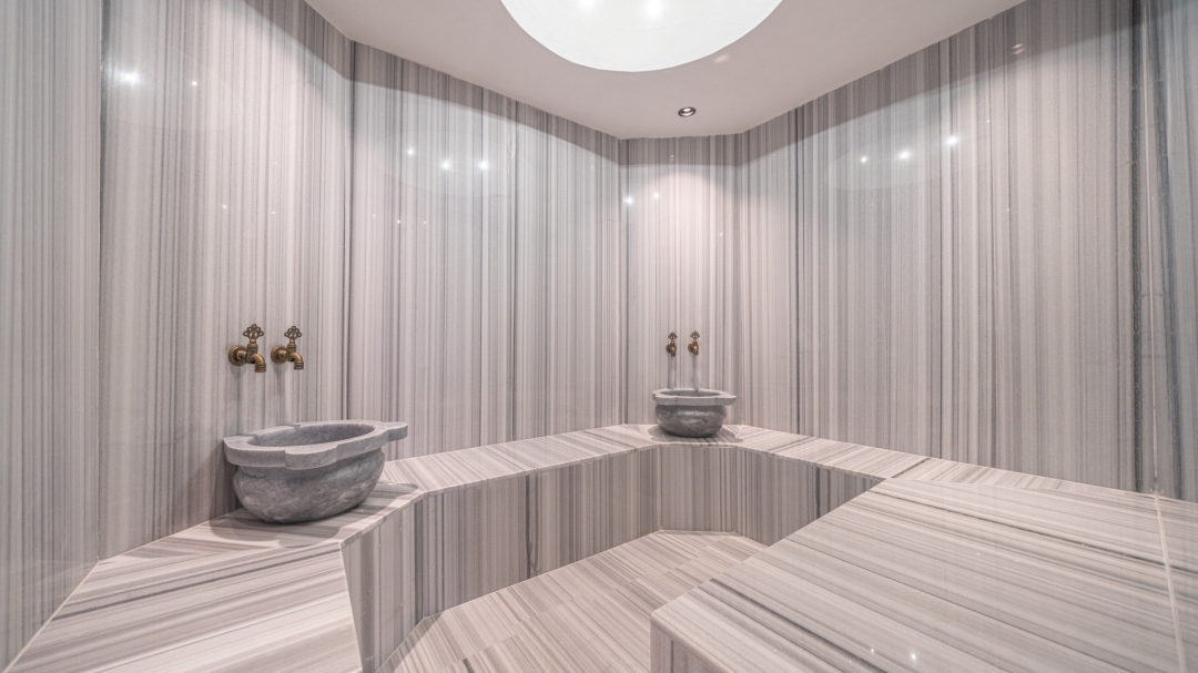 To the north of the indoor pool is the fourth bedroom. In the room with a double bed, there is also an aesthetic bathtub, vanity table, wardrobe, furniture such as wing chair. The bar and fitness area are located to the east of this room, while the sauna and Turkish bath are located to the west. The last bedroom is located to the southwest of this room, right next to the indoor pool.