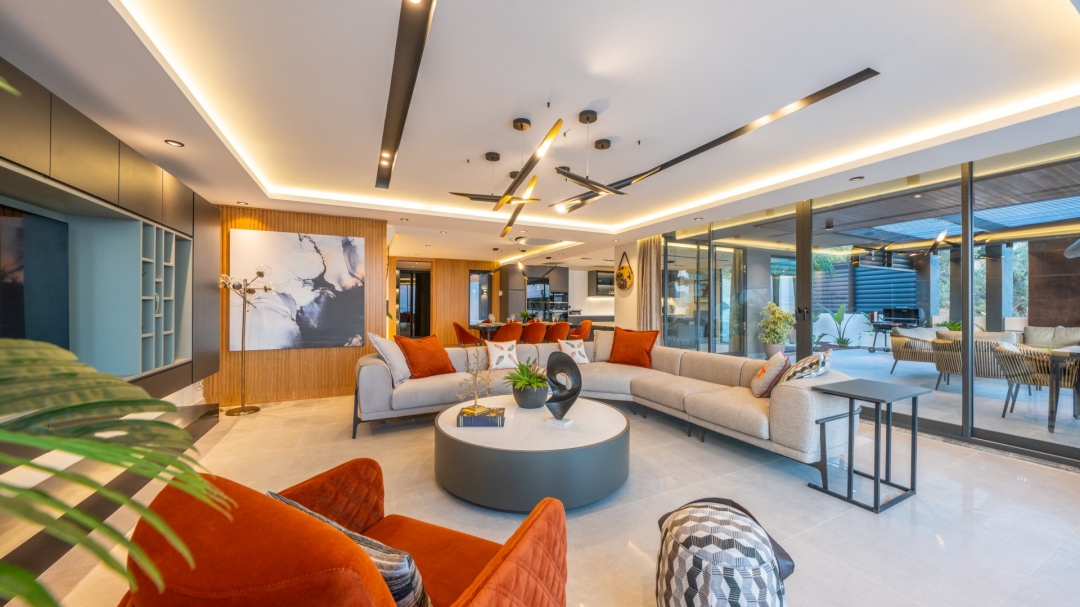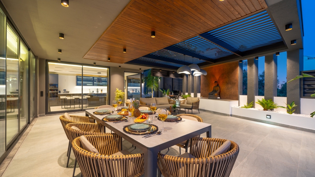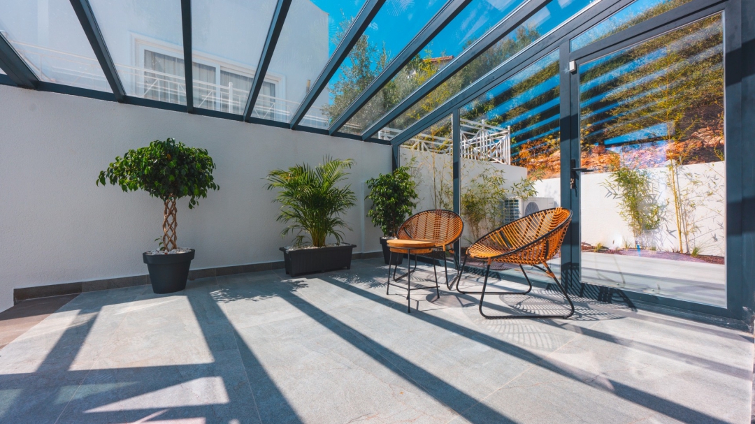 On the pool terrace, there are twin sun loungers, four of which are lined up side by side and one of them is at the poolside. The areas with sun loungers in the infinity pool of the villa are shallow. A pleasant garden swing, dining table under the camellia, sitting group, barbecue are other elements that complete this area. In addition, on the ground floor, behind the villa, there is a winter garden surrounded by transparent materials, where you can benefit from sunlight without being exposed to the wind and read a book.