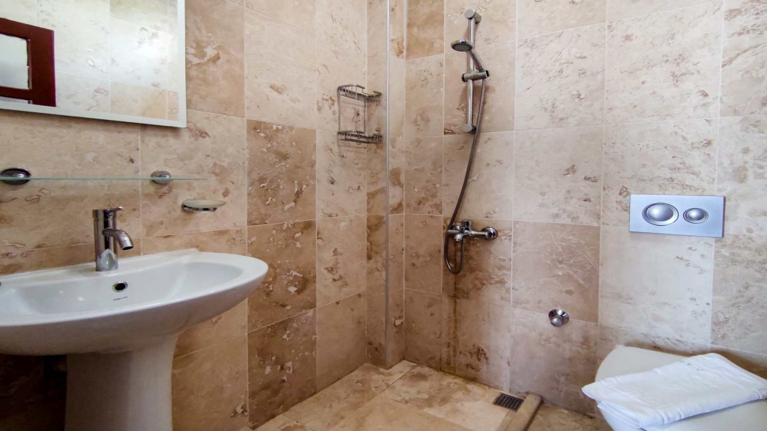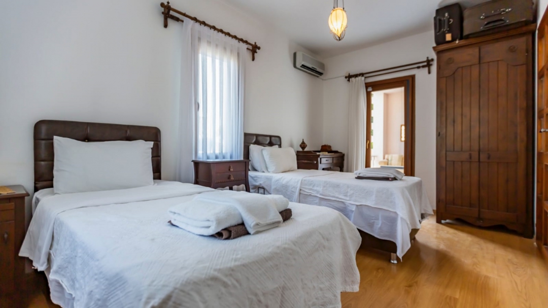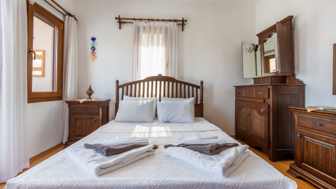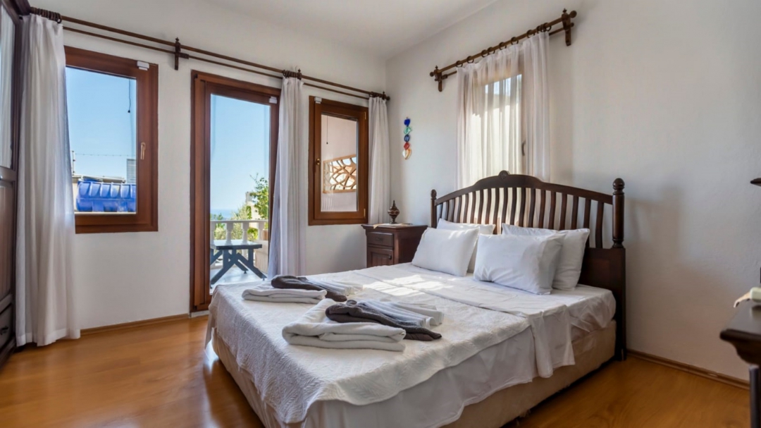 When you climb the stairs to the upper floor, the first door that welcomes you opens to a toilet and shower for common use. The other two doors lead in turn to the first room with two single beds and the master bedroom with a double bed. A lovely balcony in front of the master bedroom is an alternative place to read a book.