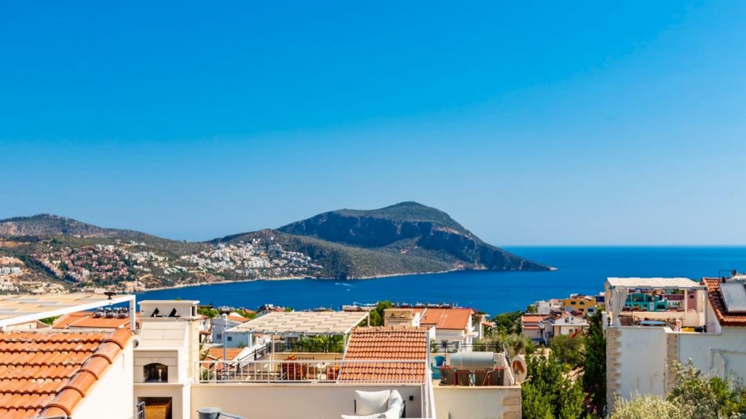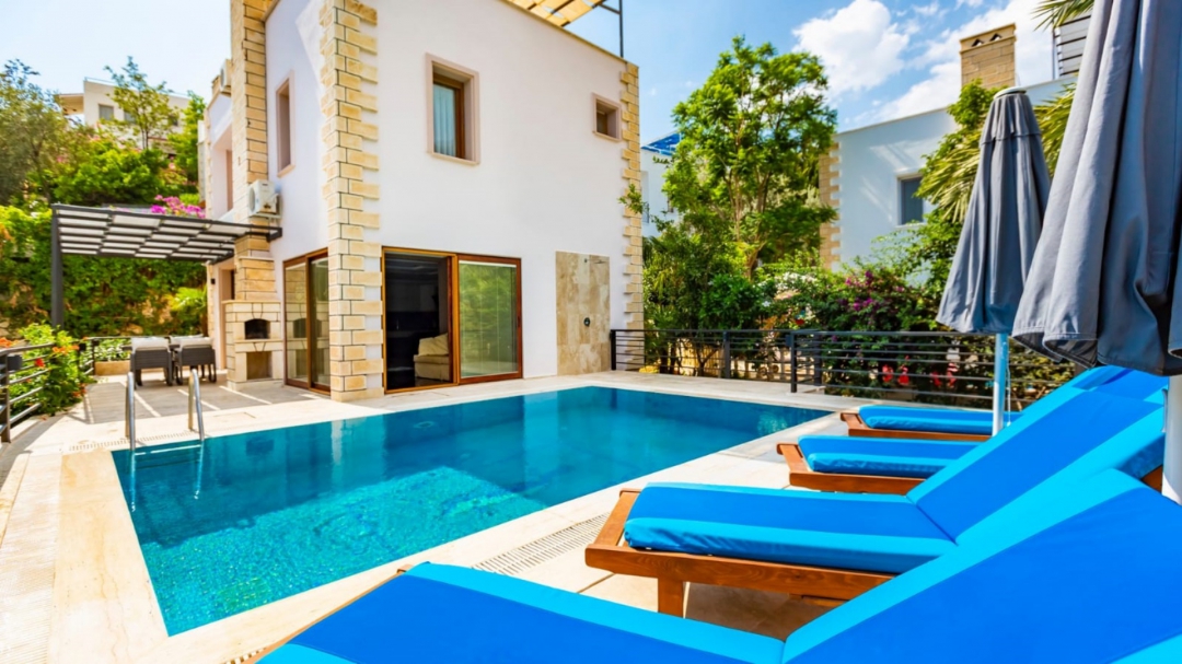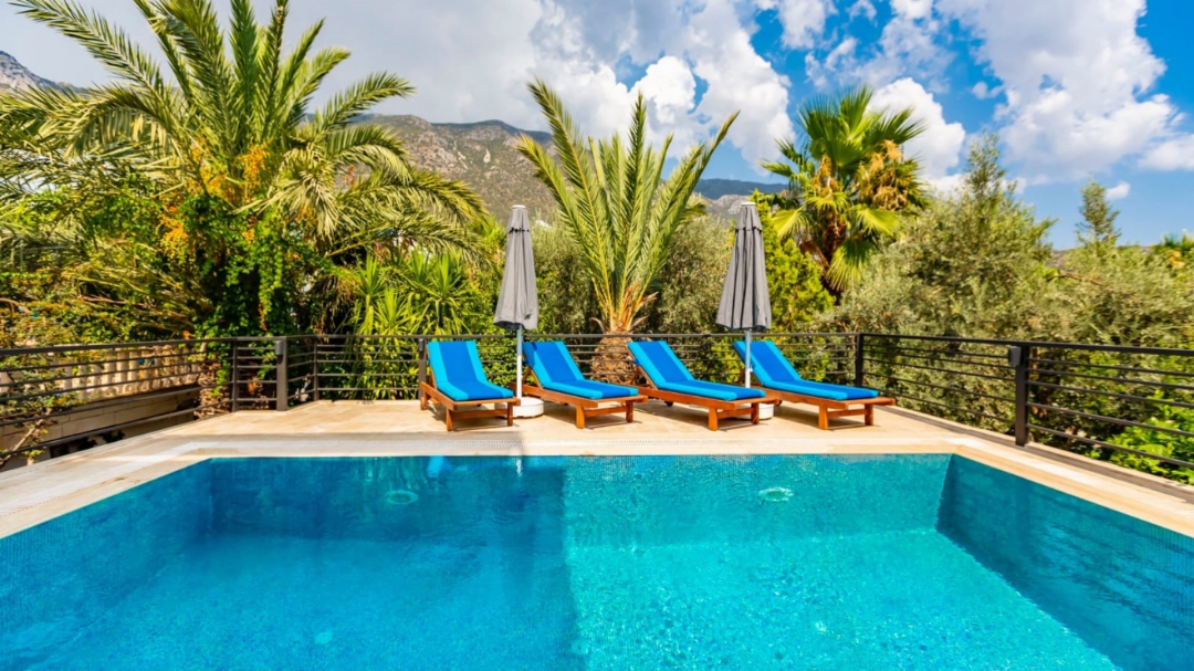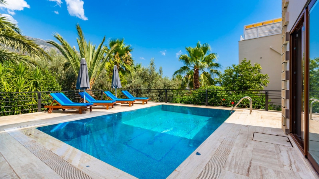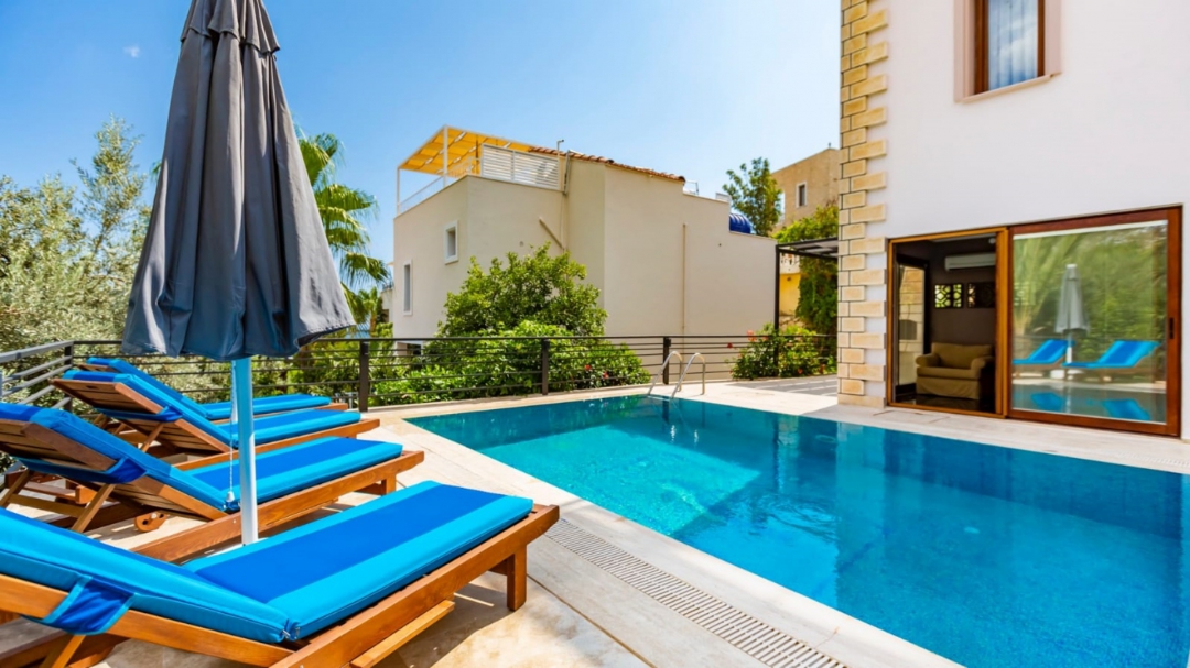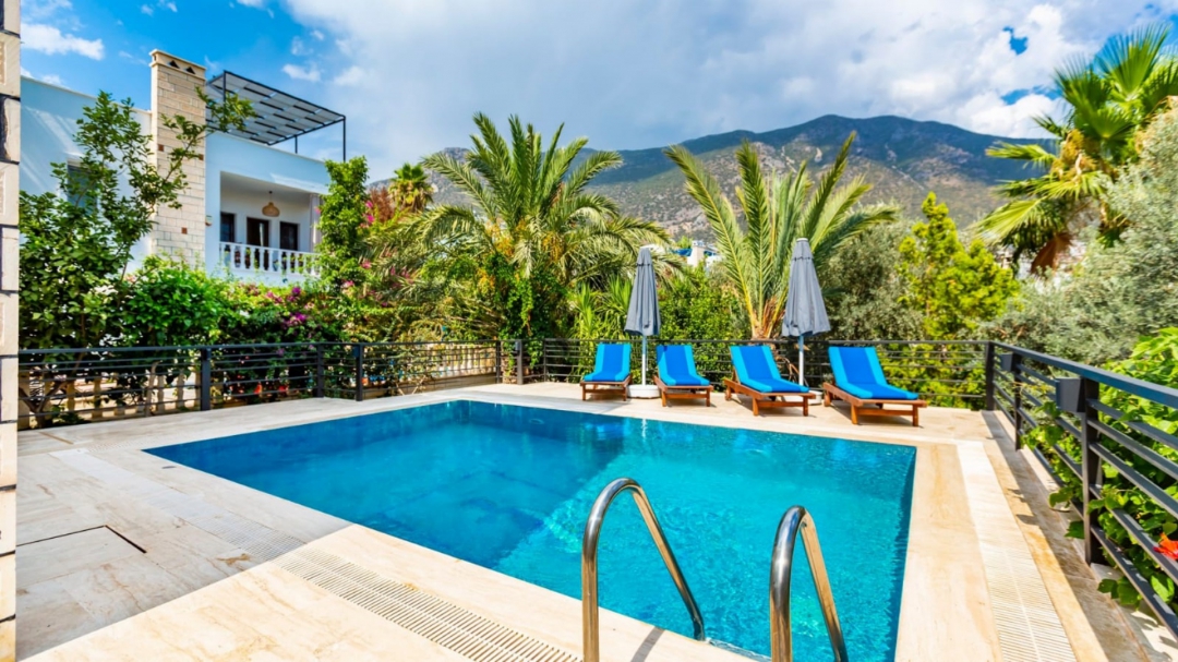 Located in a complex in Kalkan - Ortaalan, the villa for rent with private pool is an option with a capacity of four people. It is very easy to reach the center. On the ground floor of the two-storey building, there is a pool terrace, living room, kitchen and a very enjoyable reading section.