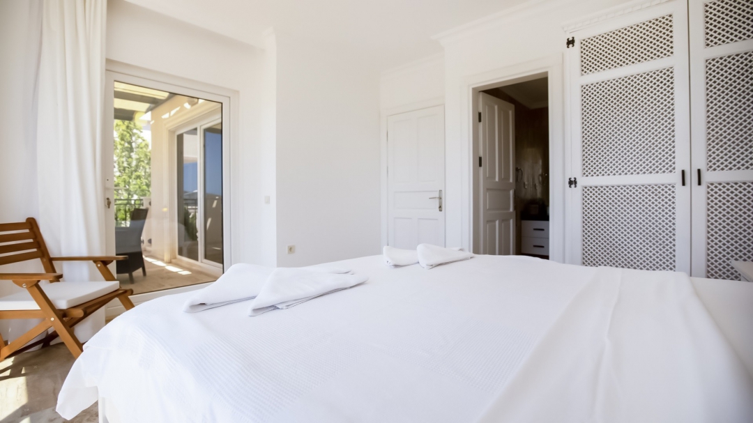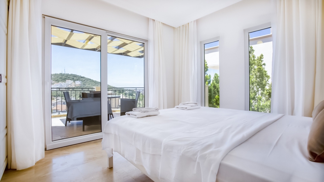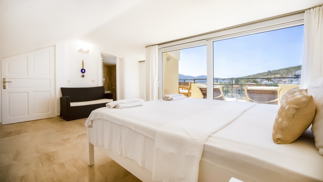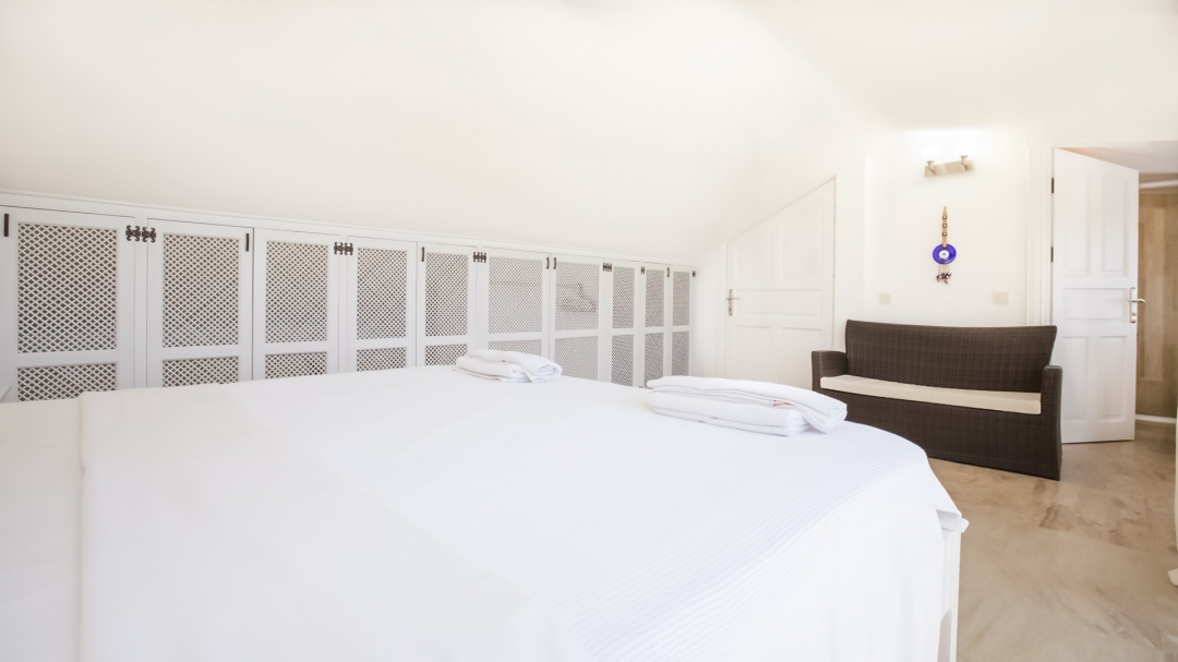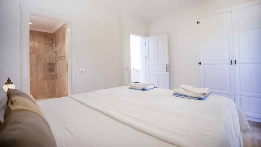 On the first floor there are three bedrooms (x2 doubles and a twin) and two shower / wet rooms, one of which is ensuite to the main / Master bedroom. The other two bedrooms have use of a family shower room on this level. Each bedroom on this floor has balcony space; the Master bedroom opens out on to a spacious terrace style balcony that has panoramic views over Kalamar Bay and Mouse + Snake Islands (this balcony is also shared with the adjacent bedroom, the other double, on this floor).