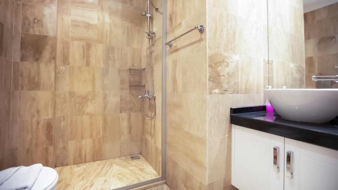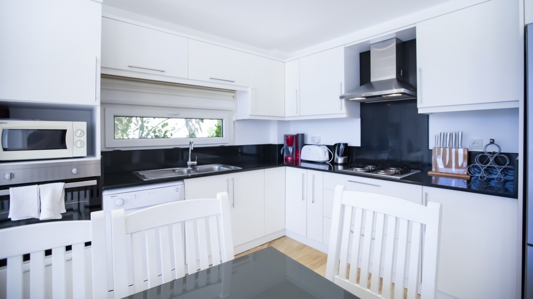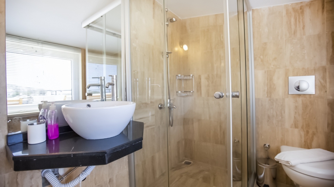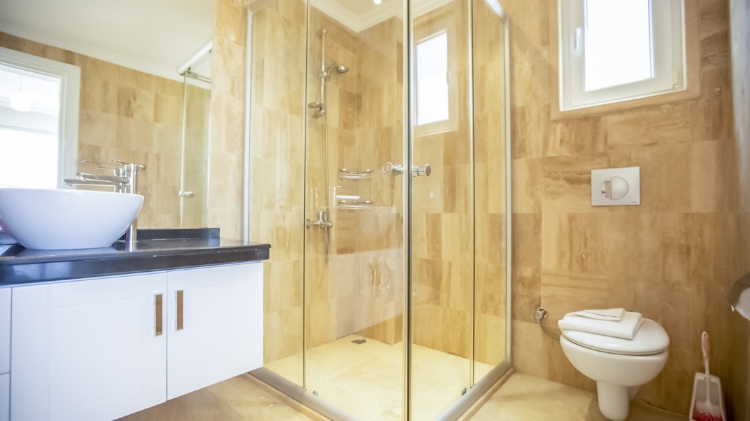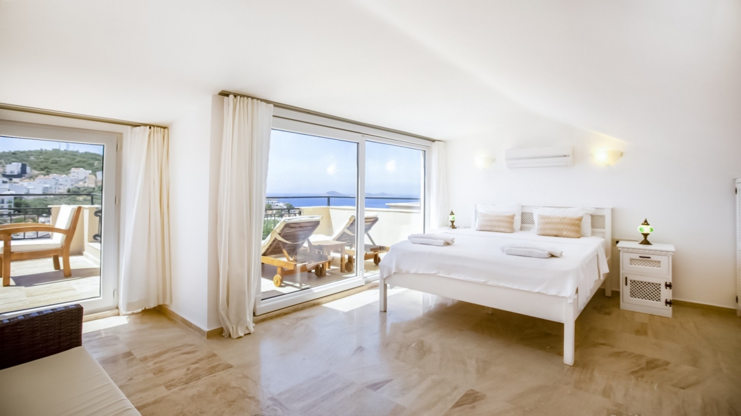 On the first floor there are three bedrooms (x2 doubles and a twin) and two shower / wet rooms, one of which is ensuite to the main / Master bedroom. The other two bedrooms have use of a family shower room on this level. Each bedroom on this floor has balcony space; the Master bedroom opens out on to a spacious terrace style balcony that has panoramic views over Kalamar Bay and Mouse + Snake Islands (this balcony is also shared with the adjacent bedroom, the other double, on this floor).