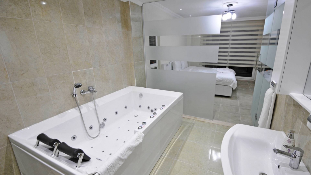 Living Room: Sea view, terrace type balcony, pool side exit, LED illumination, two stage and remote controlled chandelier lighting, İstikbal brand modern seating group, bar chair, Samsung brand 32 inch (102 screen) 3D led-smarttv, Samsung brand blue -ray DVD player, 2-dish satellite receiver, wireless internet (TTNET), WC + bathroom.