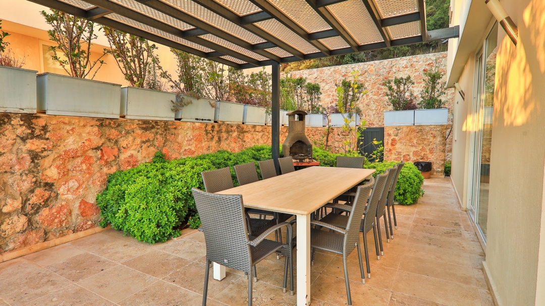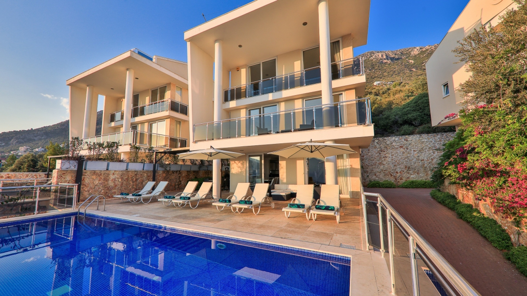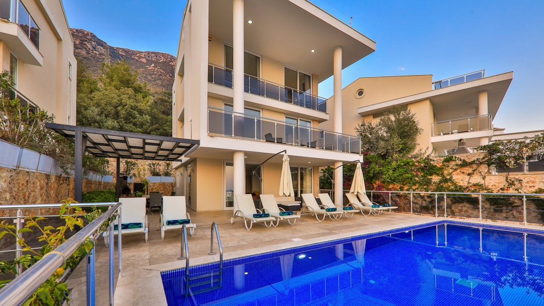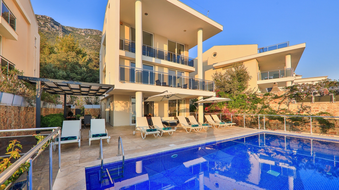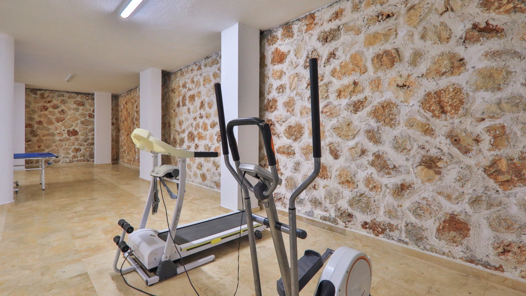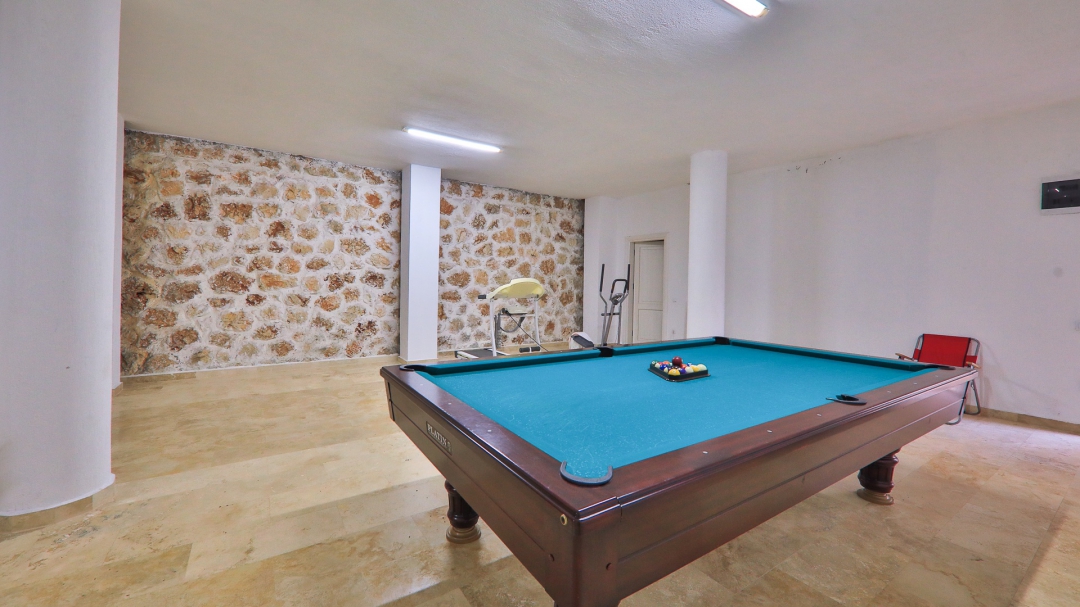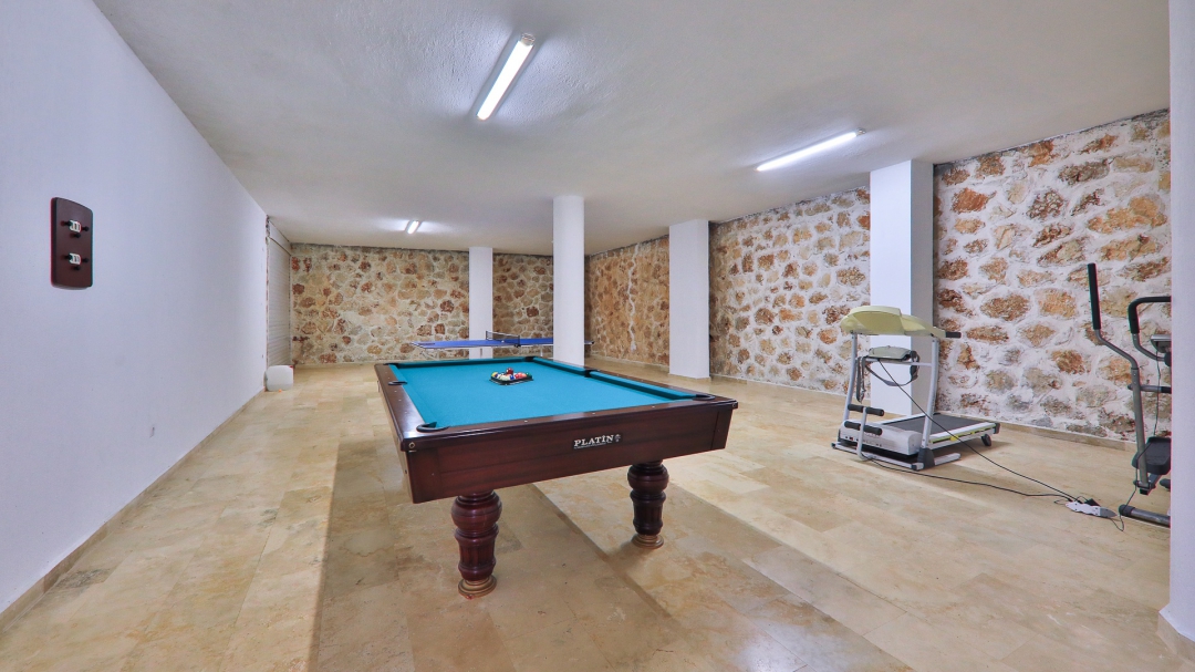 Consisting of four floors, the villa is an option with sea views. It has 5 bedrooms. When rented together with the villa with the code ABI6230, it provides a capacity of 20 people. It is located in the Kızıltaş area of Kalkan. Access to the center is easy. In the section under the pool floor, there are equipment such as treadmill, table tennis and billiards. On the ground floor, there is the pool terrace, the living room and the kitchen. Rooms are located on the upper floors.