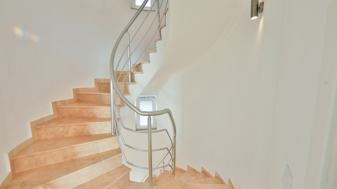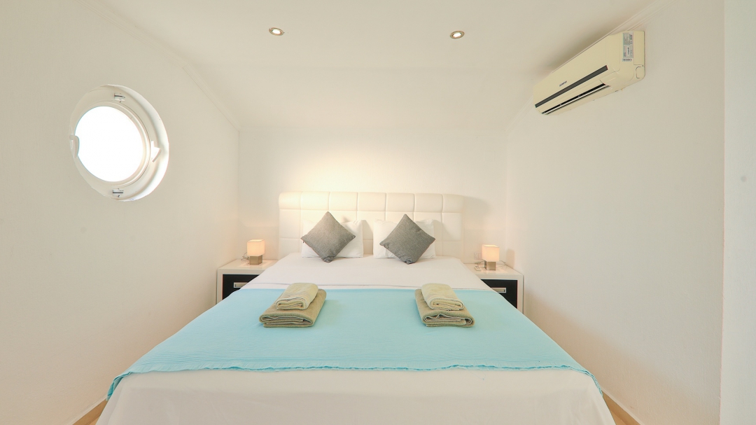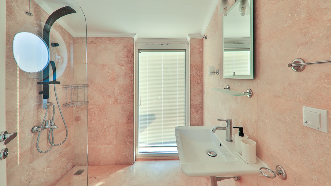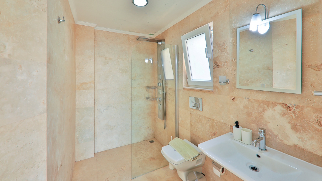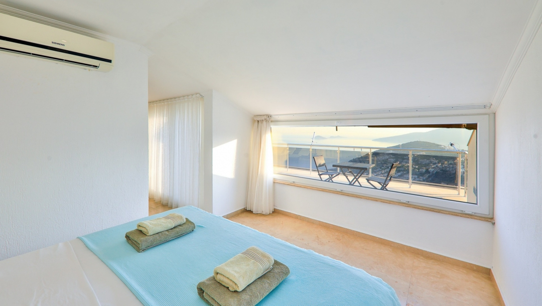 The last bedroom is in the attic. It is an en suite room with a double bed. The terrace in front of this room is the last part of the villa. This terrace has two sun loungers and a dining table for two.