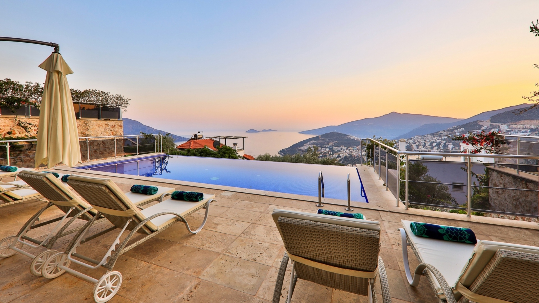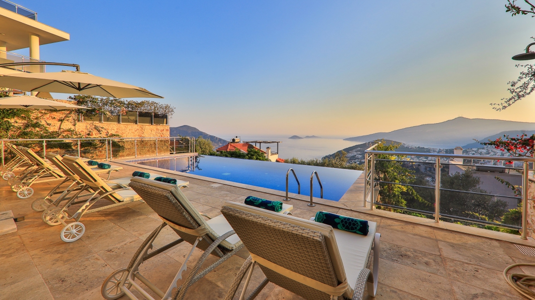 The pool has an infinity edge. There is a dining table and barbecue in a shaded area. Umbrellas, sun loungers and sitting group are the other equipment of the pool terrace. There is access to the lounge area from the pool area. The items that fill the indoor space on this floor are the living room set, the dining table, the kitchen with built-in appliances, the water dispenser, and the TV.